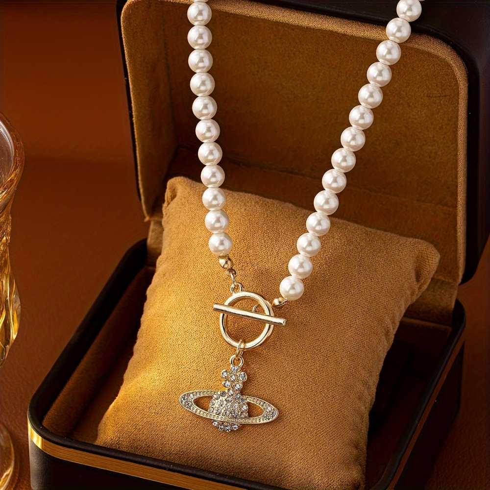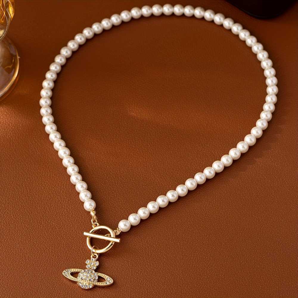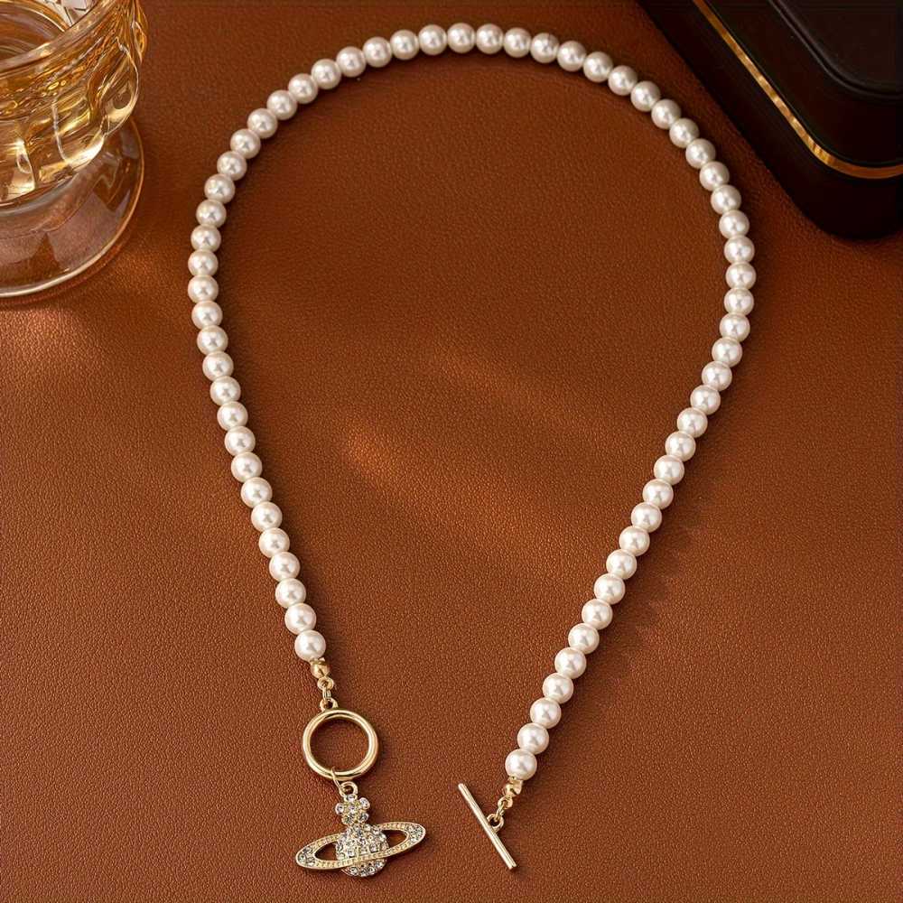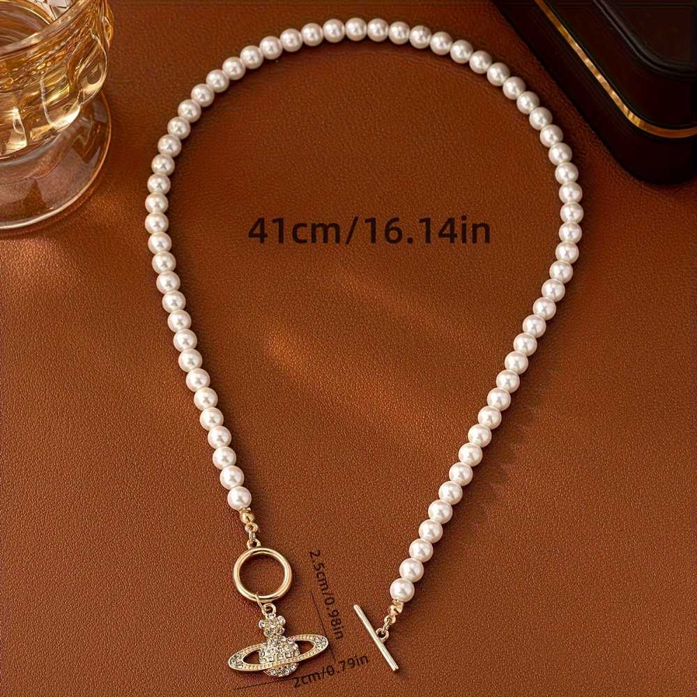 Elegant Faux Pearl Necklace with Flower and Rhinestone Planet Pendant.