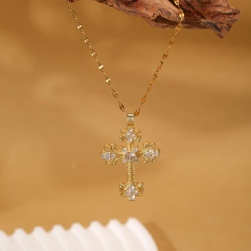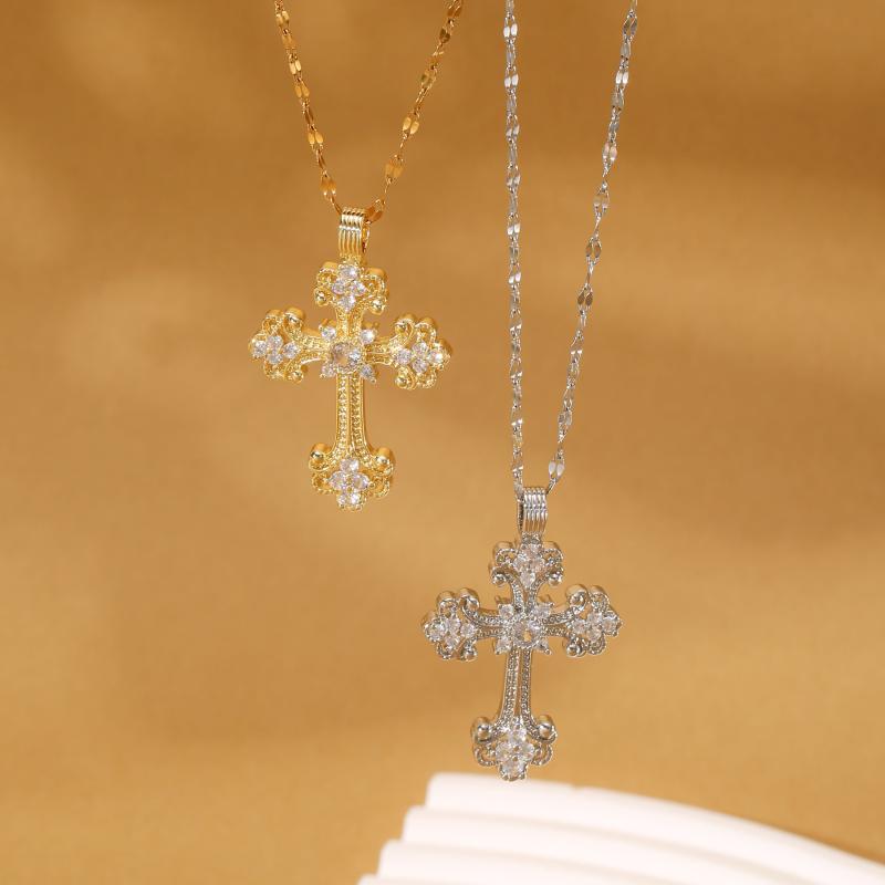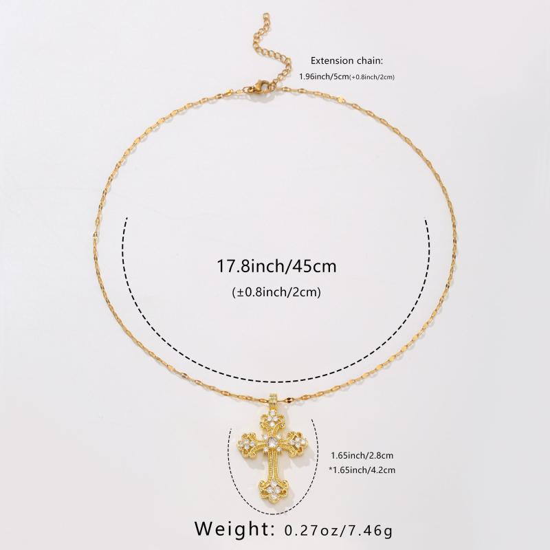 Enhance your style with this stunning vintage cross necklace featuring 4 cubic zirconia stones. The low allergy stainless steel chain is 45 inches long, making it perfect for parties and formal events.