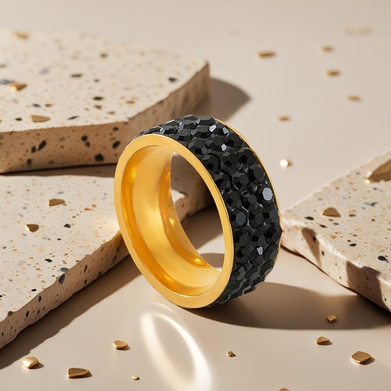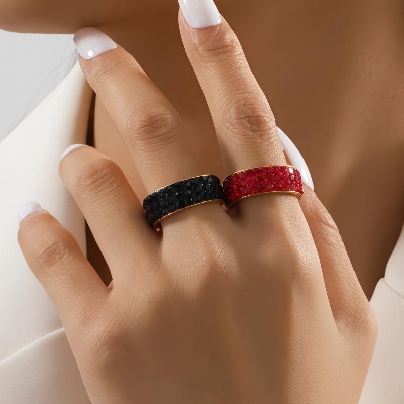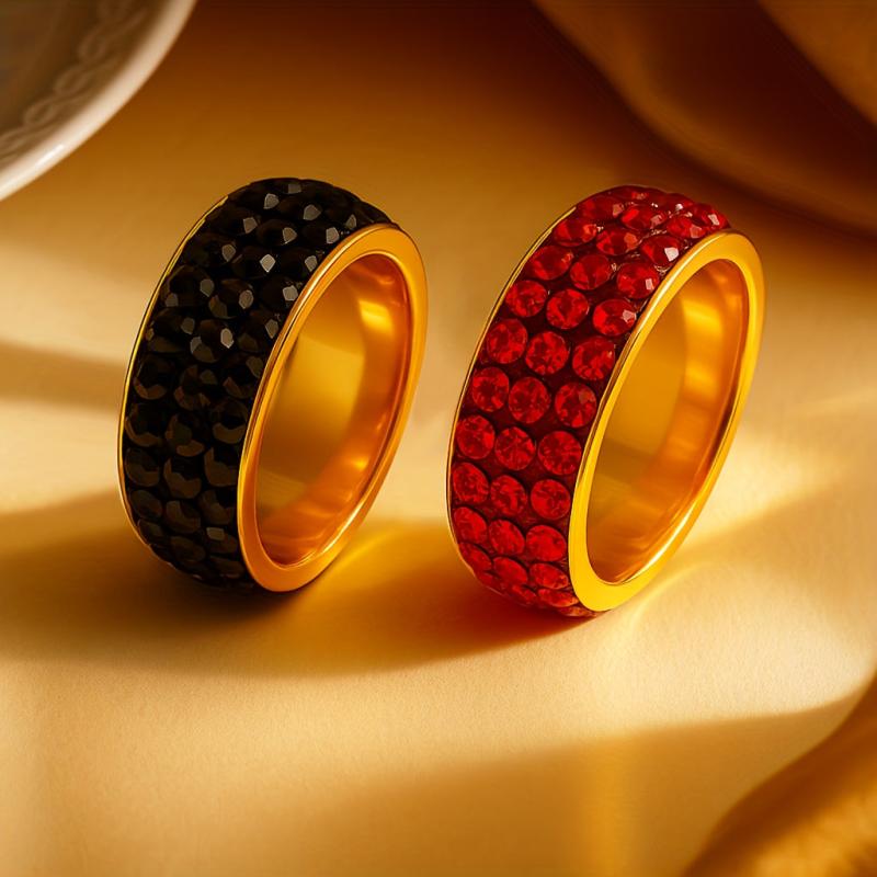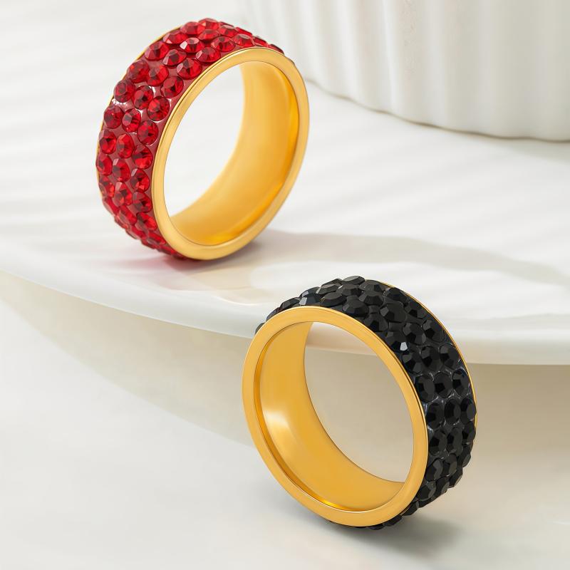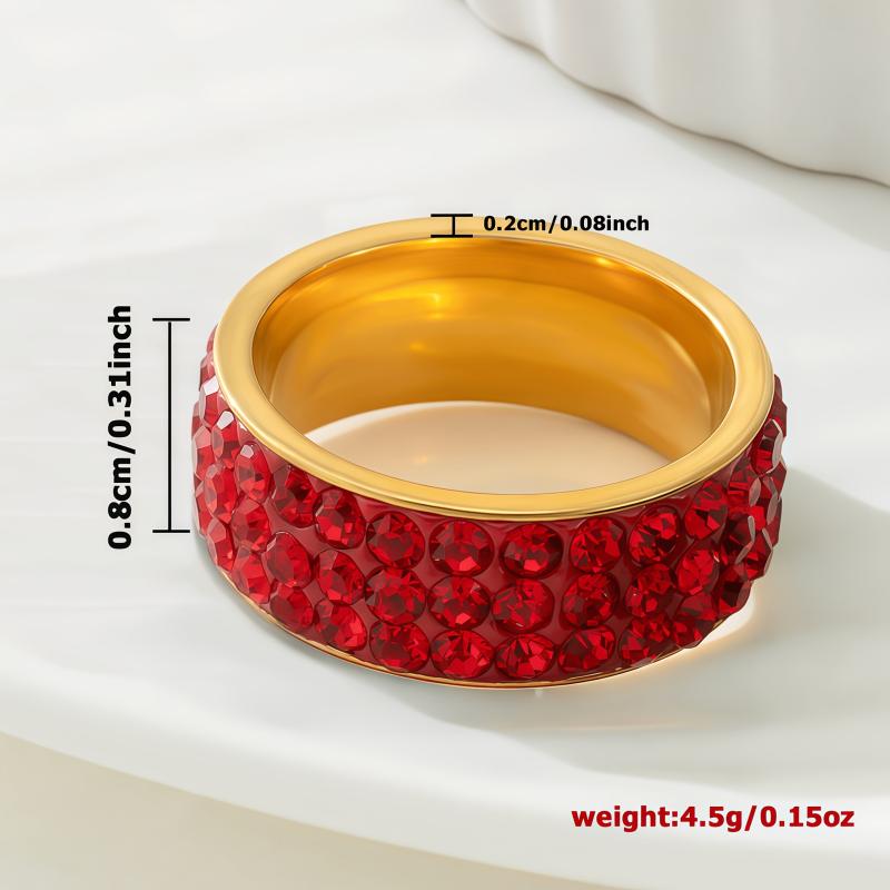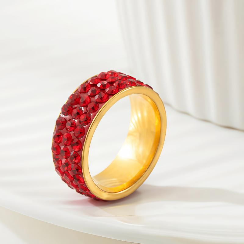 Elegant stainless steel ring with red rhinestones in a triple row design. Perfect for daily wear or as a wedding band, promising style and sophistication.