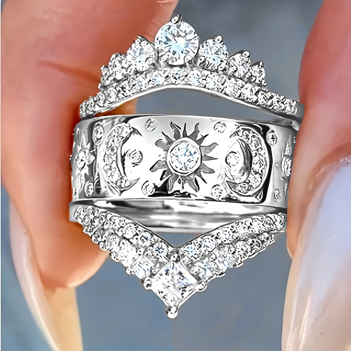 This stylish ring set features synthetic zircon stones set in 18K plated copper. Perfect for all seasons, it showcases a princess cut synthetic zirconia center stone.