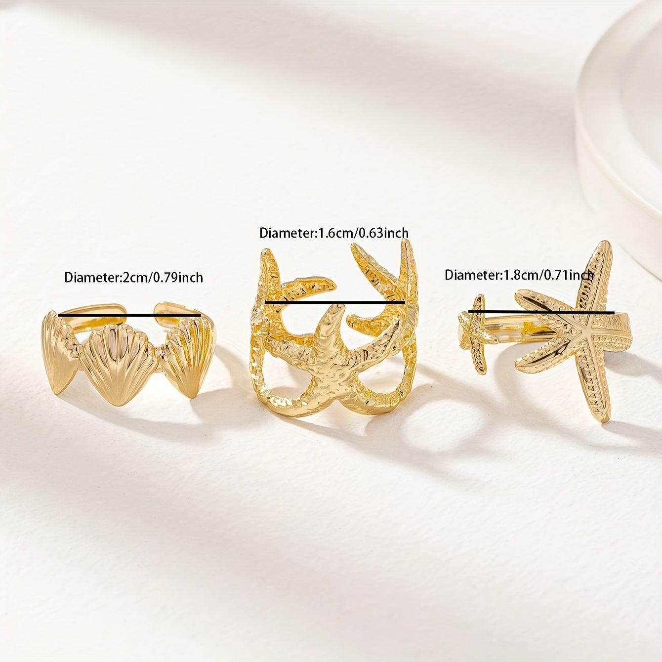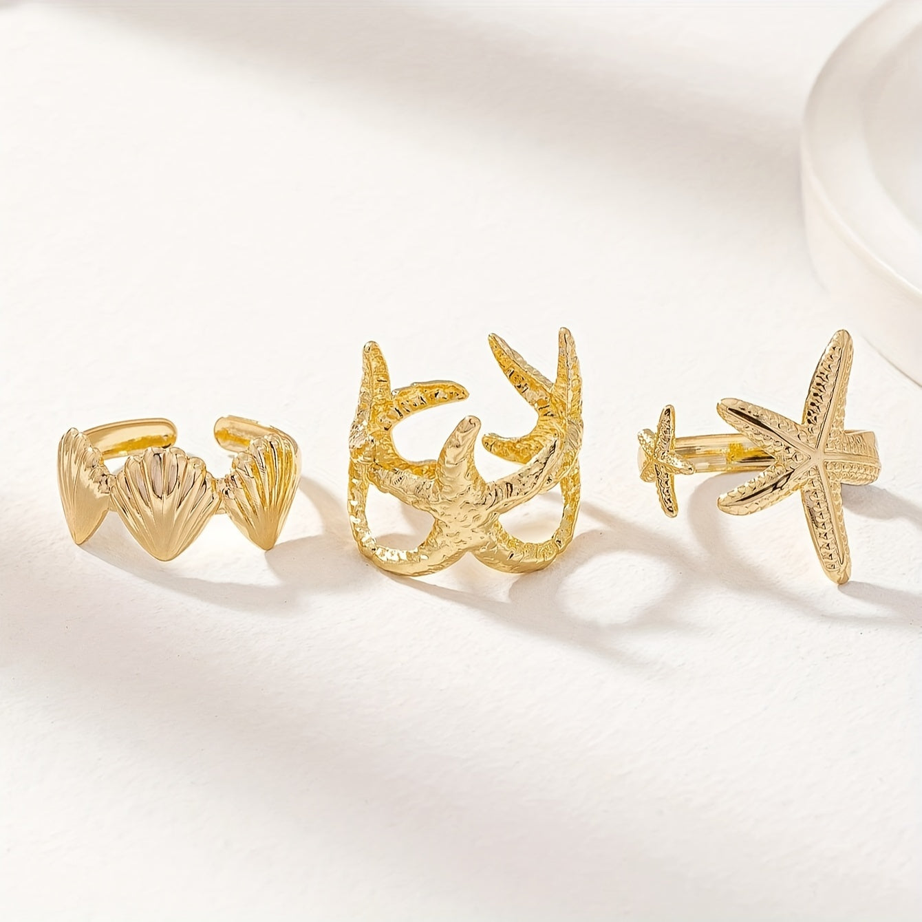 3pcs Ocean Series Starfish Shell Ring Set Adjustable Women's Jewelry Gift