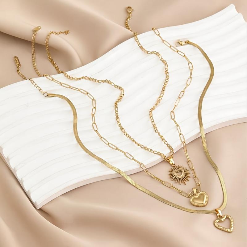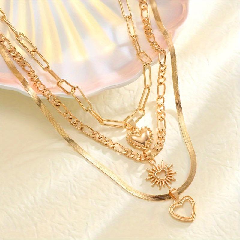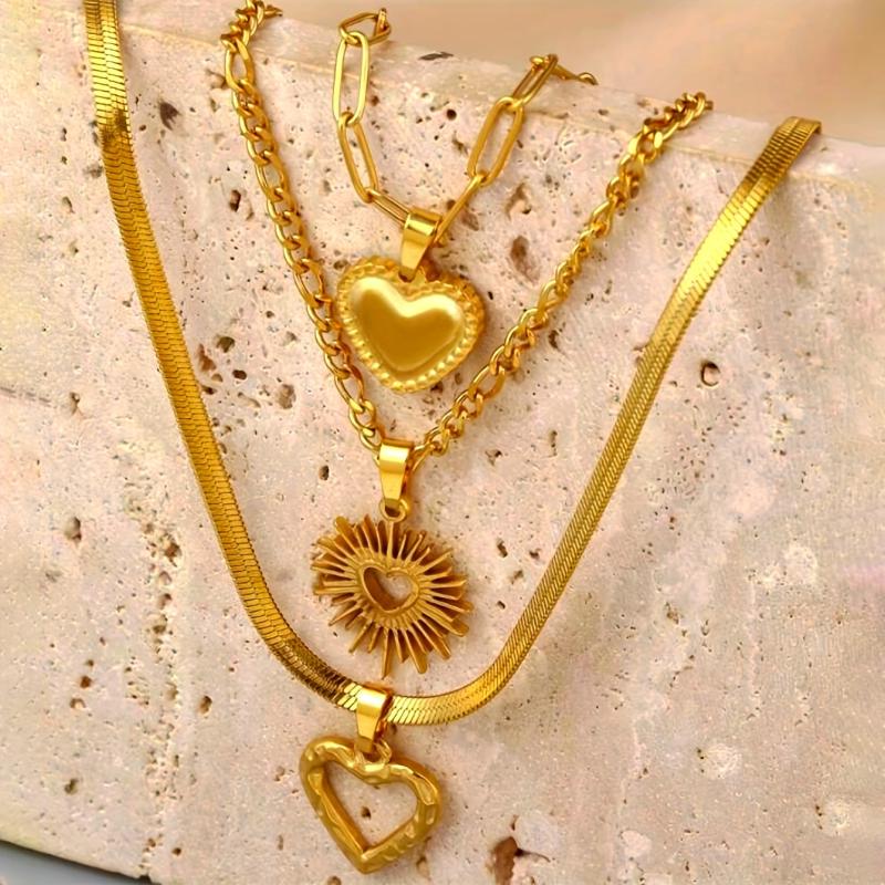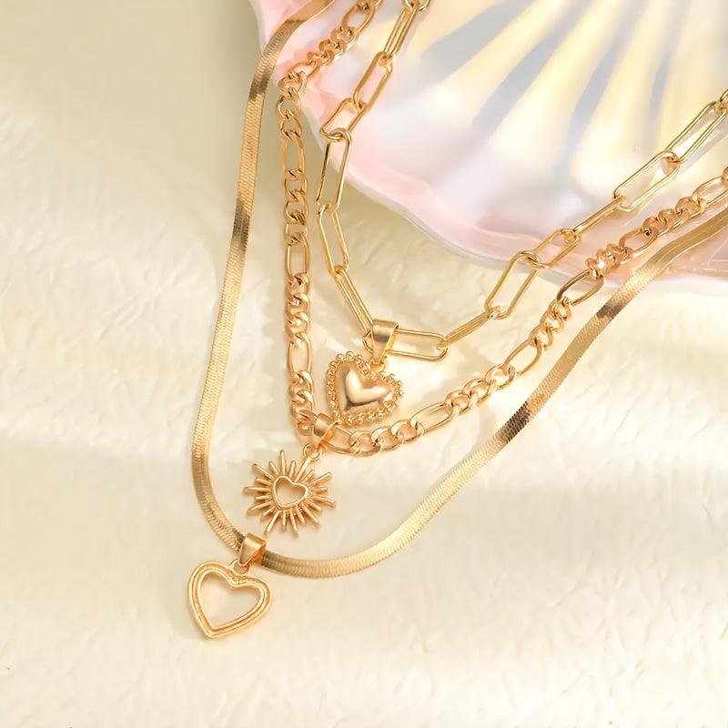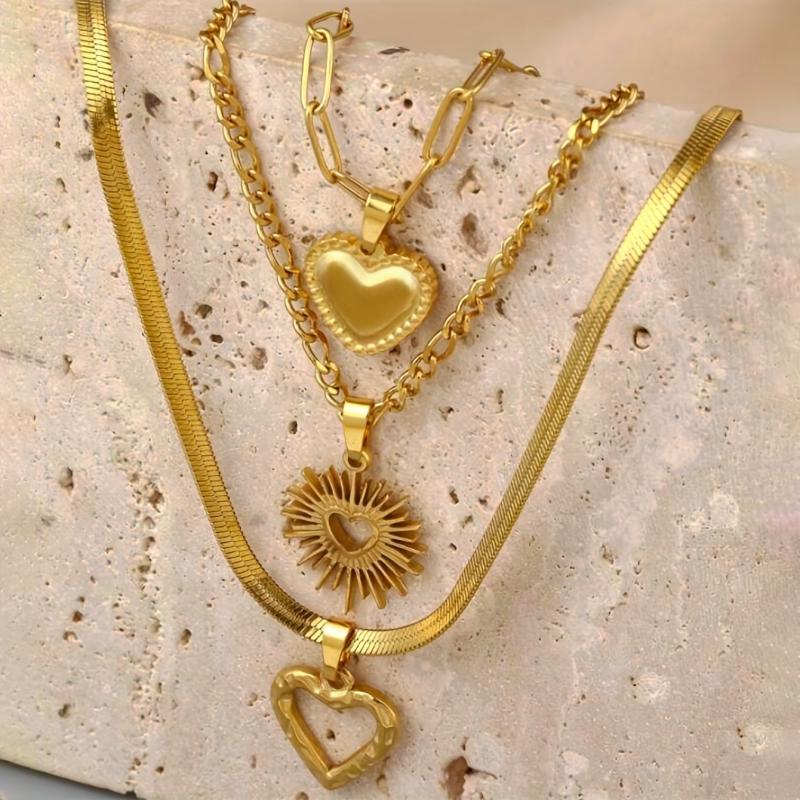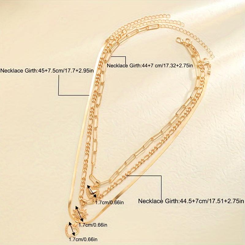 3pcs Vintage Heart Pendant Necklace Set Copper Layer Hip Hop Choker