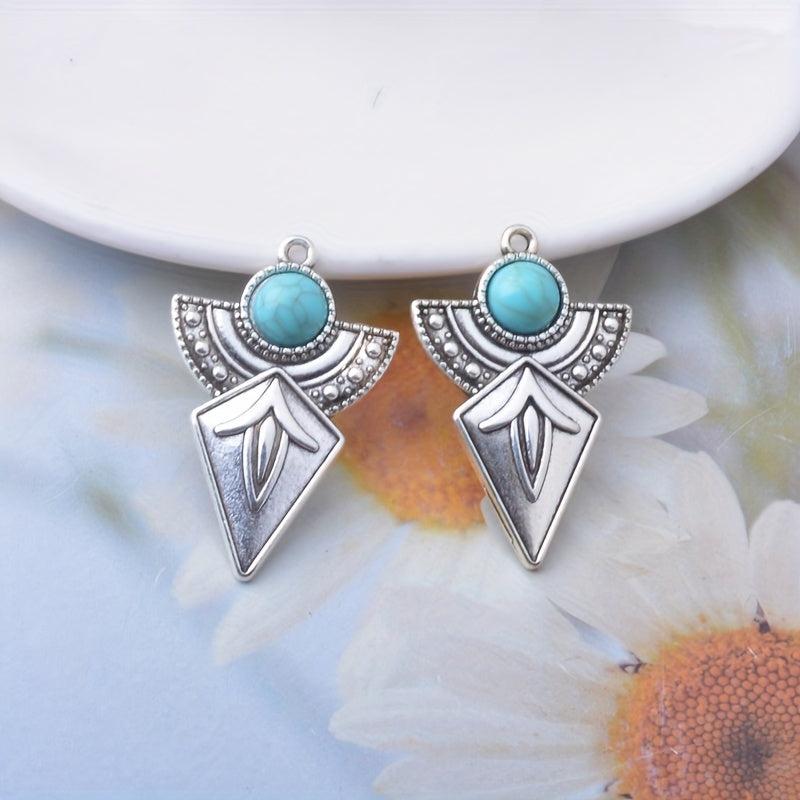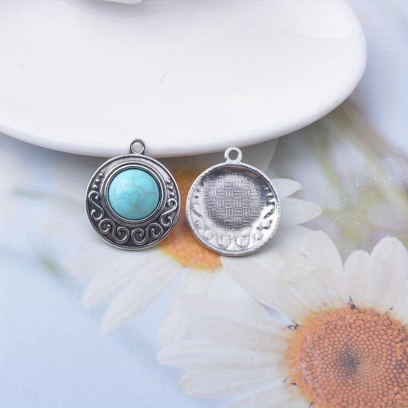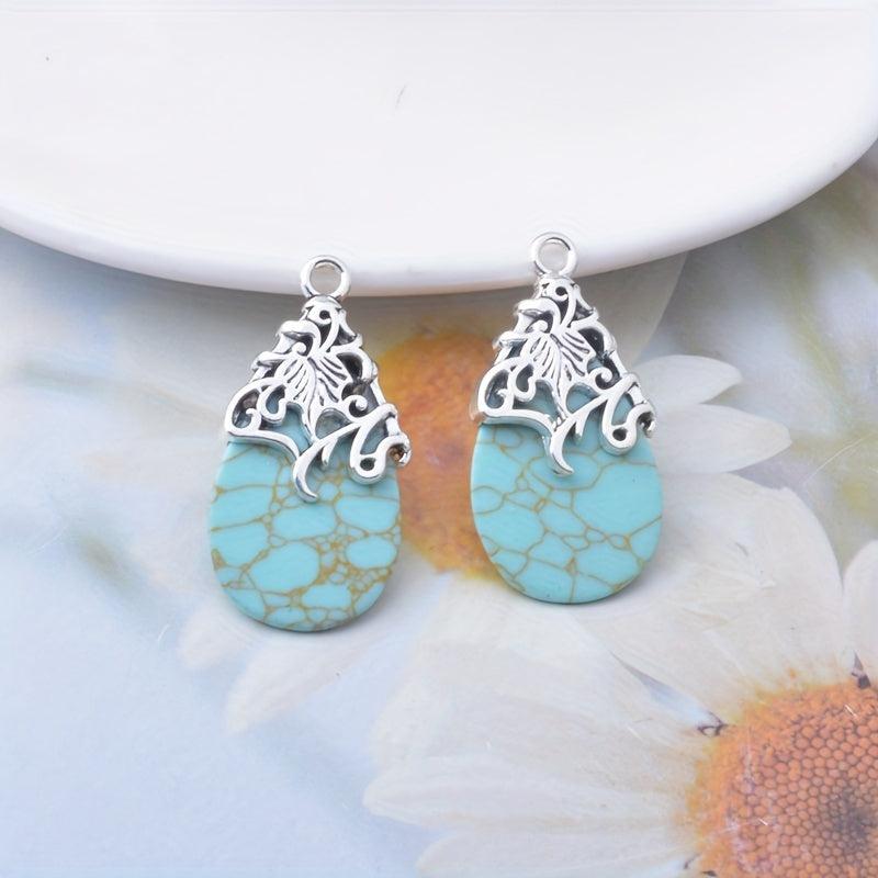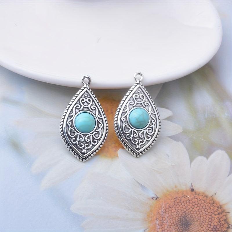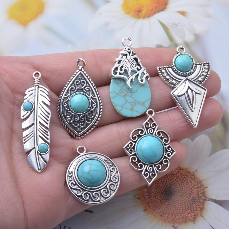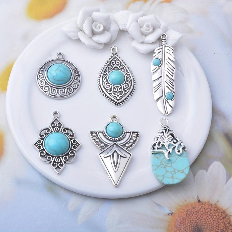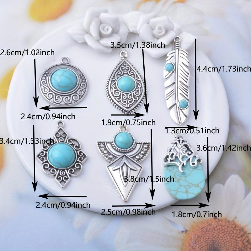 This set includes 6 zinc alloy turquoise round drop feather charms, perfect for jewelry making and craft projects. Add a bohemian touch to your accessories with these vintage inspired pendants.