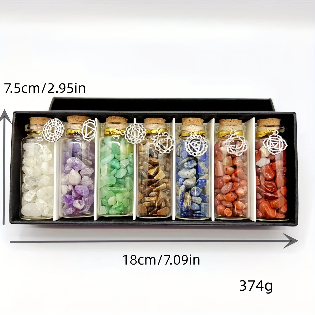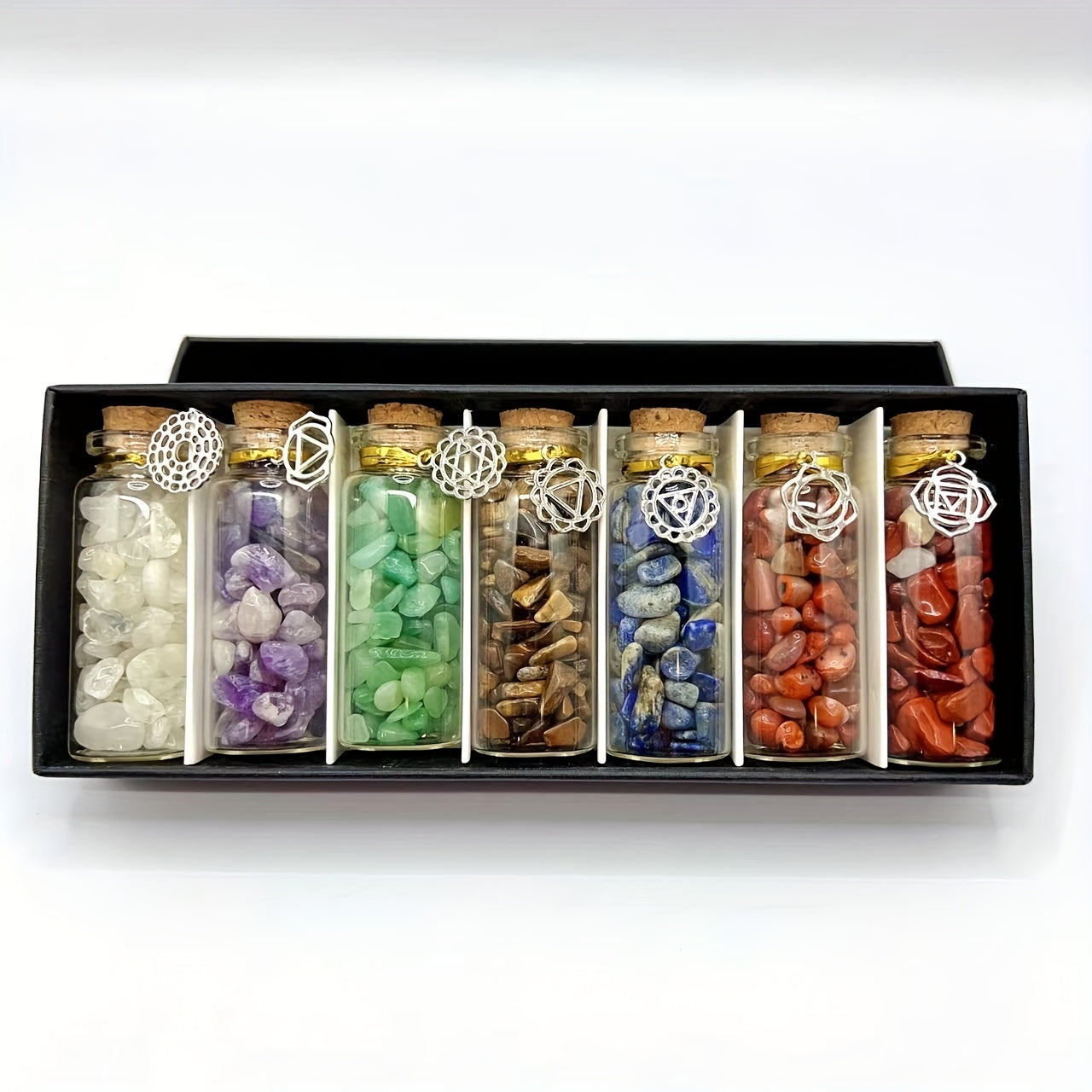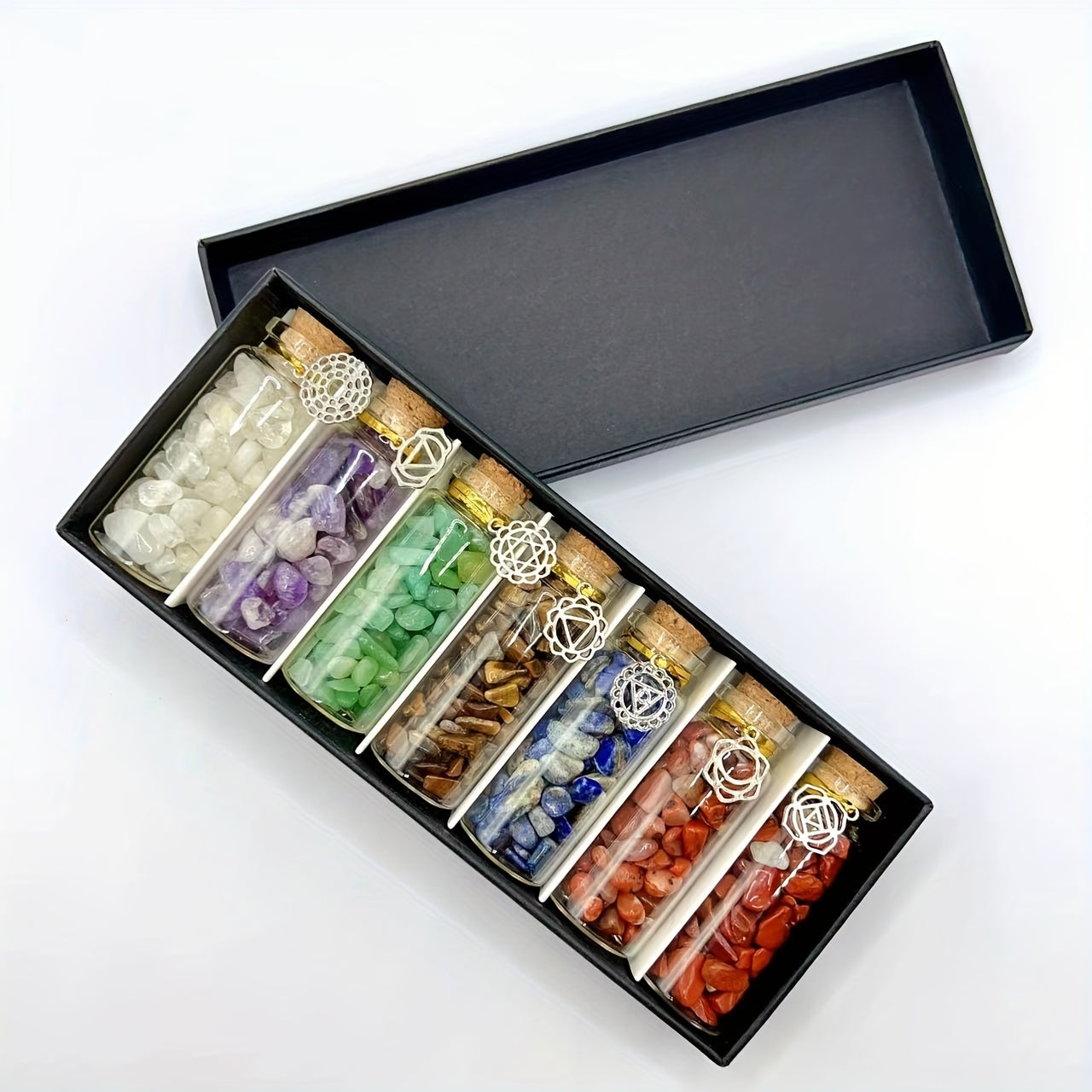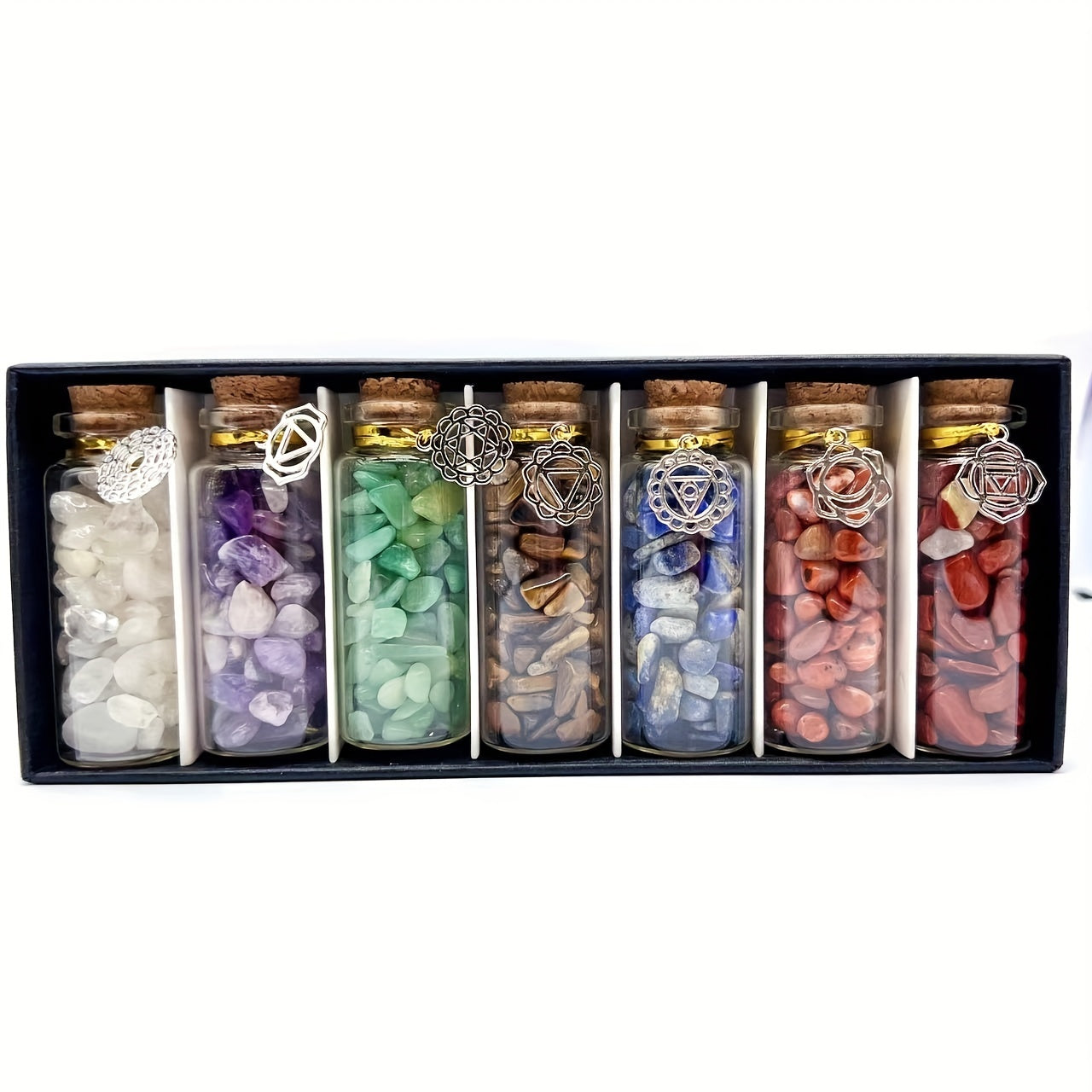 This set includes a collection of 7 crystal stones in a crystal bottle. The stones include Natural Quartz, Amethyst, and Tiger Eye's. Perfect for gifting to family and friends.