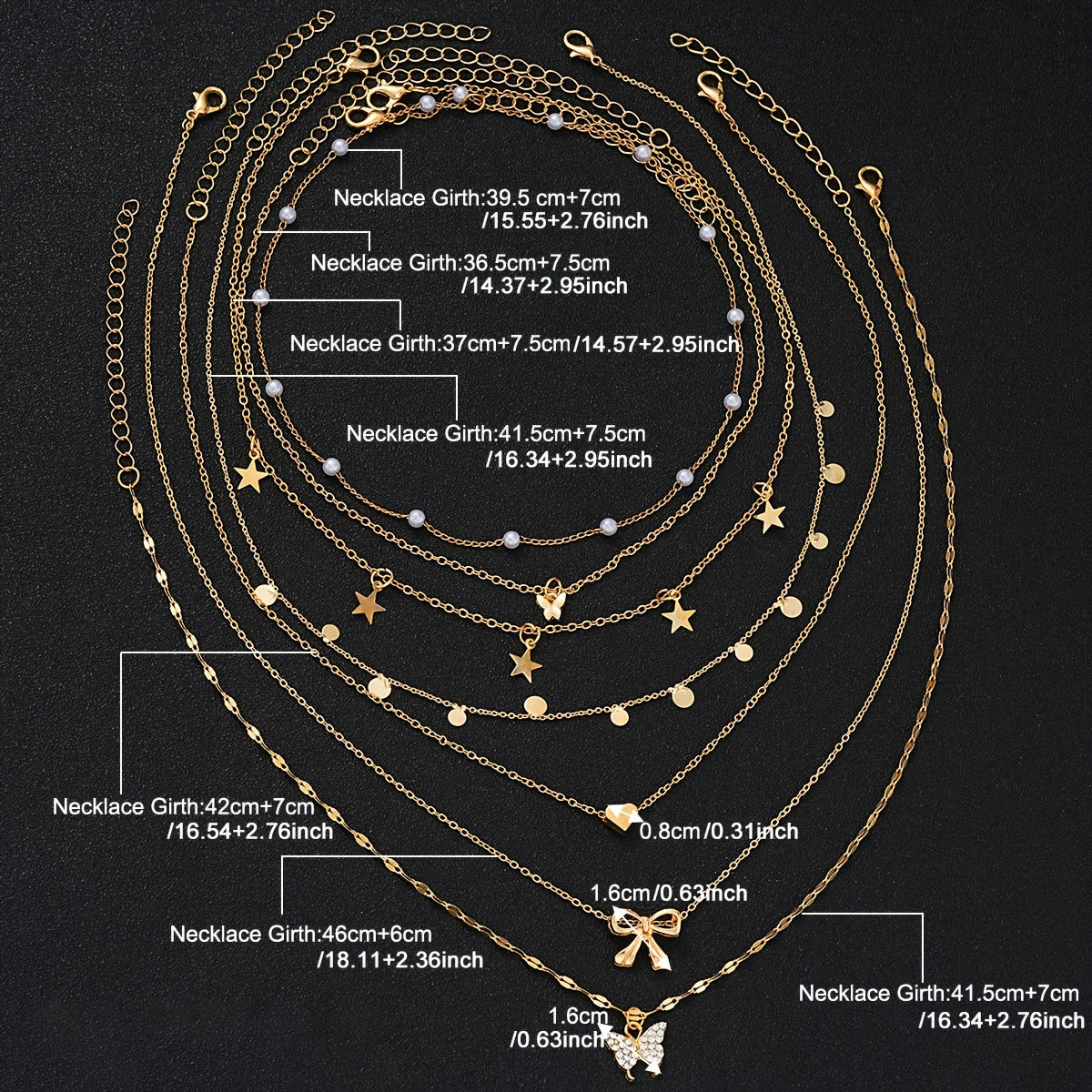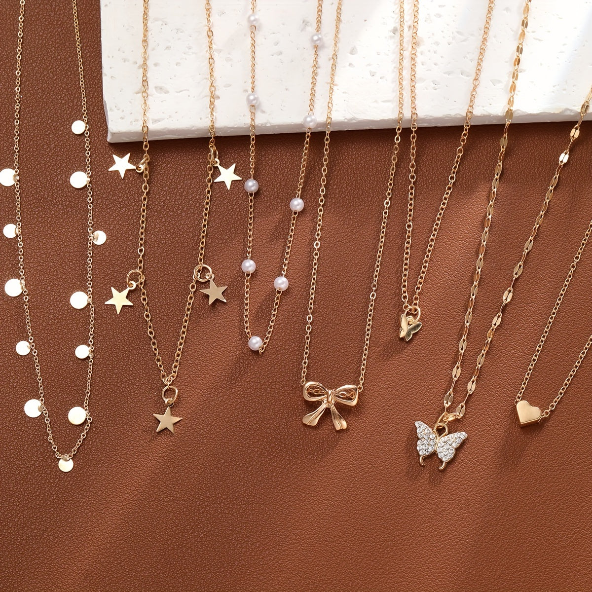 This 7-piece necklace set features beautiful designs like butterfly, heart, star, and bow with rhinestone and faux pearl accents. Perfect for daily wear or parties.