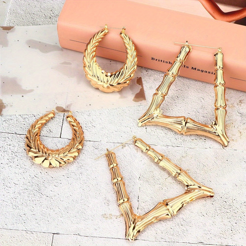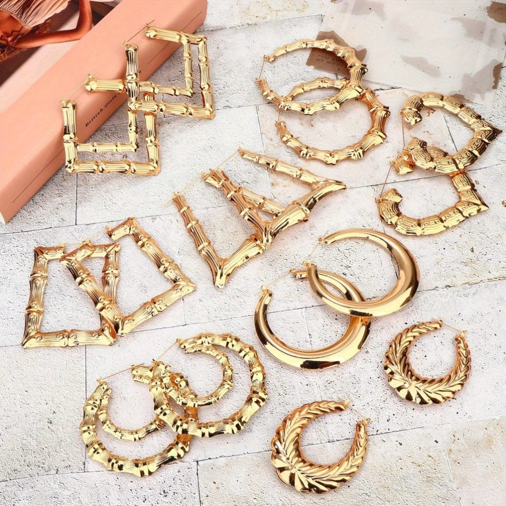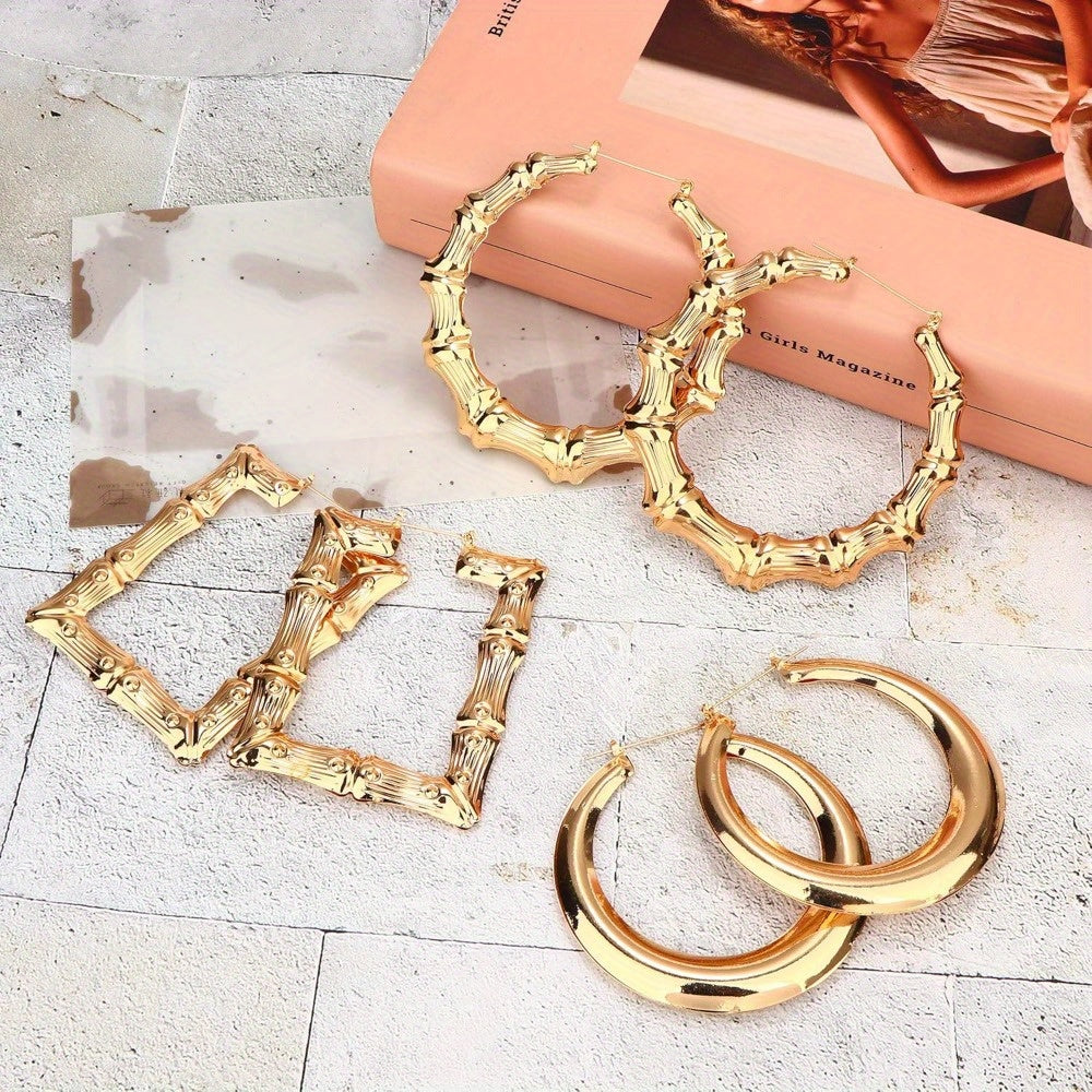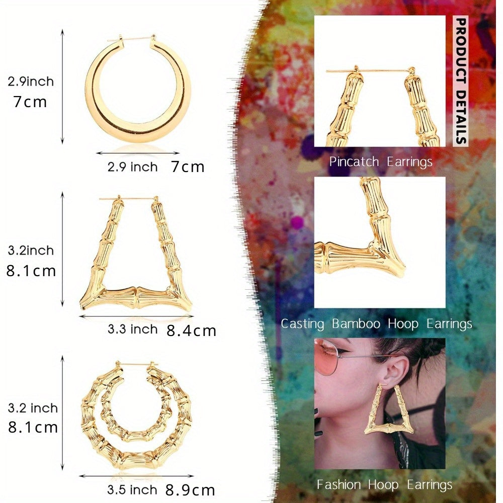 This set includes 8 pairs of large bamboo hoop earrings with chunky golden stainless steel studs. They feature a hip pop style with vintage and Arabian influences.