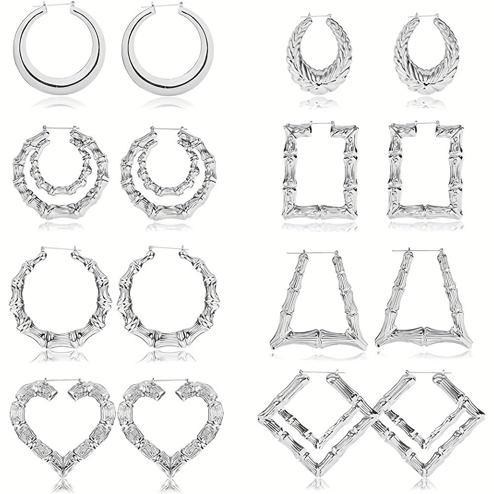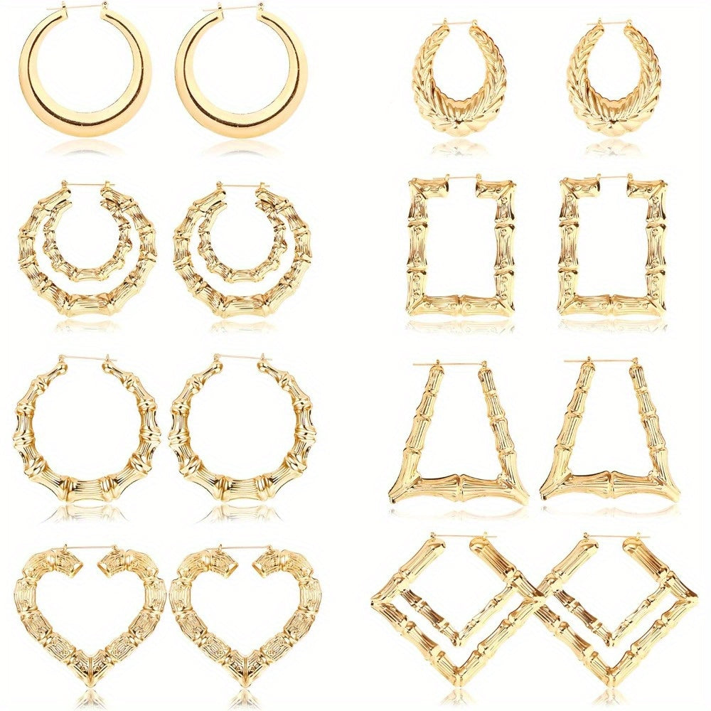 8 Pairs Bamboo Hoop Earrings Set Golden Studs Women's Hip Pop Vintage Alloy