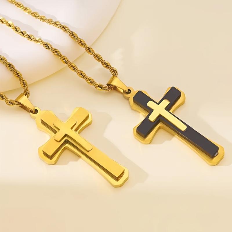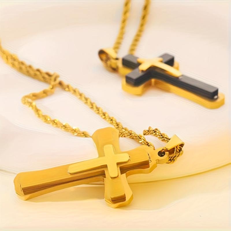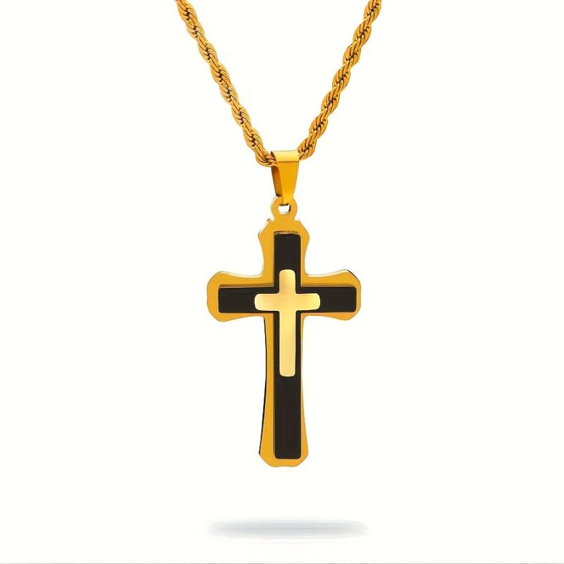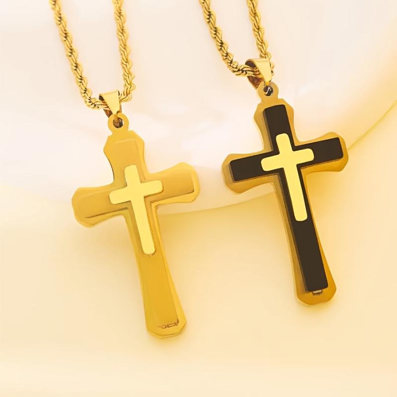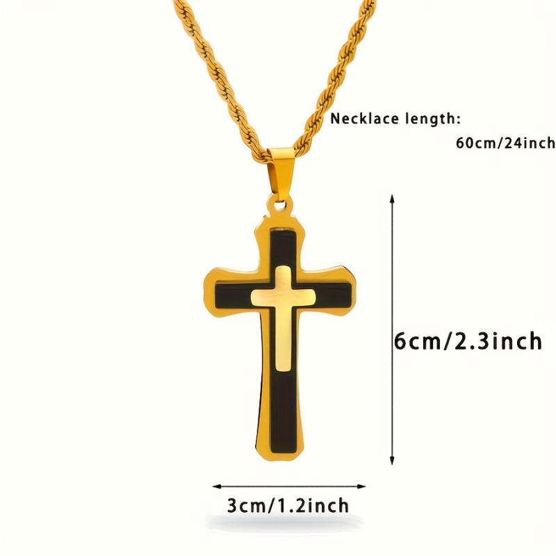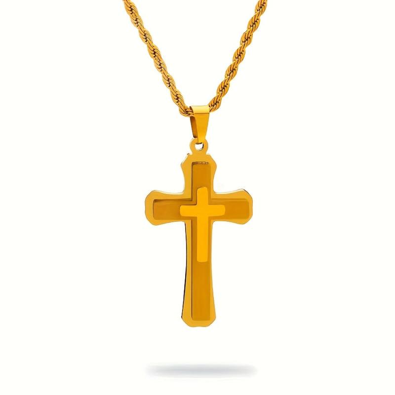This cross necklace is made of 925 sterling silver with a three-layer, three-dimensional design. The twisted chain adds a unique touch to the classic cross pendant. Perfect for both men and women, this necklace is 18K gold plated for a luxurious look.