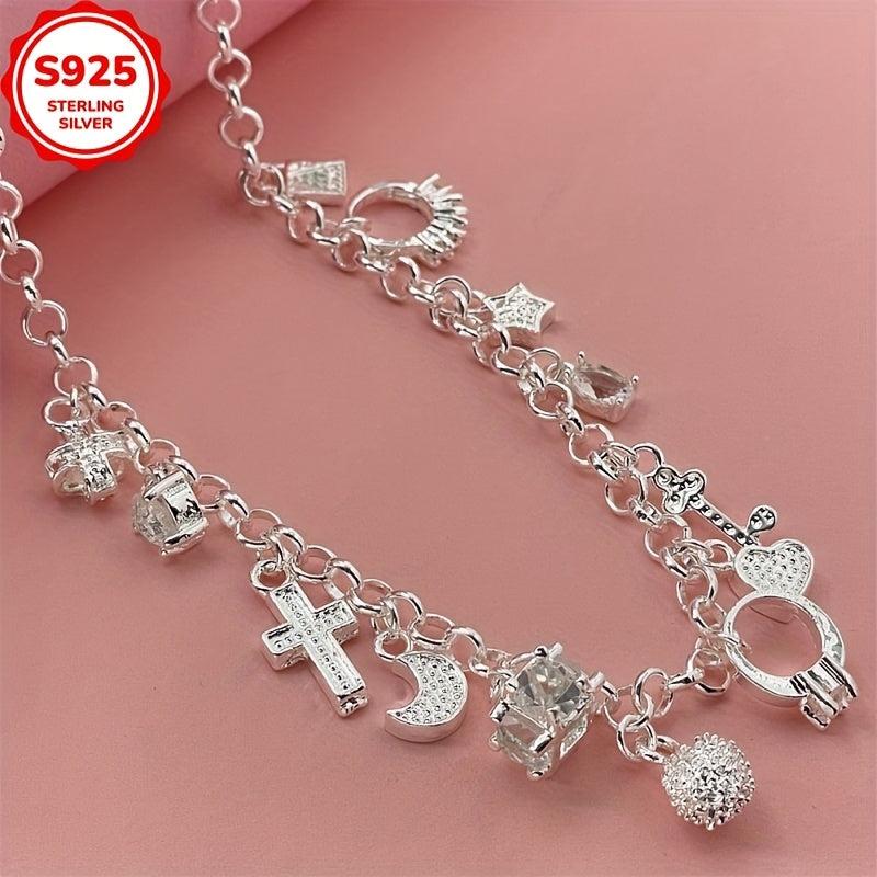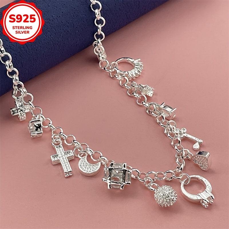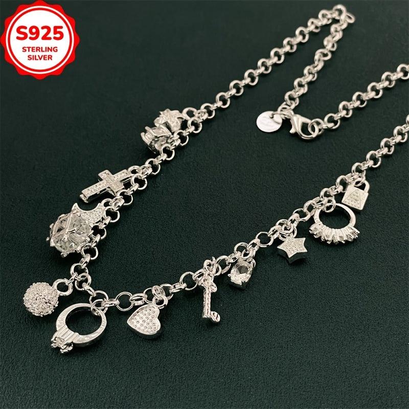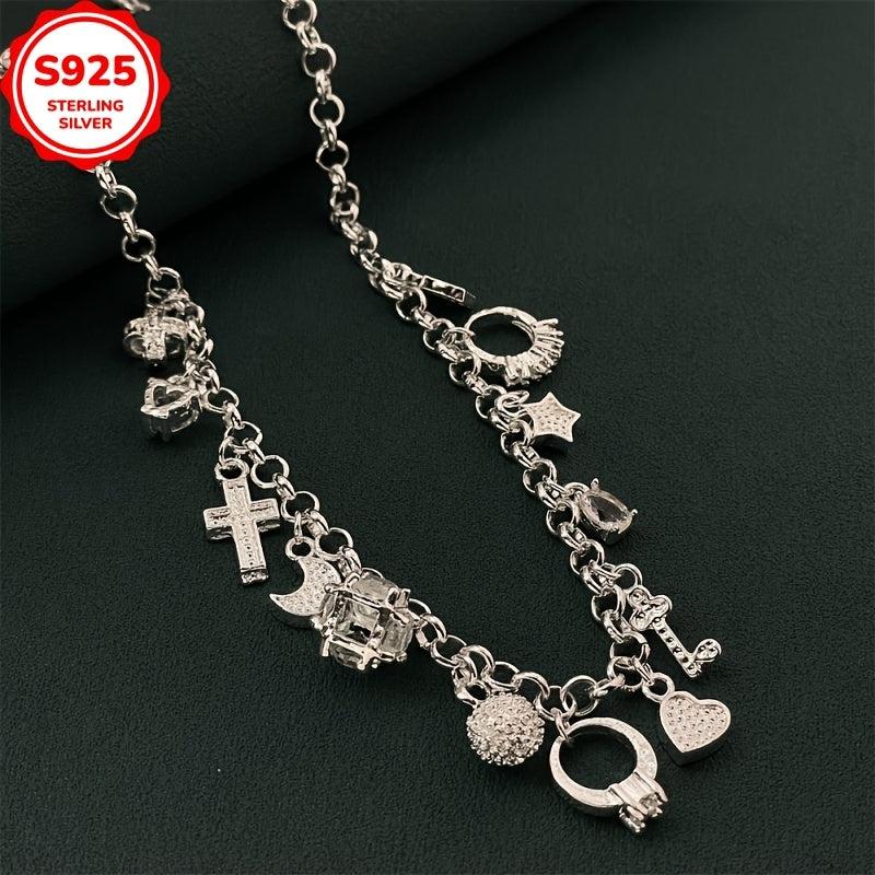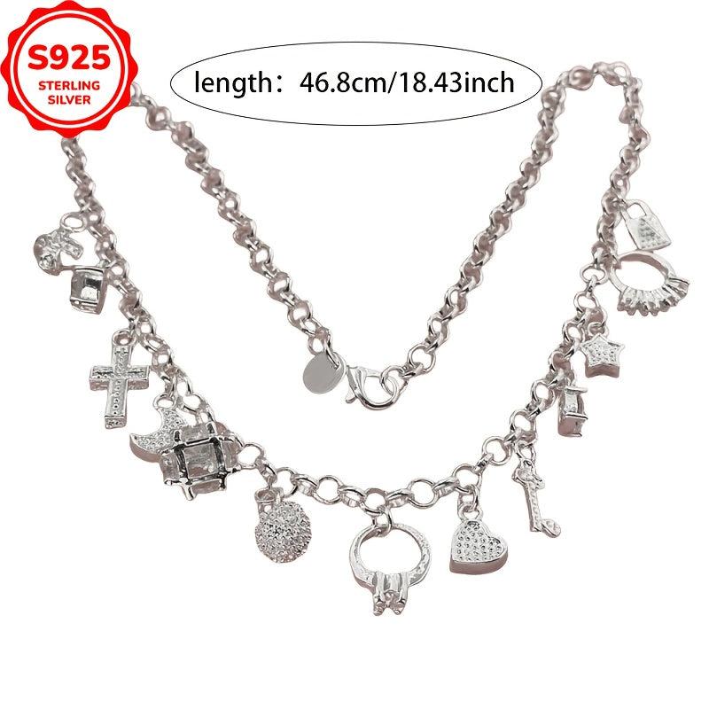 Add a hip hop style touch to your outfit with this 925 silver charm necklace. Features cross, star, key, and heart pendants. Allergy-free for comfortable wear.