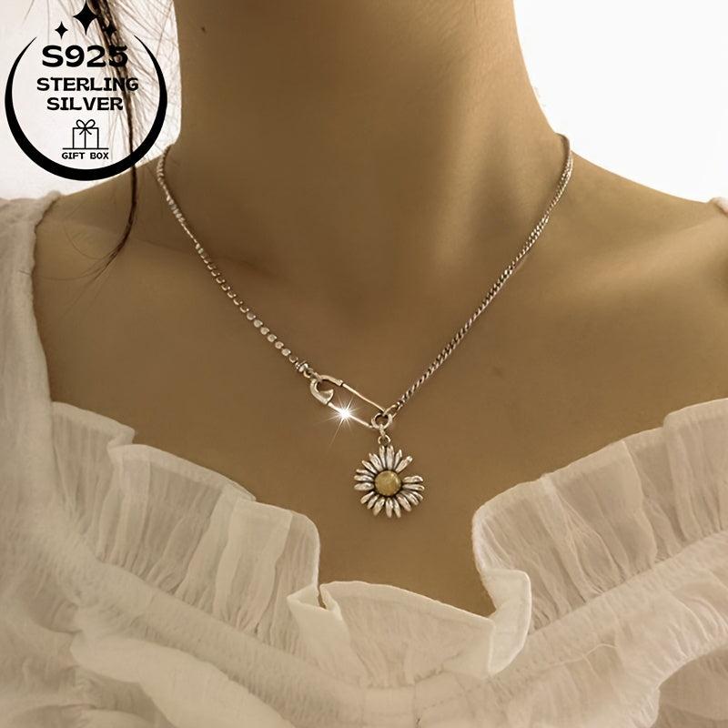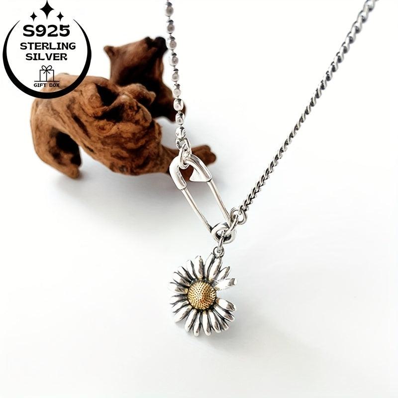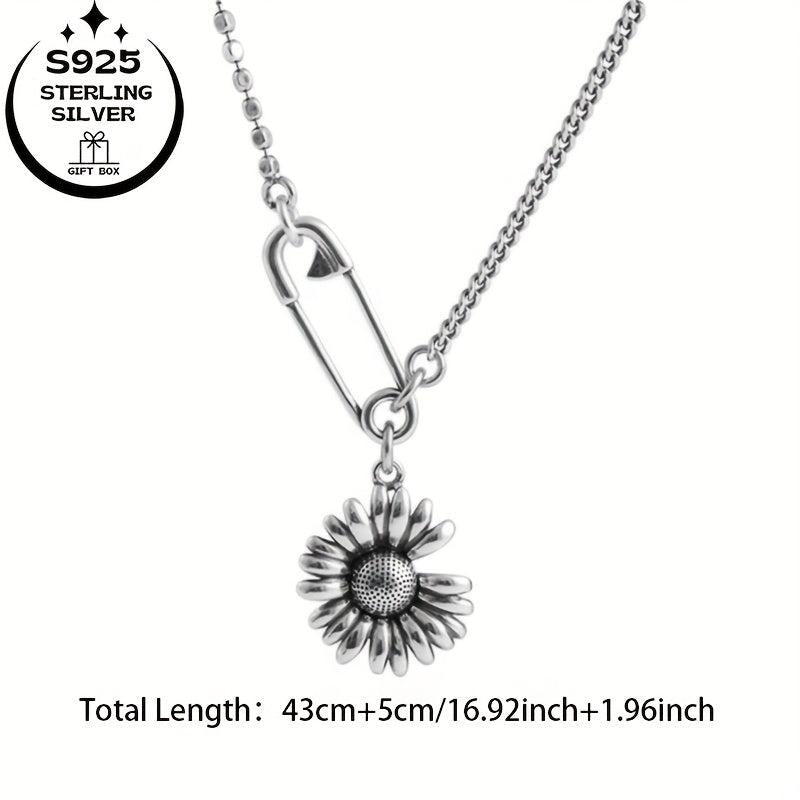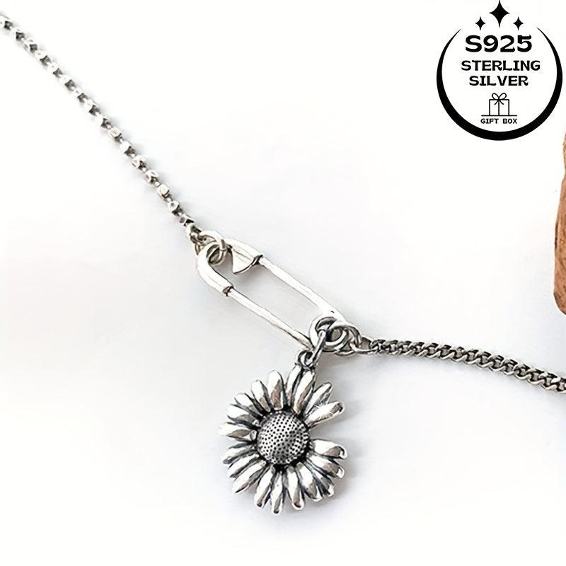 This delicate clavicle necklace features a vintage patina sunflower charm in 925 silver. Perfect for adding a touch of nature-inspired style to your outfit.