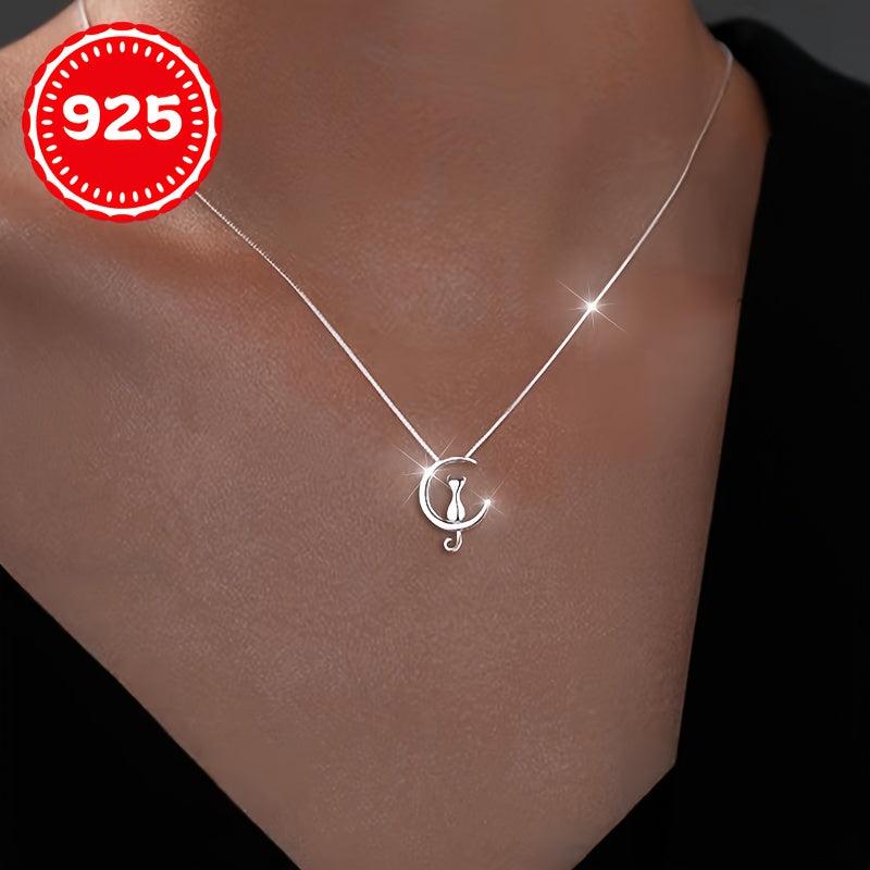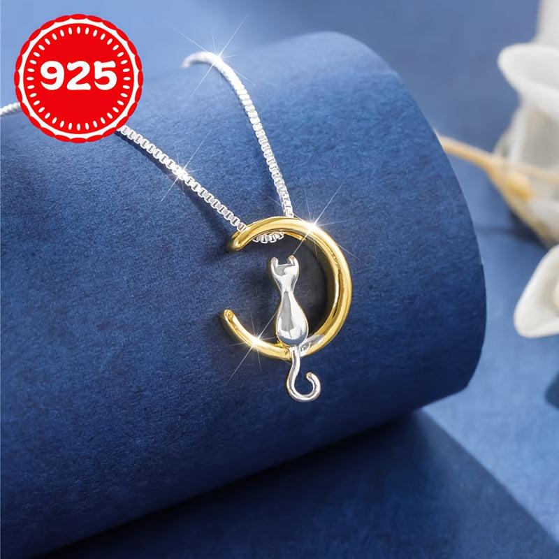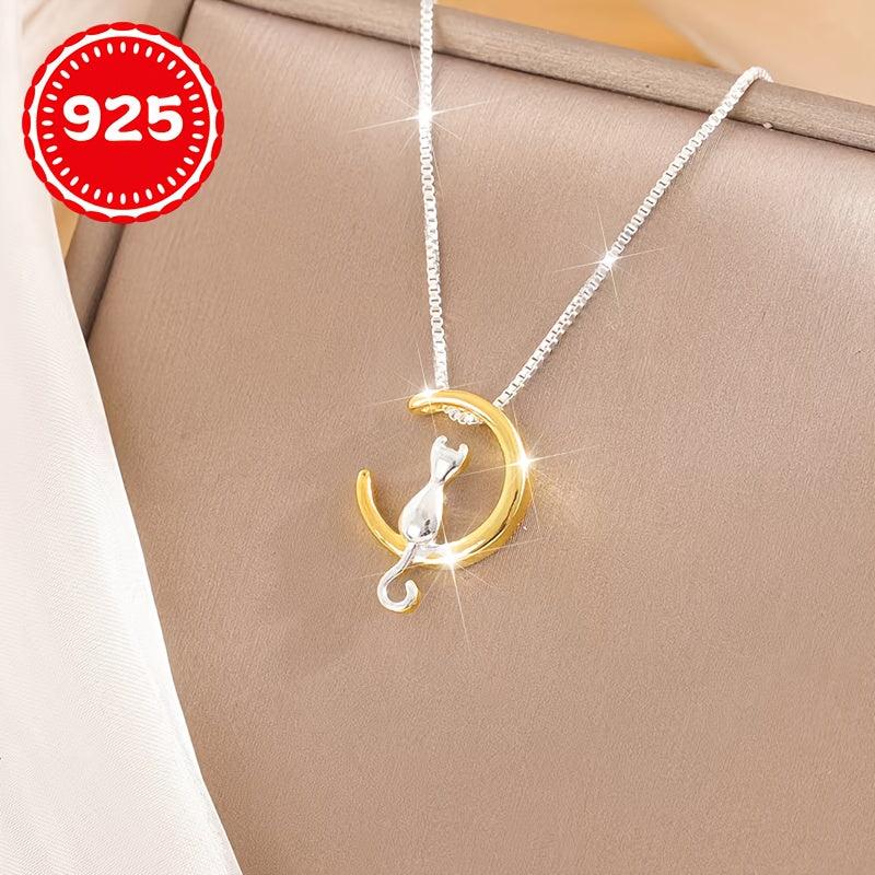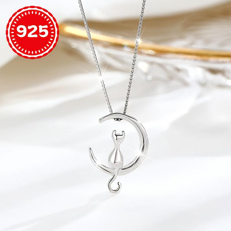 925 Silver Moon Cat Pendant Necklace Hypoallergenic Women's Collarbone Chain
