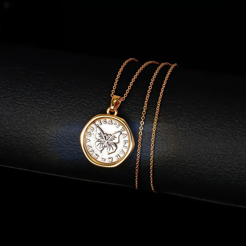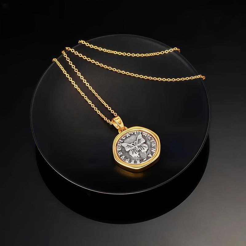 This exquisite 925 sterling silver necklace features an Italian hand-carved vintage butterfly coin pendant. It is perfect for Christmas and special occasions.