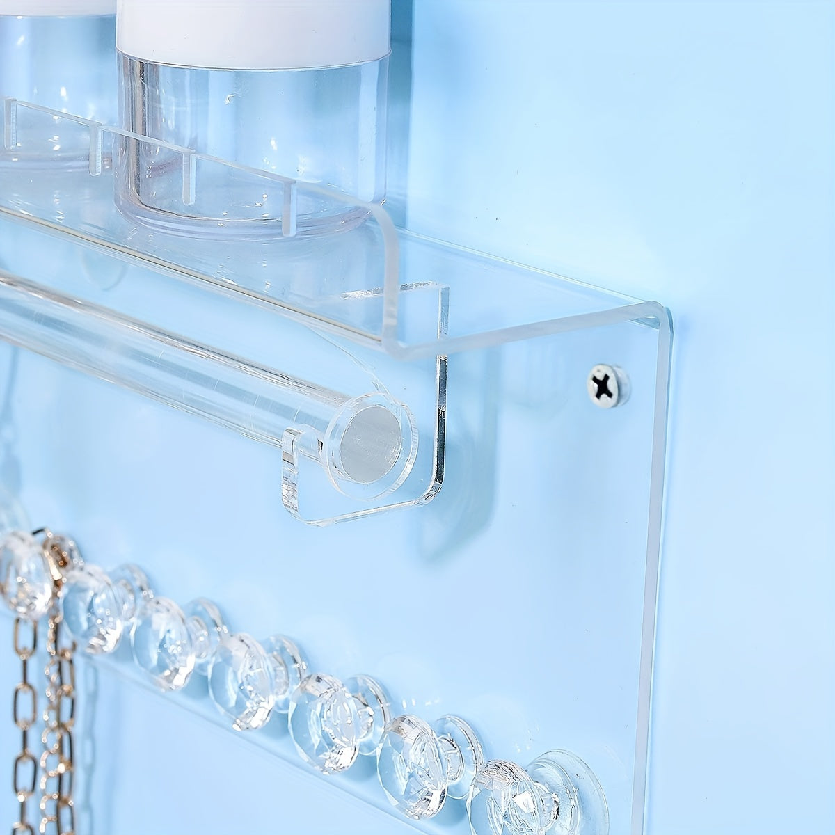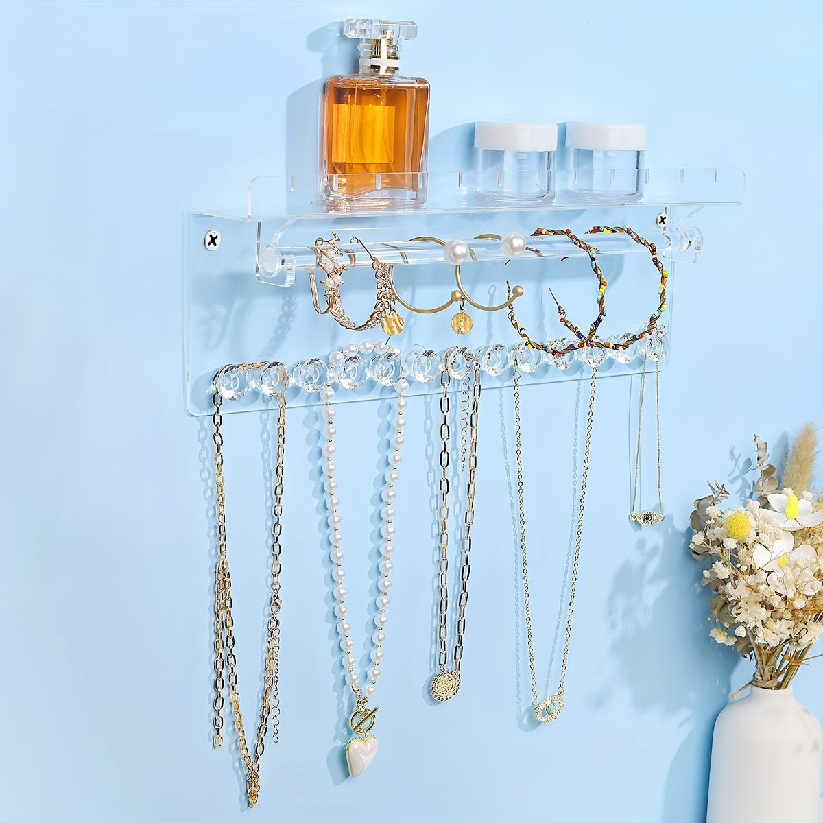 This acrylic jewelry organizer is perfect for displaying rings, earrings, and necklaces. It can be easily mounted on the wall, keeping your jewelry organized and easily accessible.
