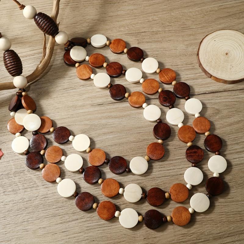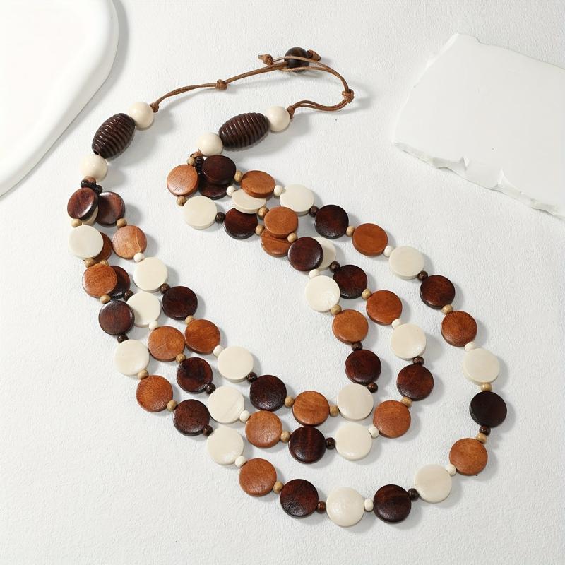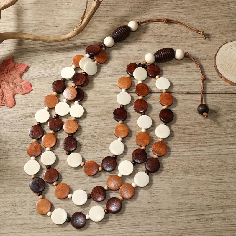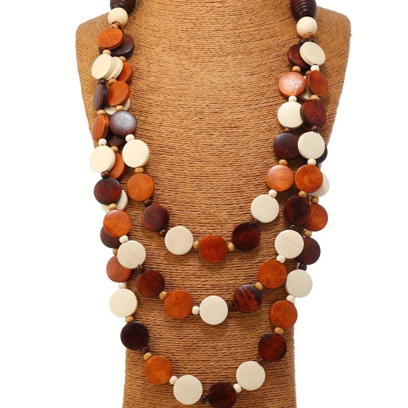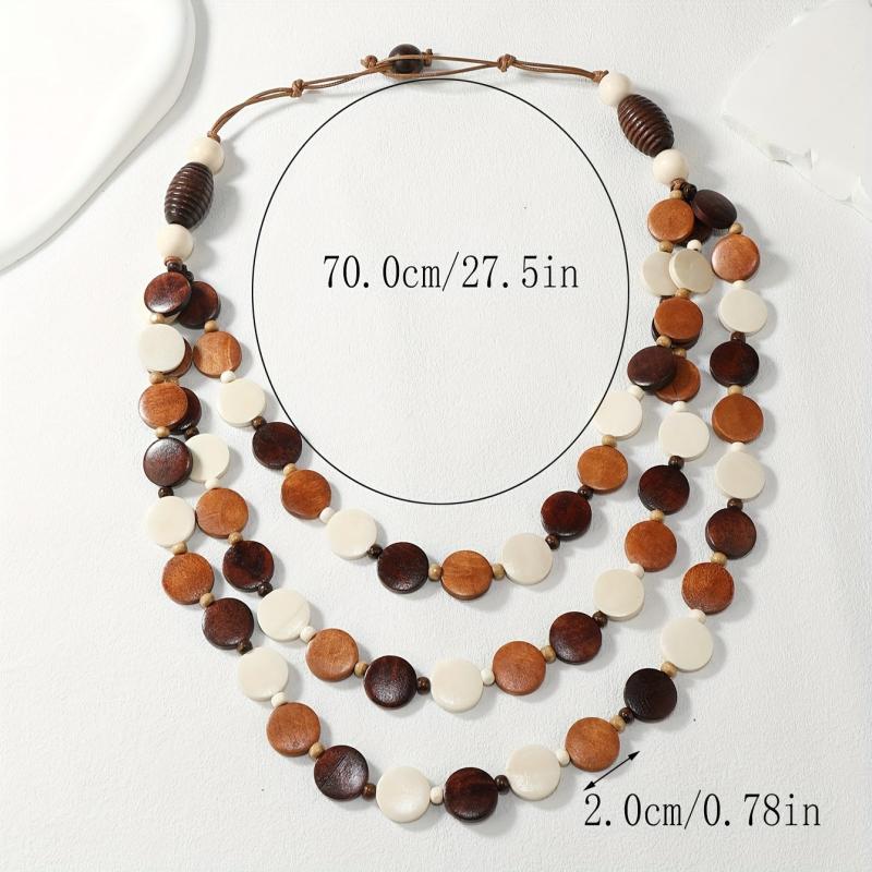 This bohemian layered necklace features recycled wood beads in an earthy brown hue, making it a unique and eco-friendly statement piece. Perfect for music festivals, daily wear, and gift giving.
