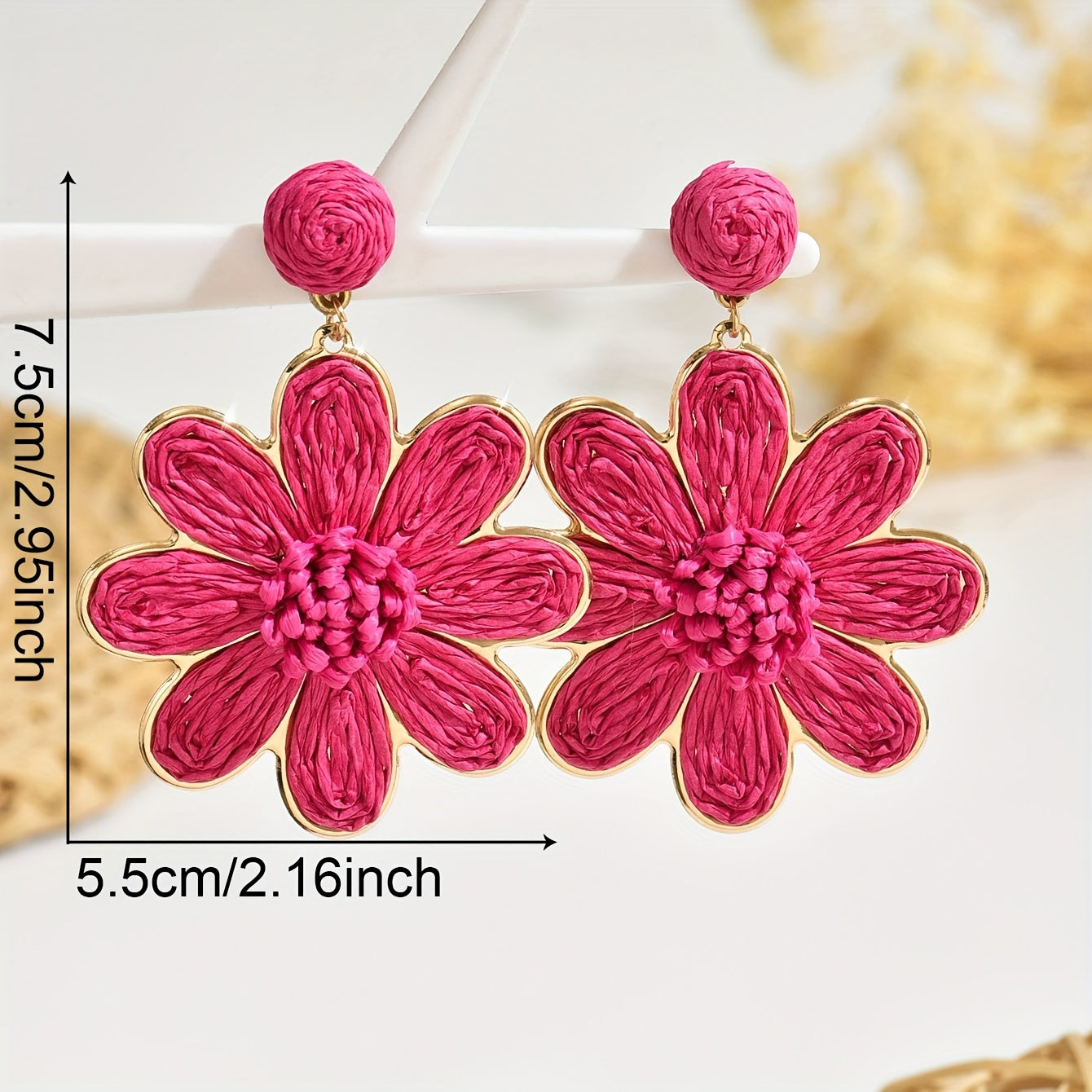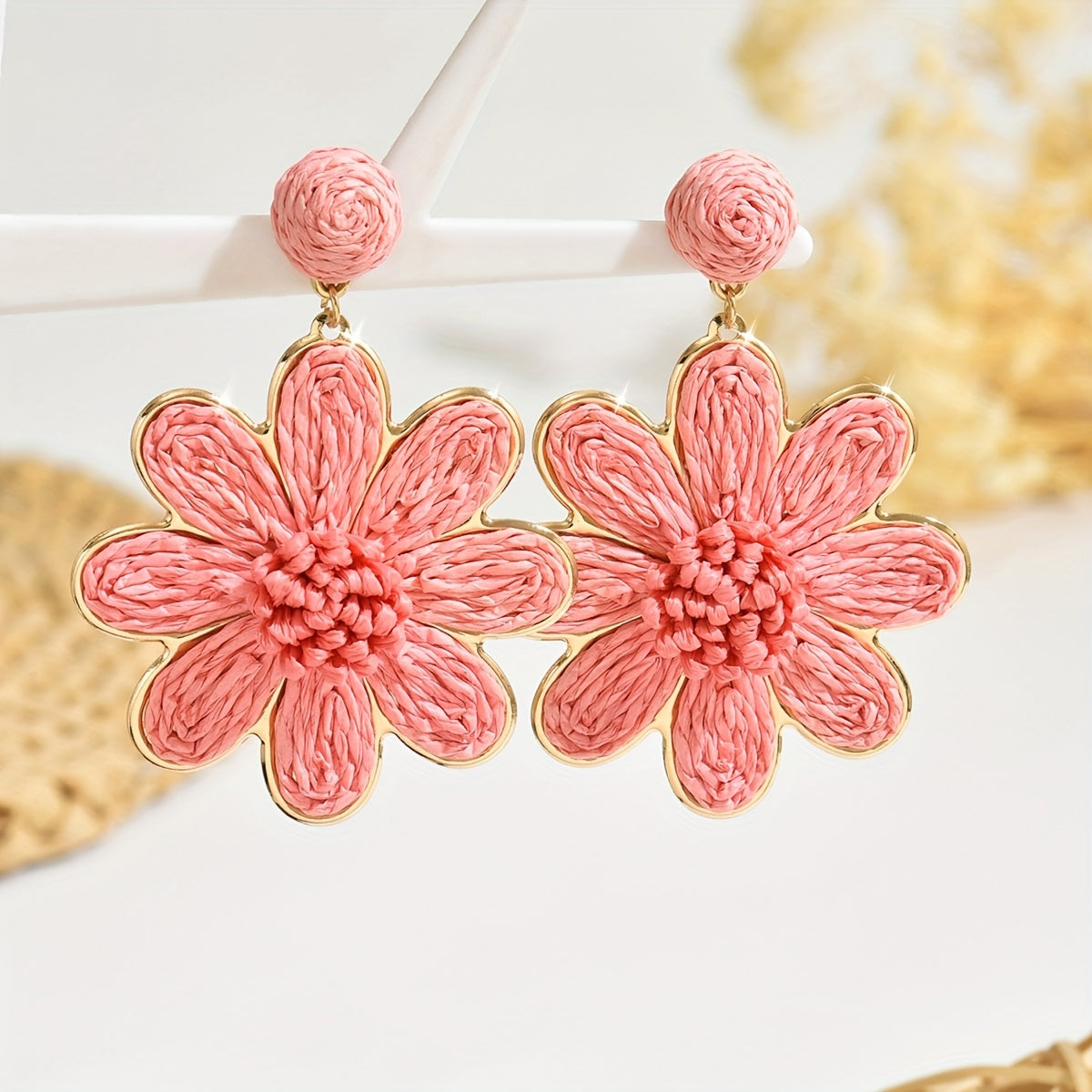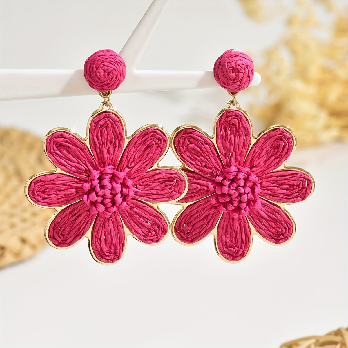 These vibrant pink and natural beige flower earrings are made from Bohemian raffia grass, perfect for daily wear and beach vacations.