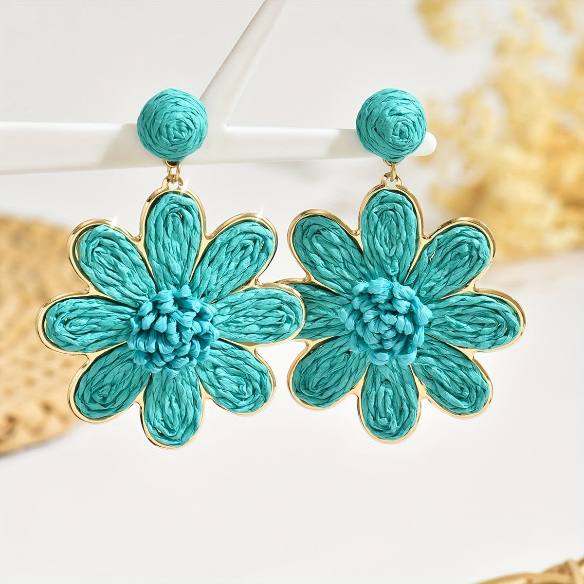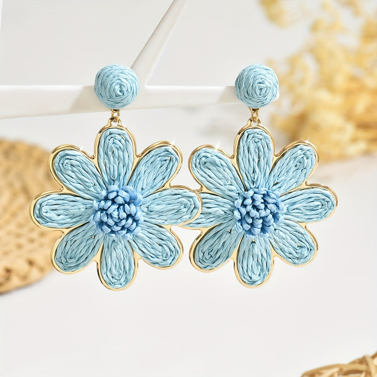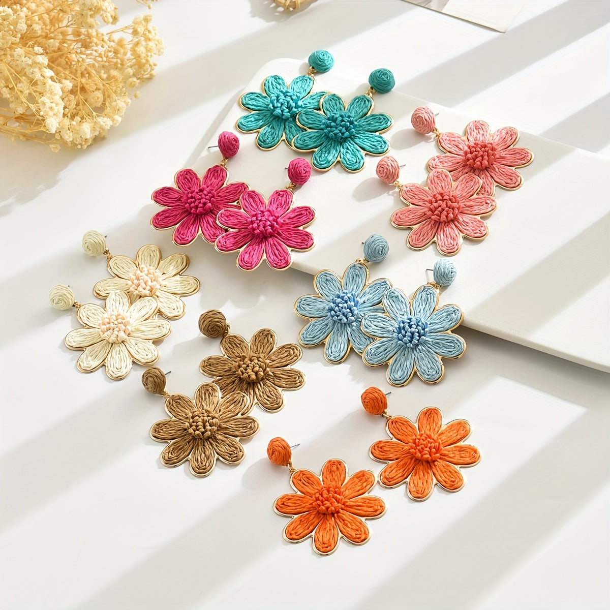 These vibrant pink and natural beige flower earrings are made from Bohemian raffia grass, perfect for daily wear and beach vacations.