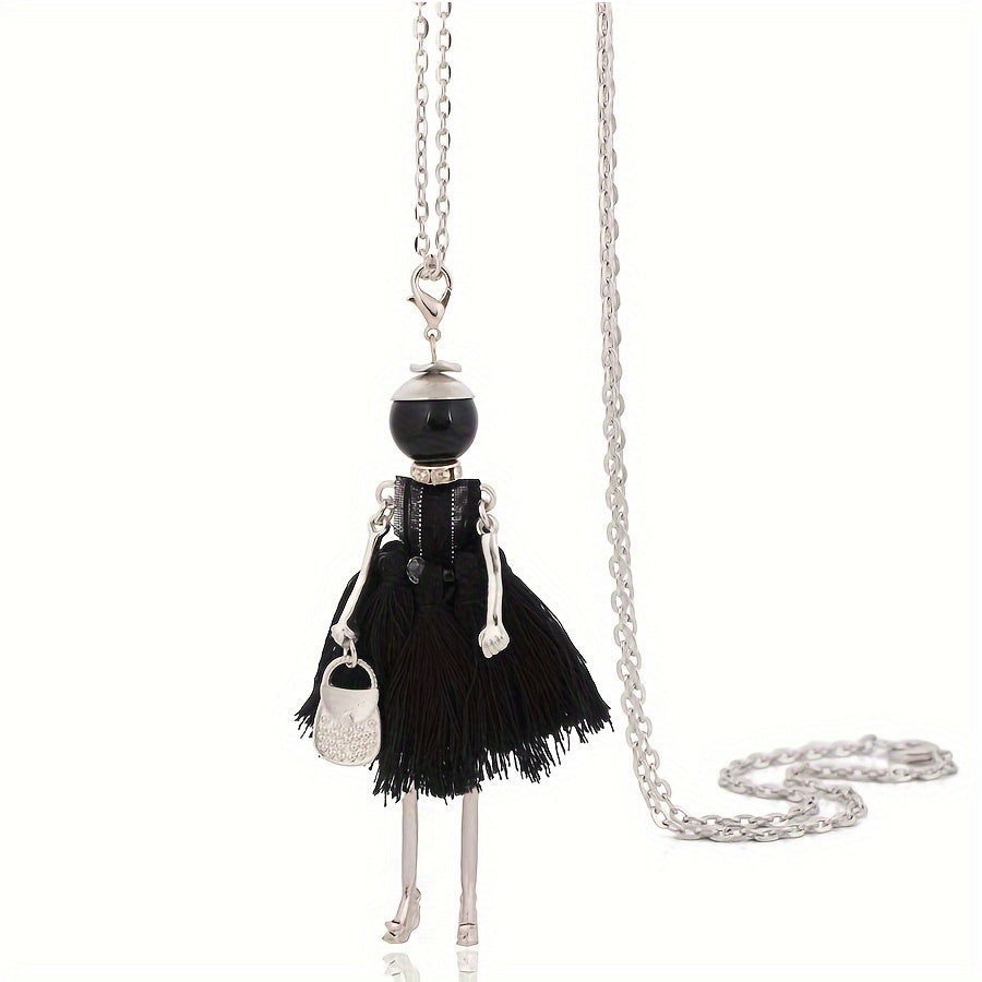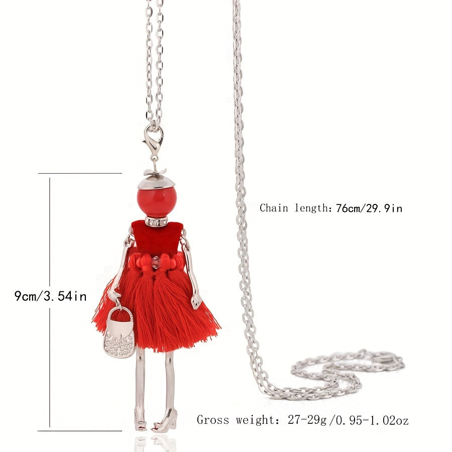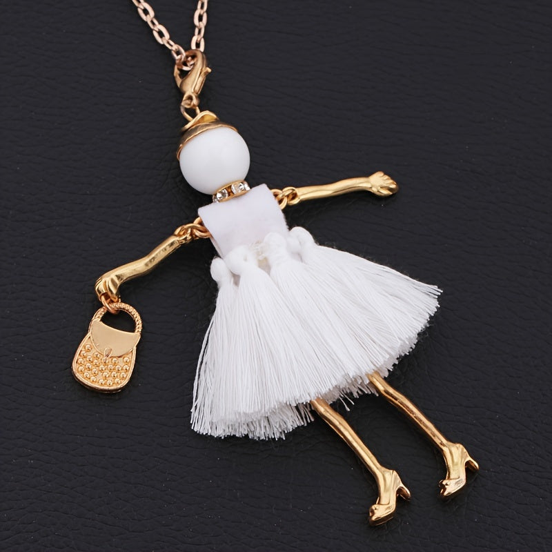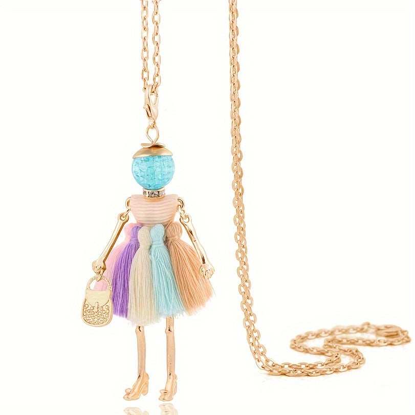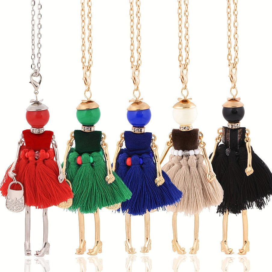 This bohemian tassel necklace features a unique doll pendant and a golden chain. Perfect for adding a touch of whimsy to any outfit.