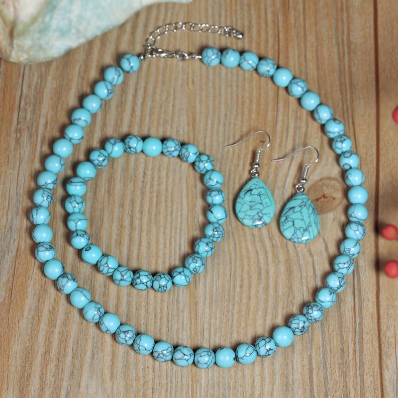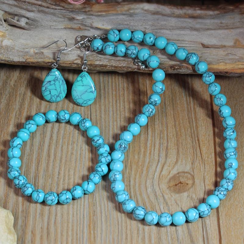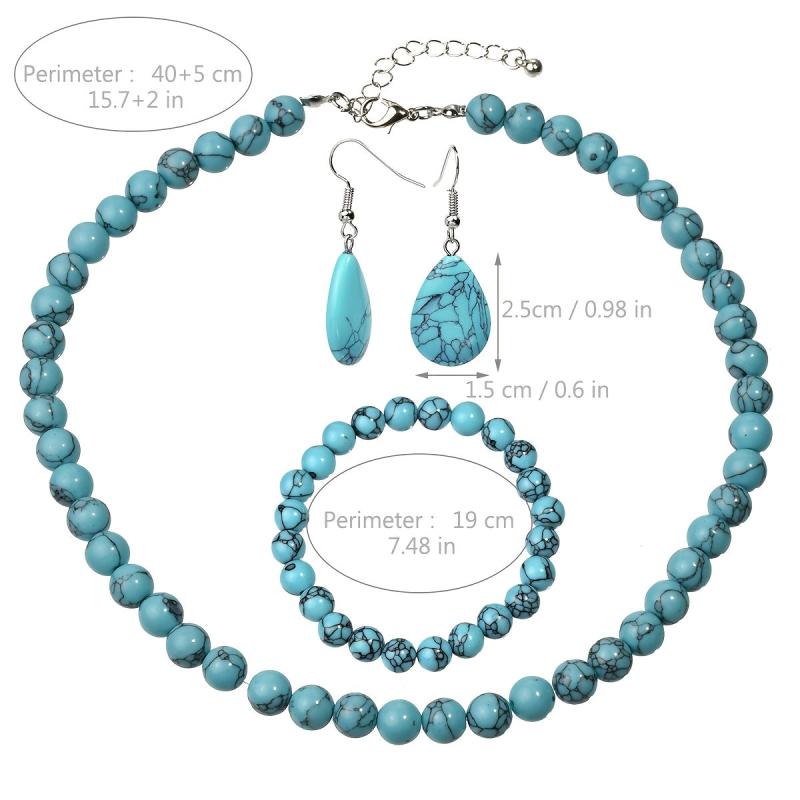This set includes a synthetic turquoise necklace, bracelet, and earrings, making it a perfect bohemian jewelry gift. The set comes with random natural stone colors.