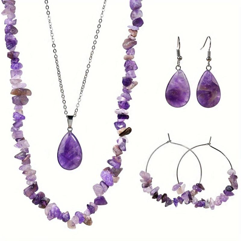 This 6-piece jewelry set features natural amethyst stone necklace and earrings. Perfect for everyday wear or as a gift.