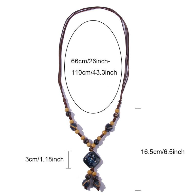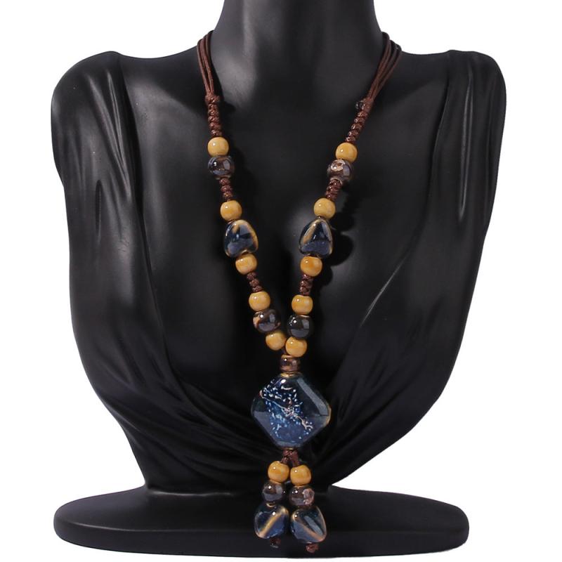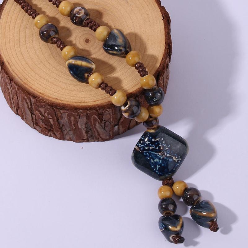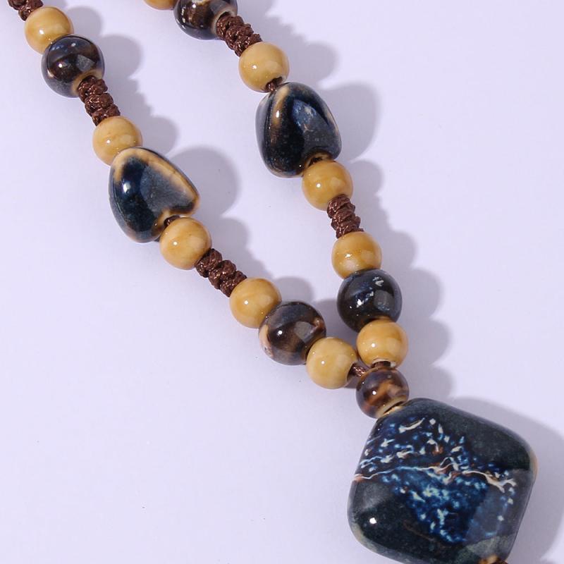 Elevate your casual attire with this bohemian ceramic necklace featuring a mix of geometric and golden marbled beads on an earthy brown cord. Perfect for adding a touch of ethnic charm to your look.