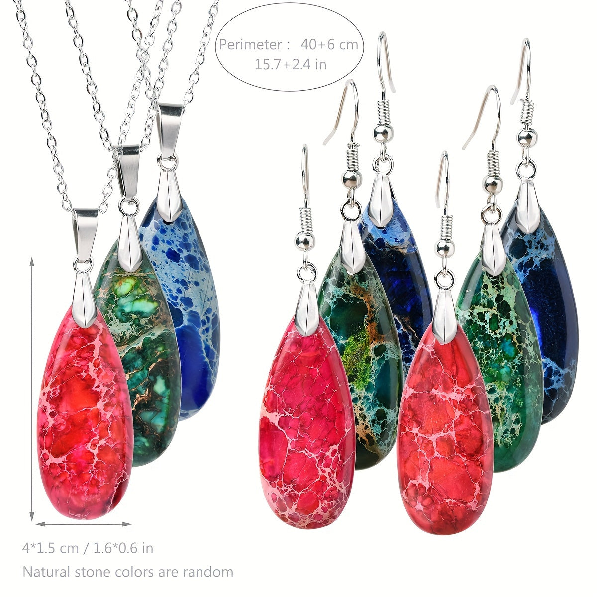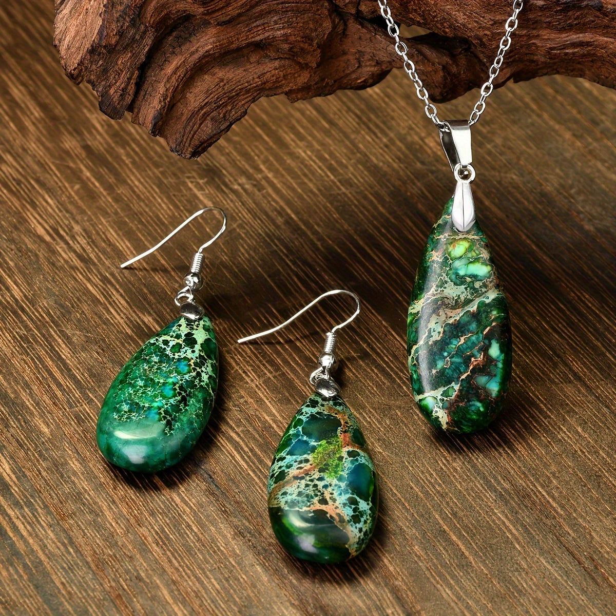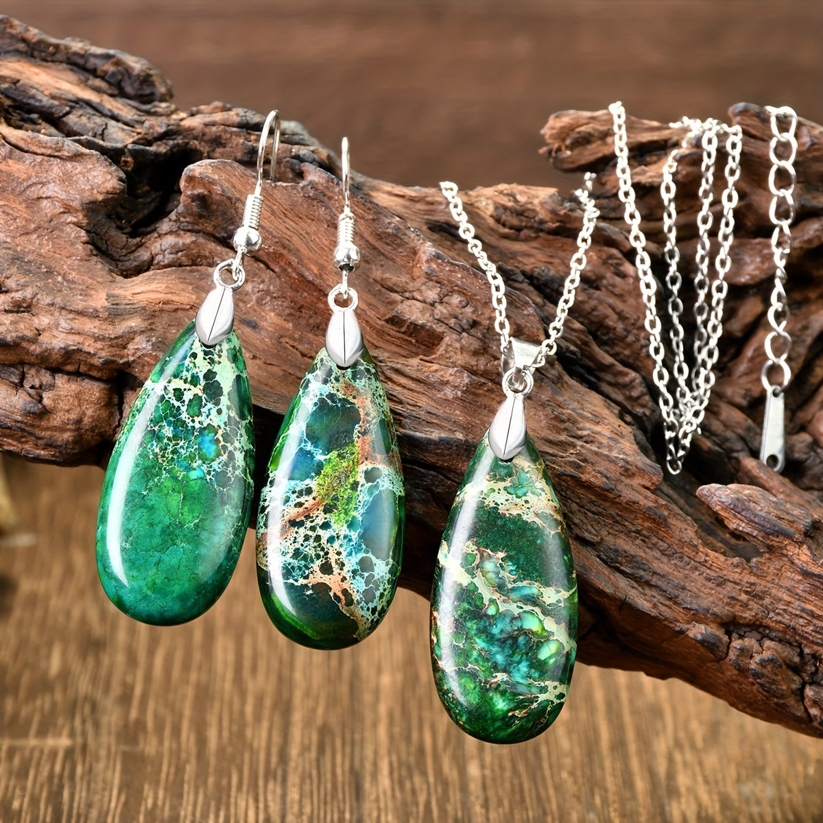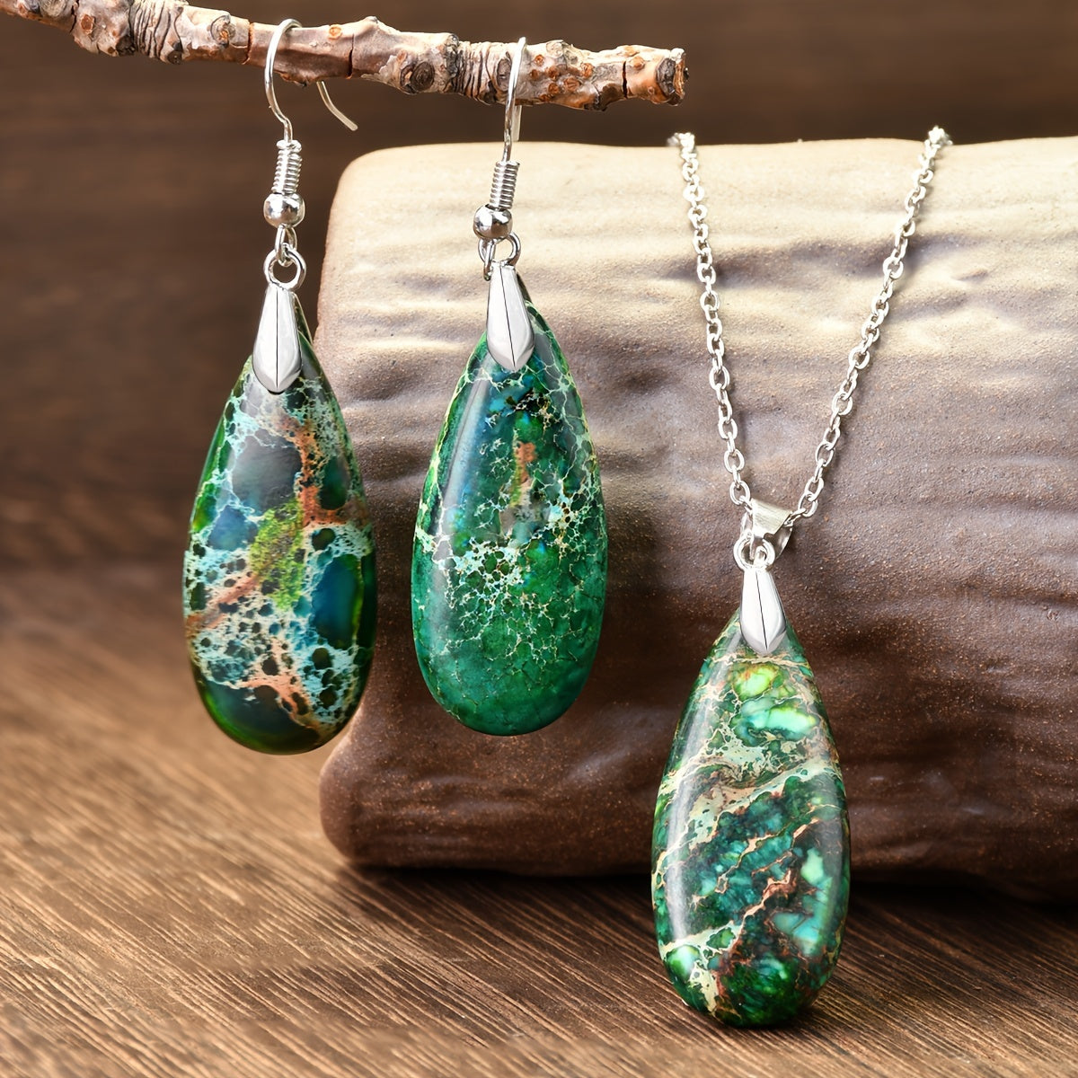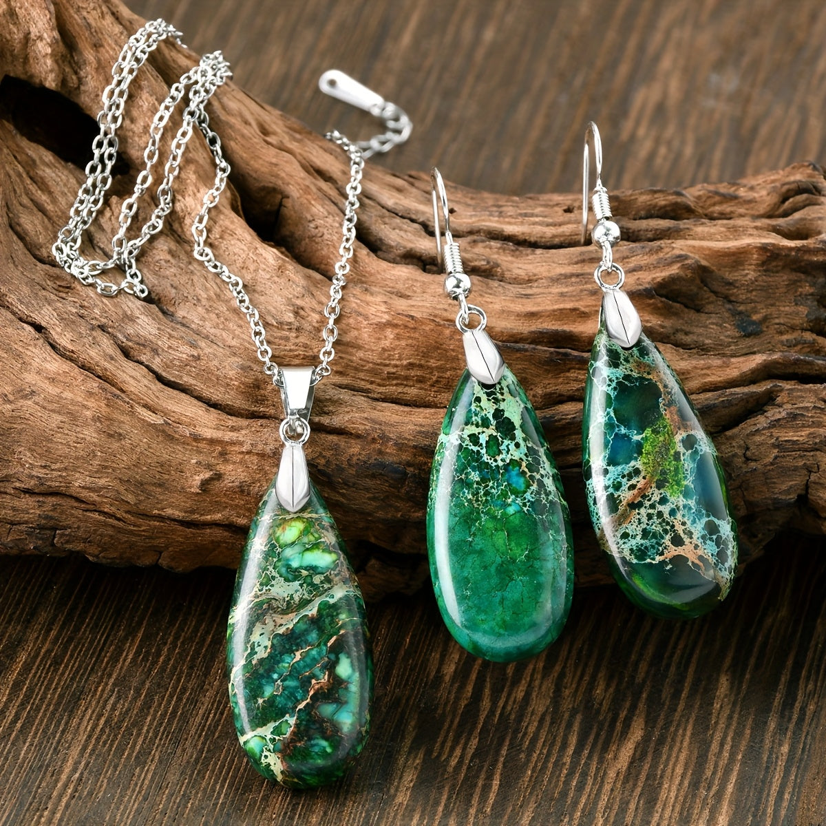 Handcrafted teardrop pendant necklace and earrings made from natural green aventurine stone. Ideal for daily wear and gifting, perfect for any occasion.