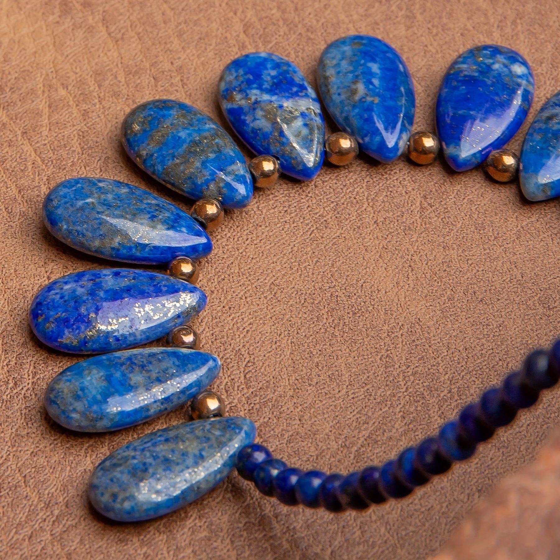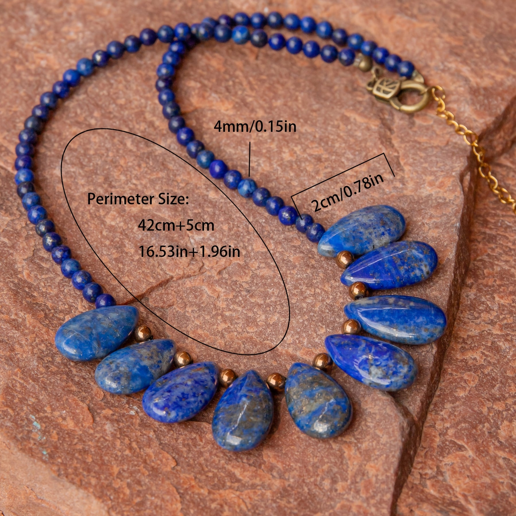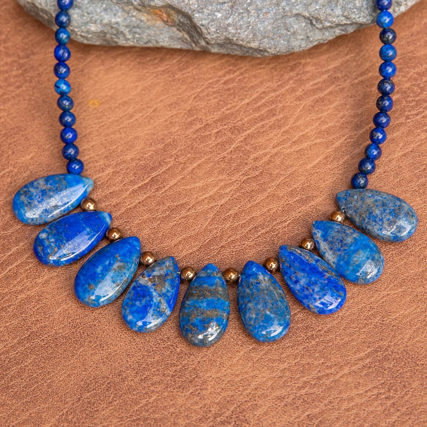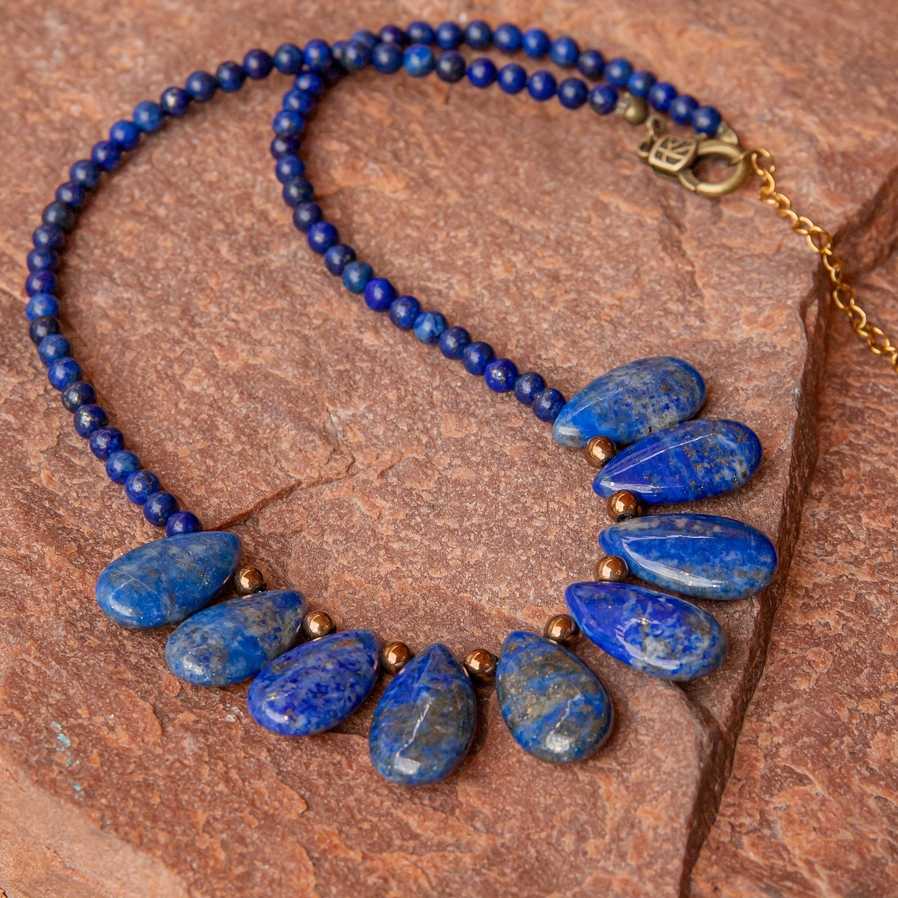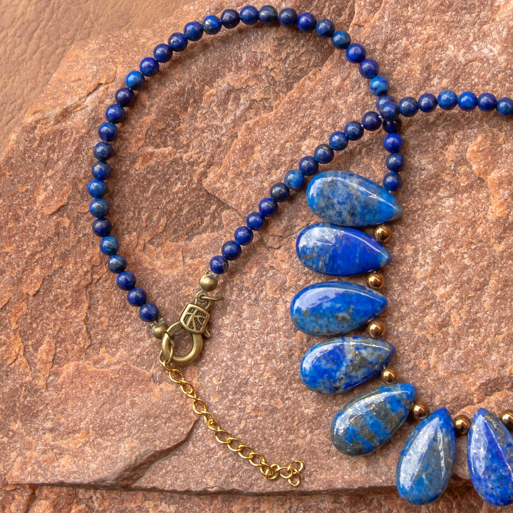 Elegant bohemian style necklace featuring lapis lazuli teardrop pendants on a beaded chain. Perfect for daily wear or special occasions. Great gift idea for family and friends.