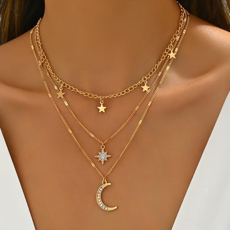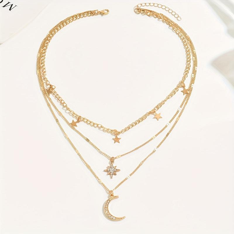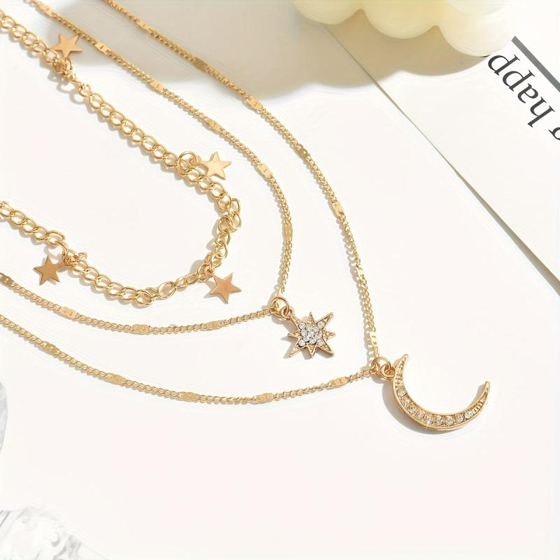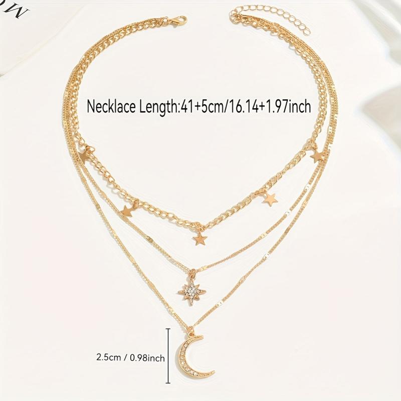 Elevate your style with this Bohemian layered necklace featuring star and moon pendants. Made with 14K gold plating and rhinestone accents, it's the perfect gift for her everyday jewelry collection.