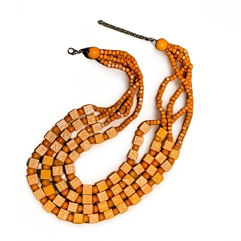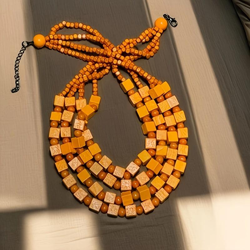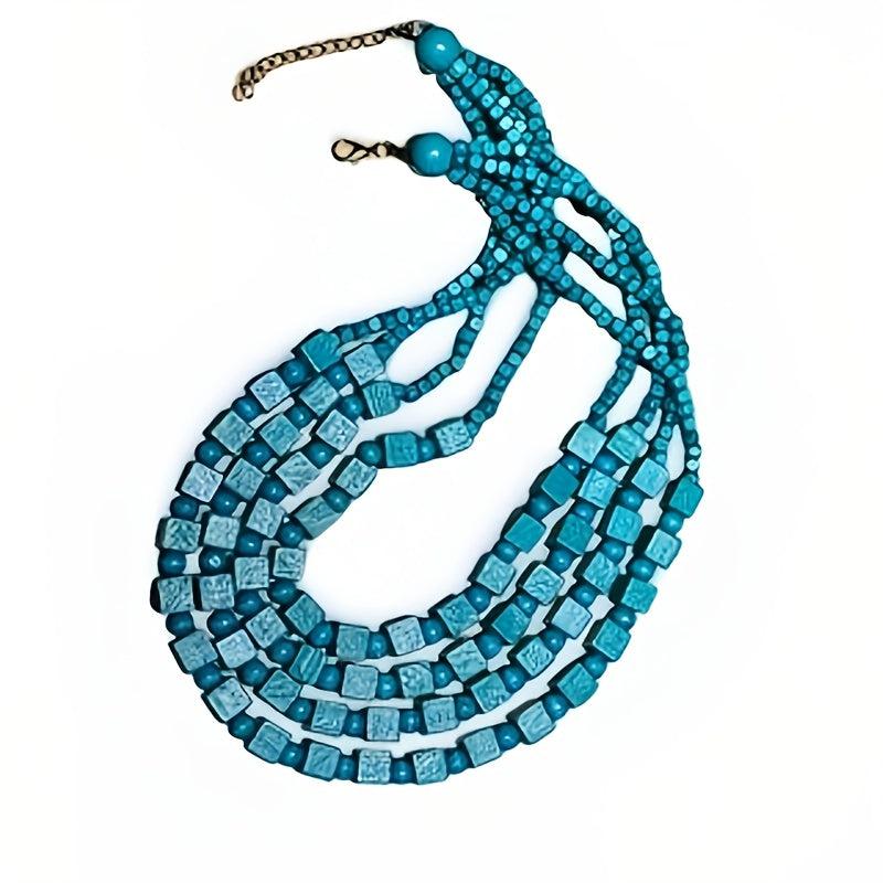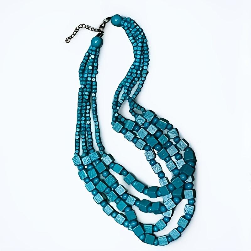 Elevate your casual attire with this unique Bohemian layered necklace featuring turquoise beads and wooden accents. The high-quality recycled wood adds an eco-friendly touch to your look. It's a perfect gift for women who love boho style.