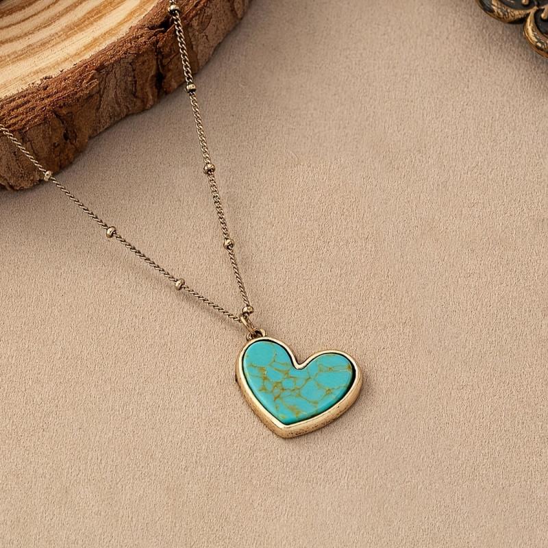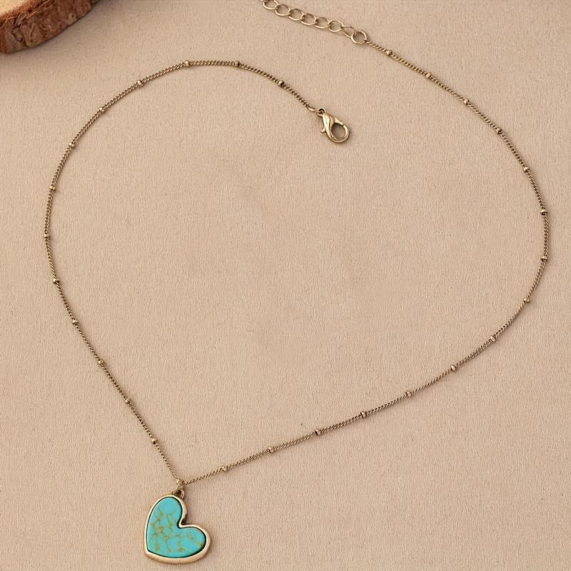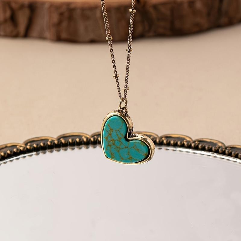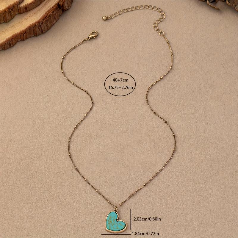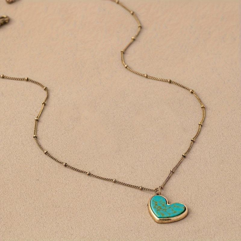 Add a touch of bohemian charm to your look with this turquoise heart pendant necklace. The vintage golden tone chain makes it a versatile accessory that can be worn year-round. It's a durable and stylish gift for her.
