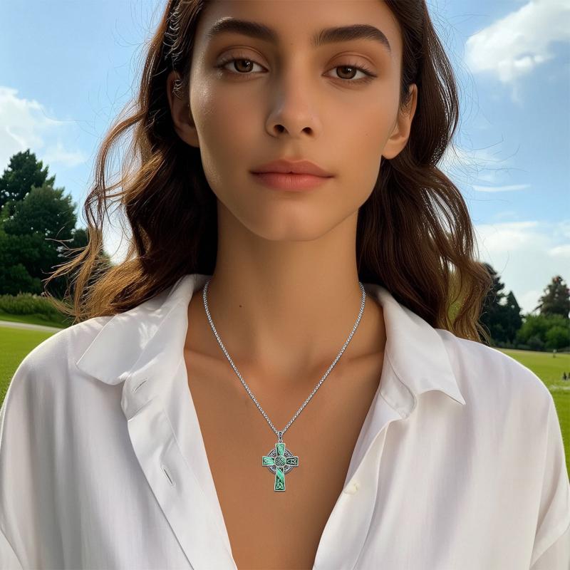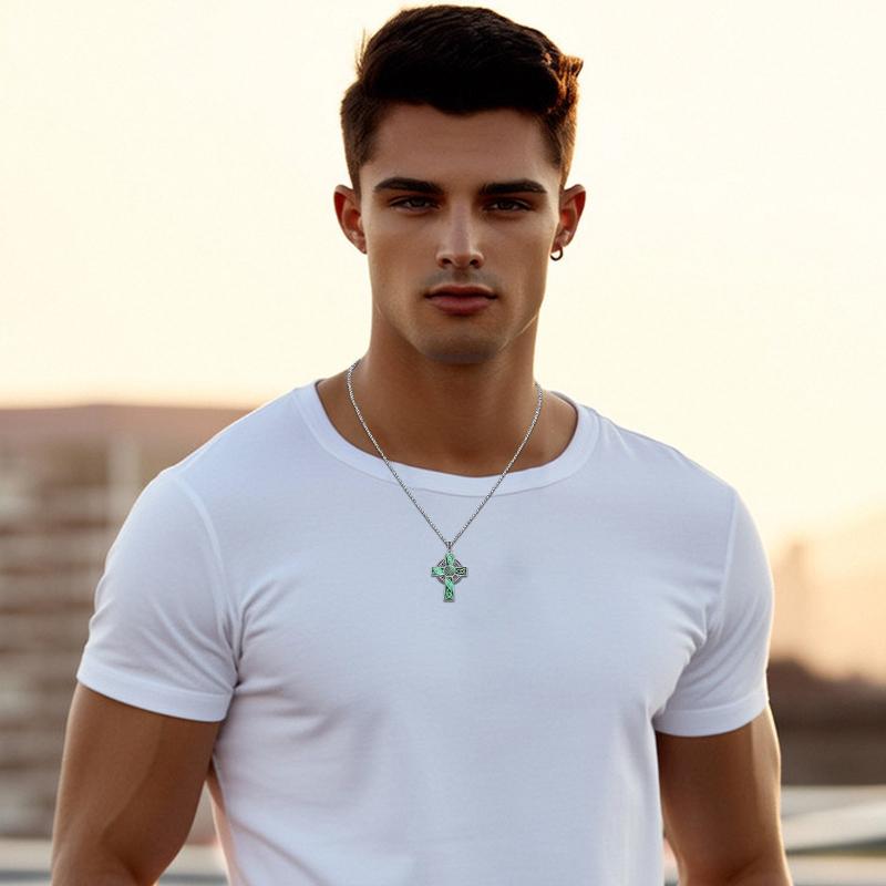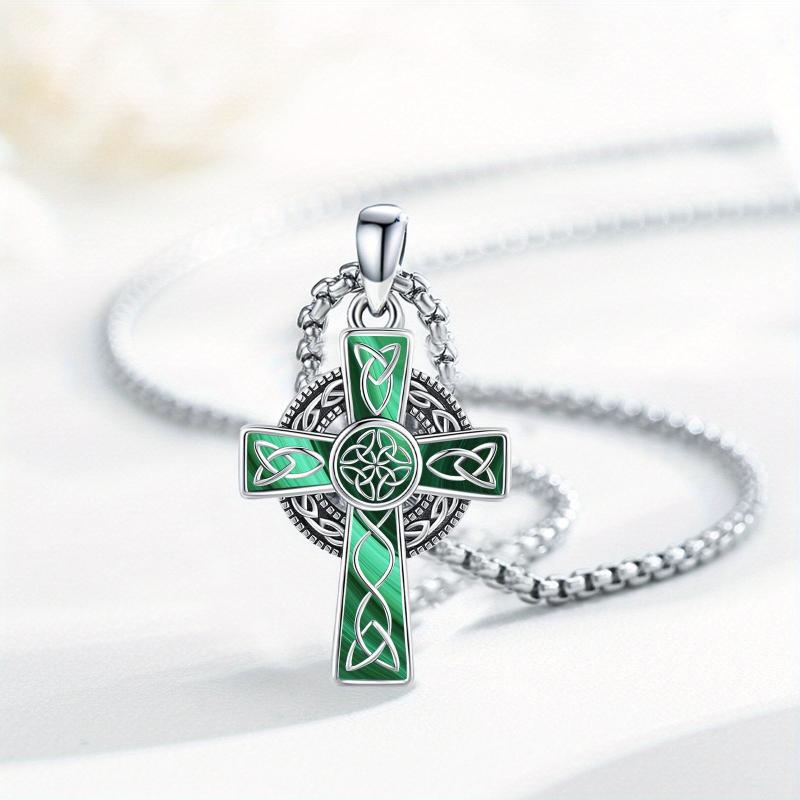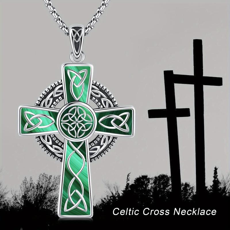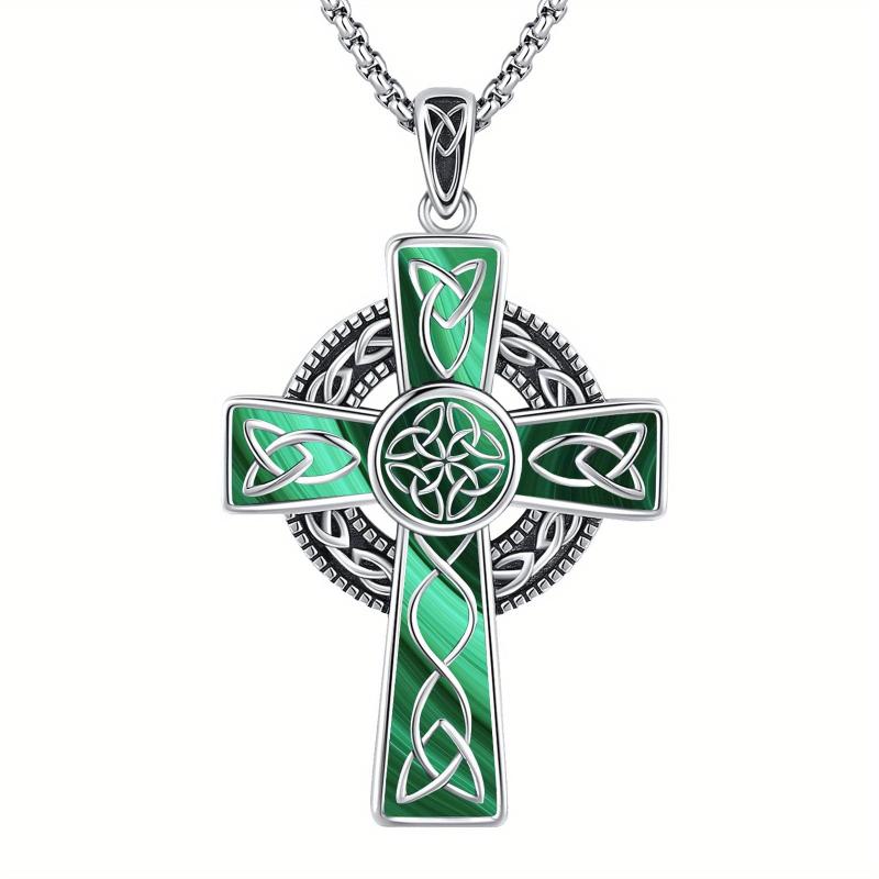This stunning Celtic Cross Necklace is crafted from 925 sterling silver and features a Malachite stone. It is a religious pendant suitable for both men and women, adding a touch of Viking-inspired style to your outfit.