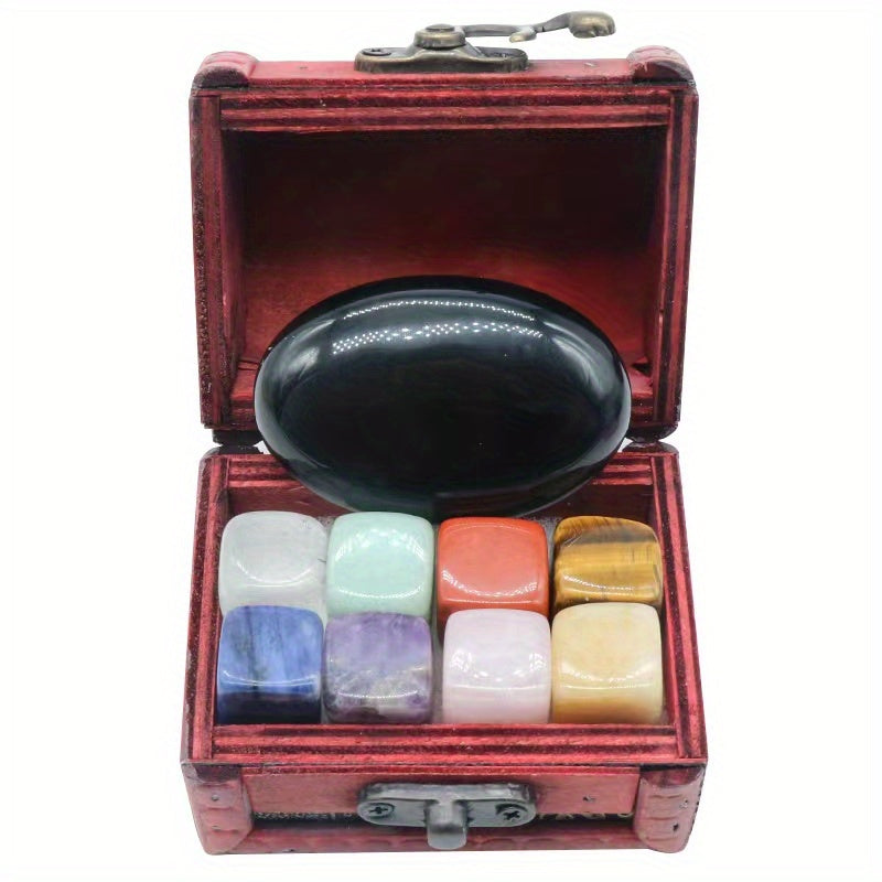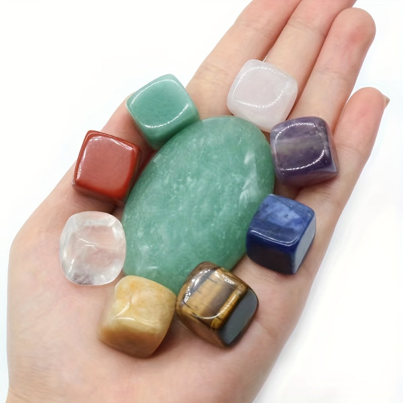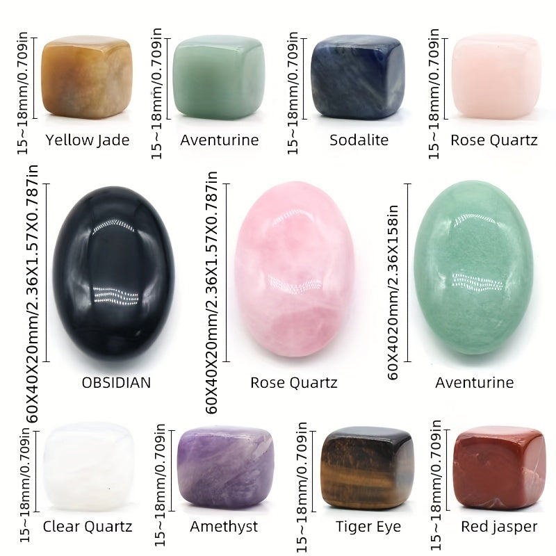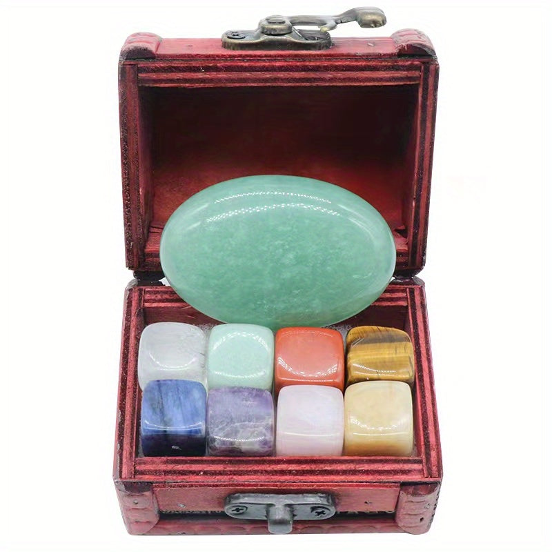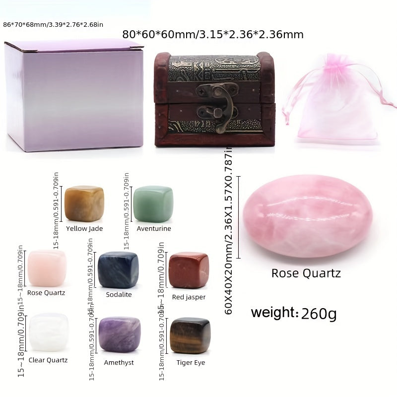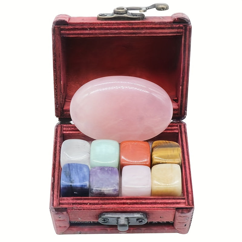 This set includes 1 Large Rose Quartz Palm Stone, 8 Chakra Rolling Stones, and a Guide to Self Love Affirmation.