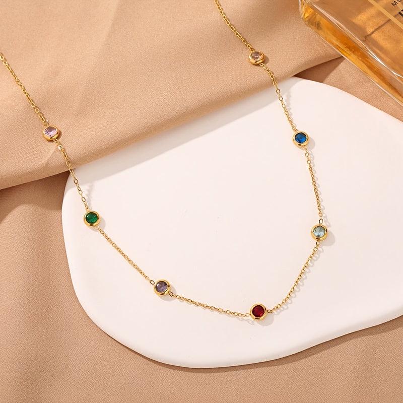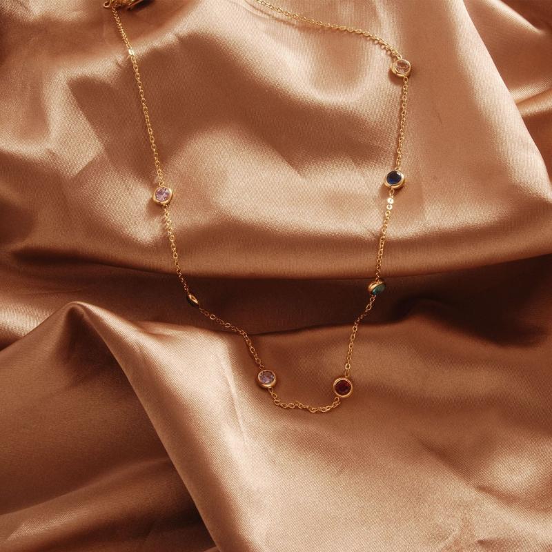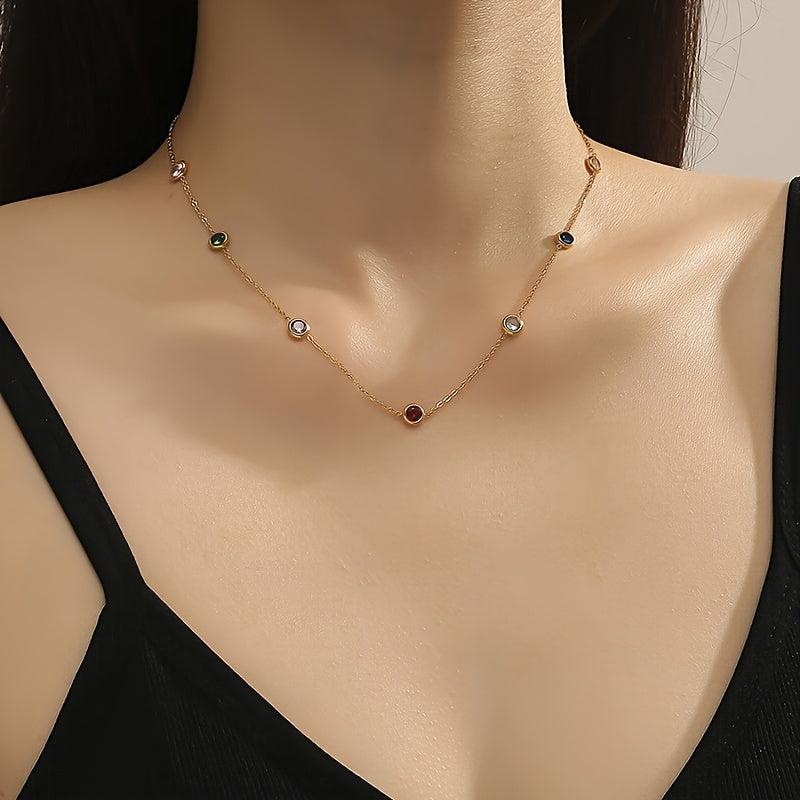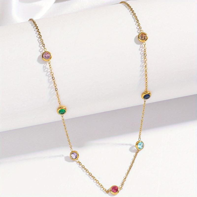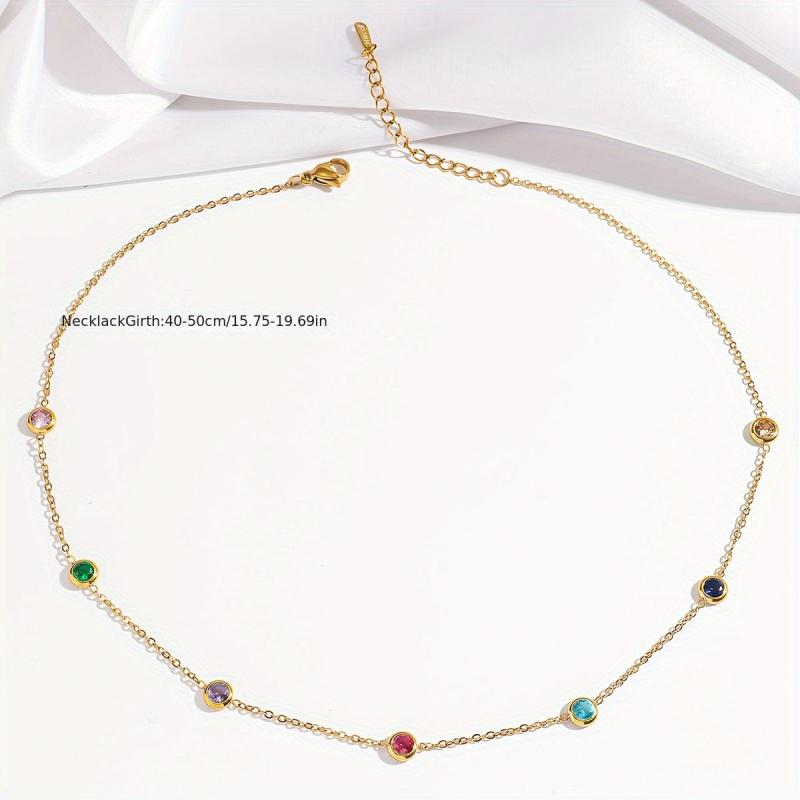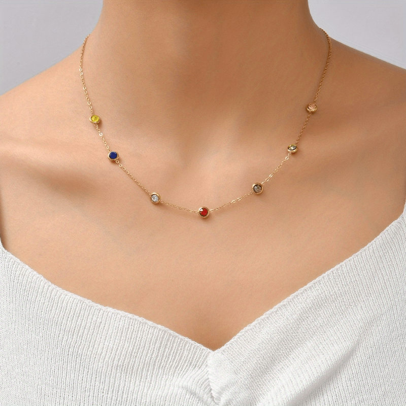 Add a pop of color to your outfit with this stainless steel necklace featuring seven synthetic gemstone beads. Perfect for vacations, birthdays, and parties.