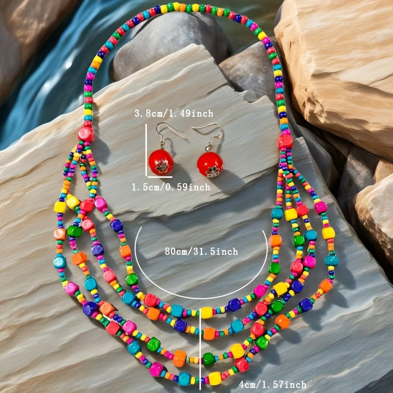 Add a pop of color to your outfit with this stunning Middle Eastern-inspired necklace and earrings set. The small square wooden beads come in a variety of vibrant colors, creating a beautiful bohemian look.