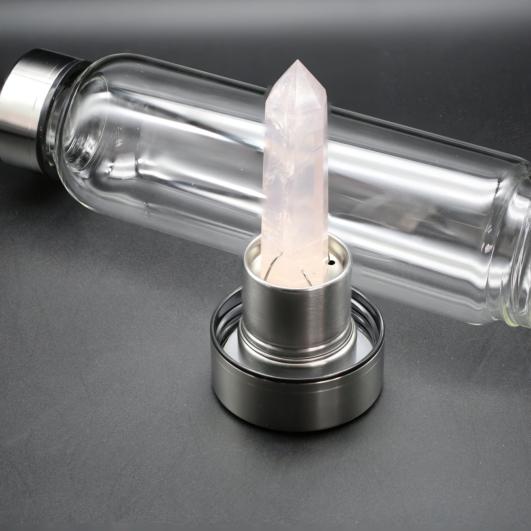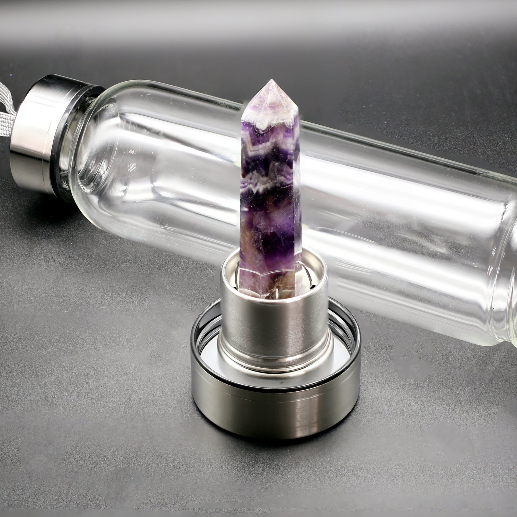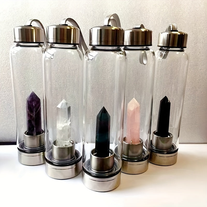 Stay hydrated and energized with this crystal water bottle featuring an elongated amethyst stone for positive energy.