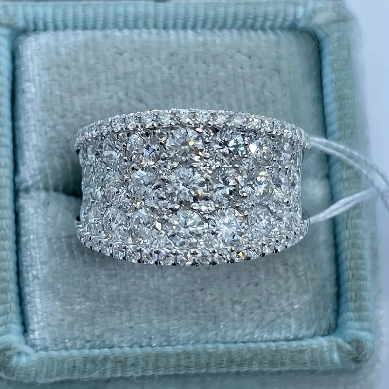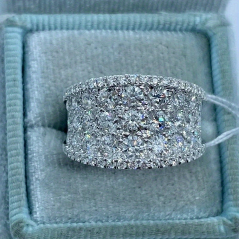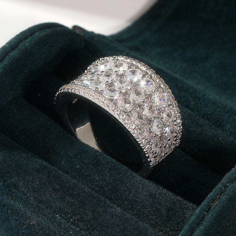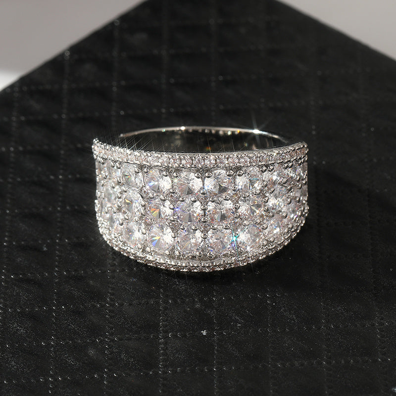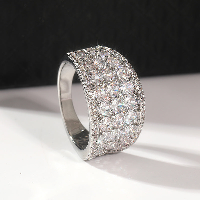 This elegant wide band ring features synthetic cubic zirconia stones that shimmer with brilliance. A perfect anniversary or wedding gift for her.