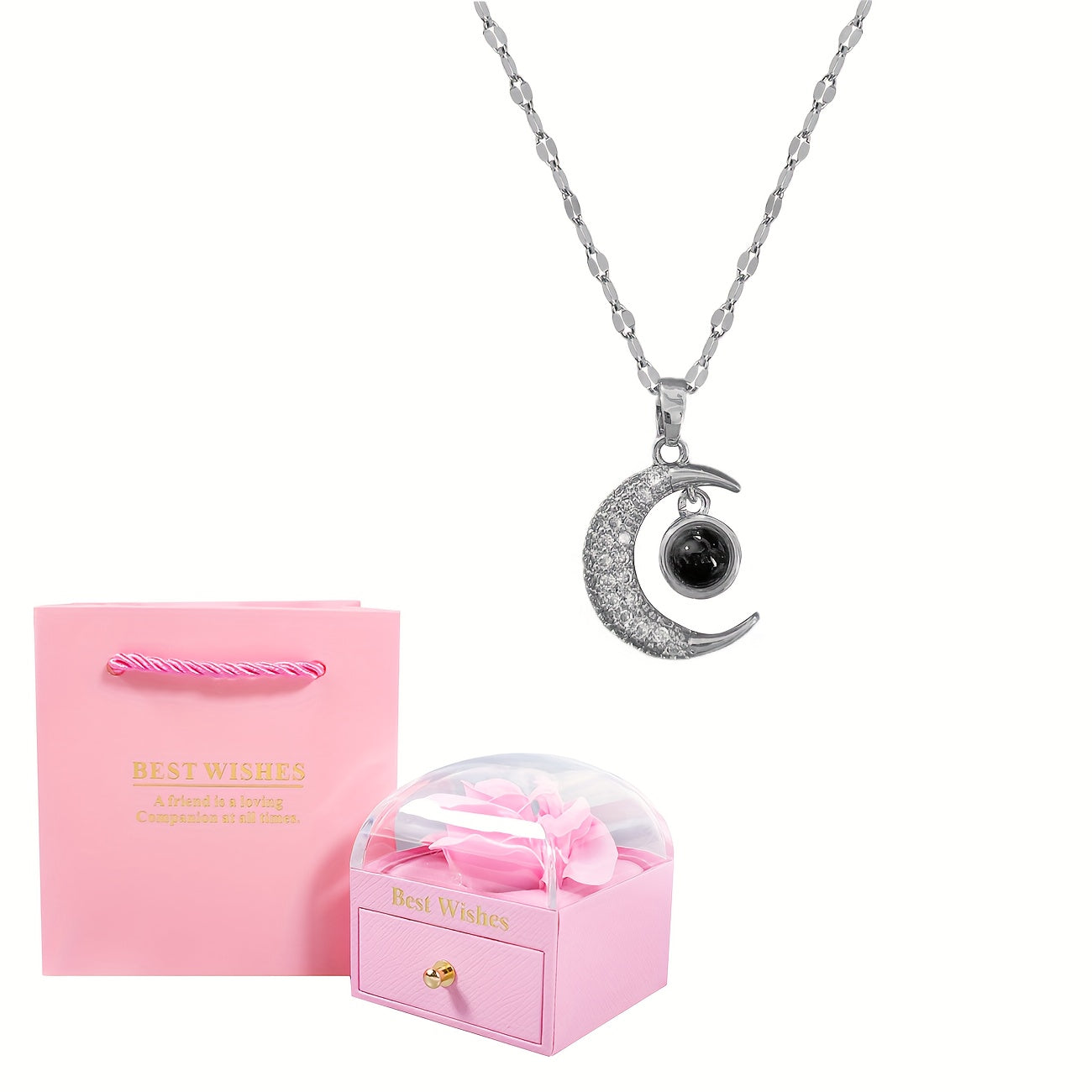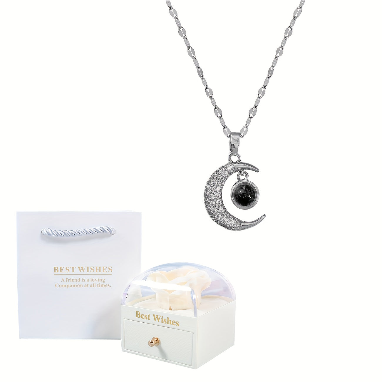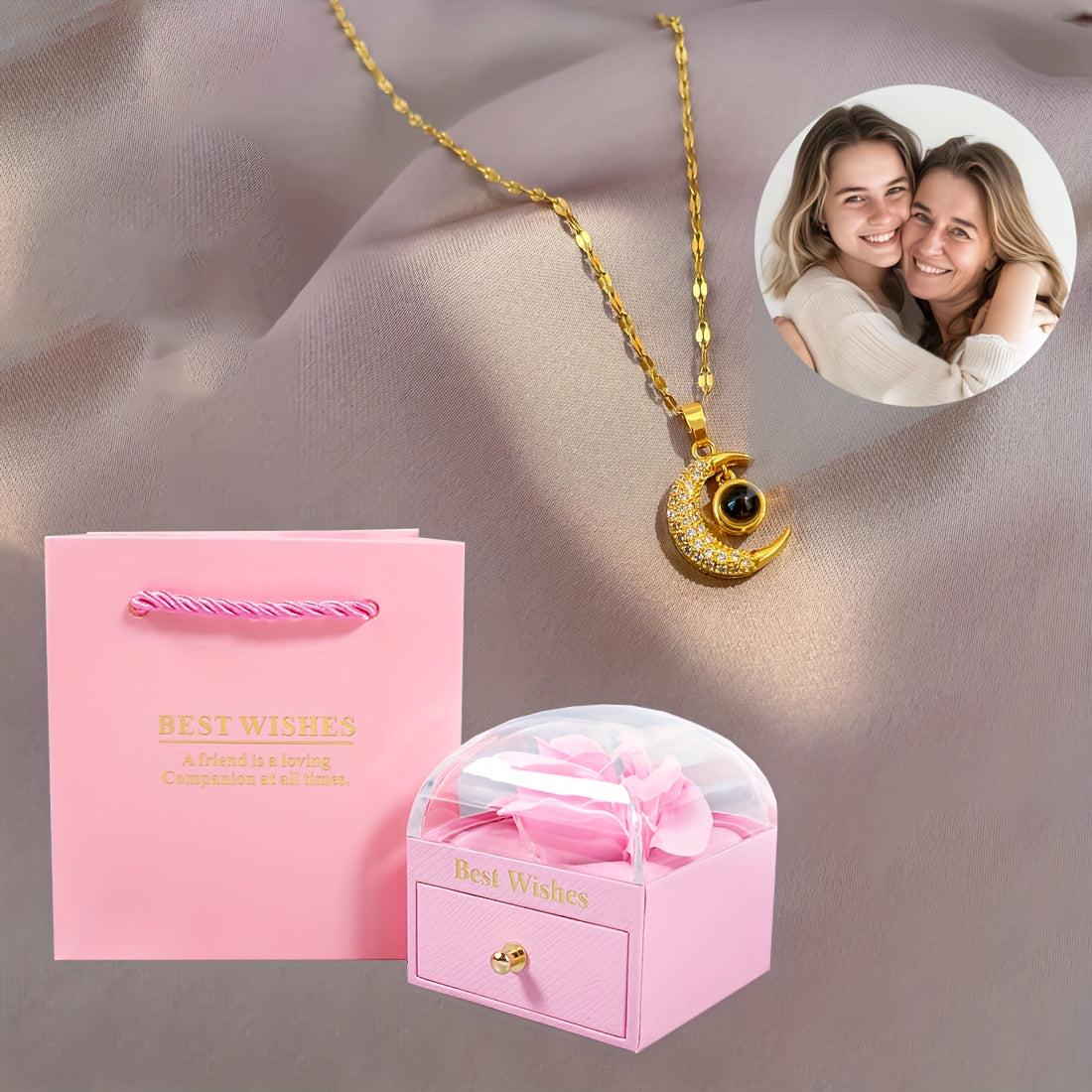 This personalized necklace features a moon pendant with a customized projection of pictures. Inlaid zirconia and rose details make it a romantic gift for Mother's Day or any occasion.