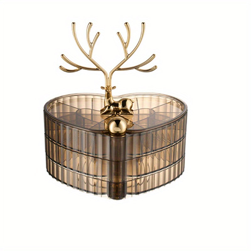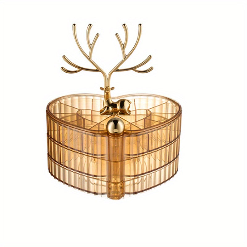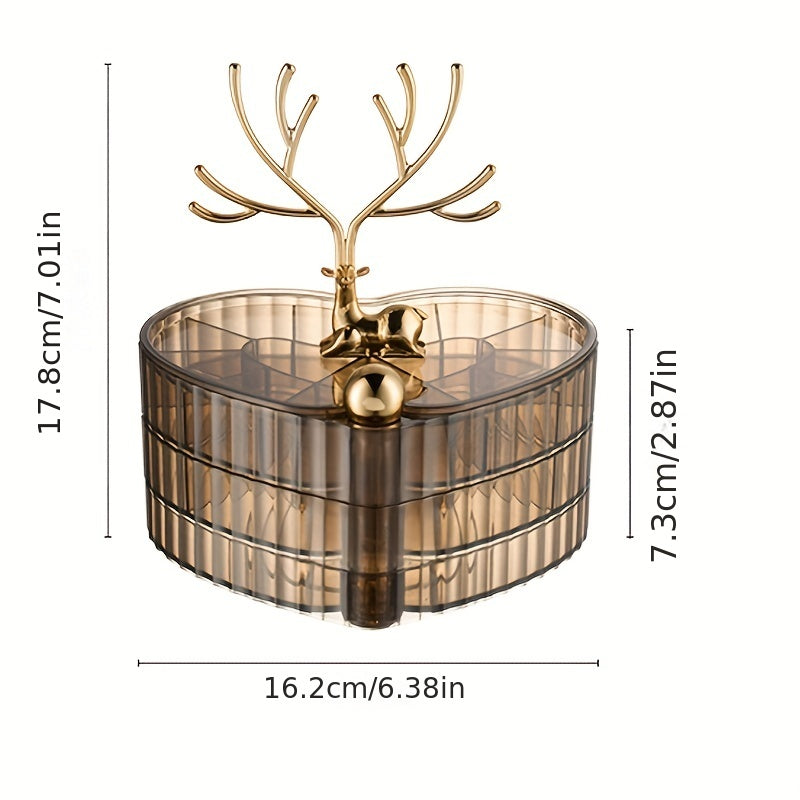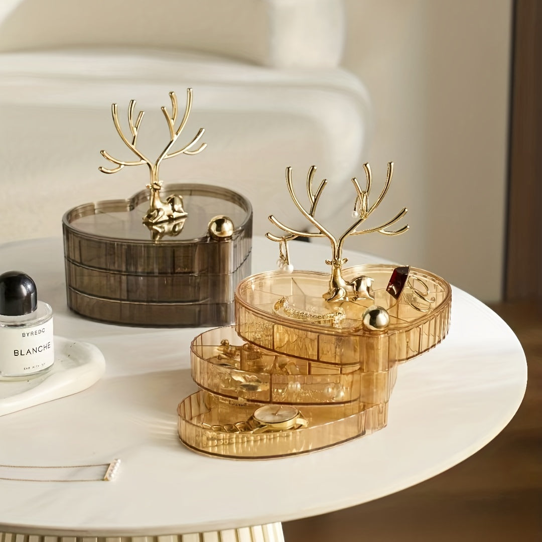 This jewelry box features a beautiful deer design and rotating layers for easy access to your accessories. Keep your jewelry organized and displayed in style.