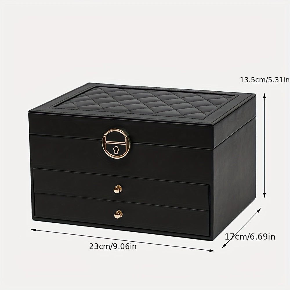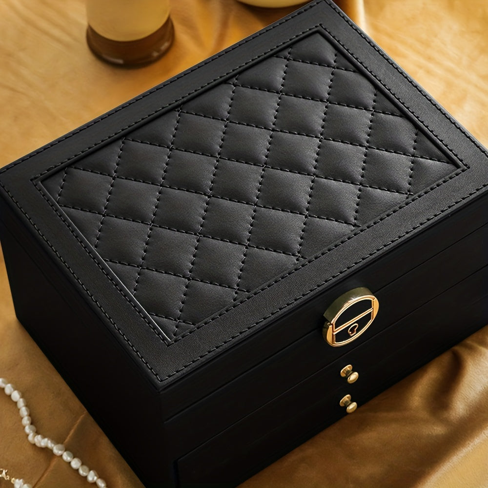 Keep your jewelry safe and organized in this elegant storage box. It features multiple layers for easy access and showcases a luxurious golden gemstone design.