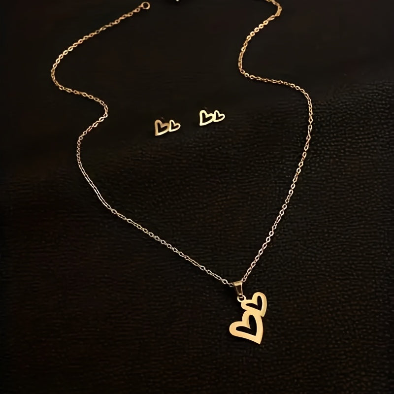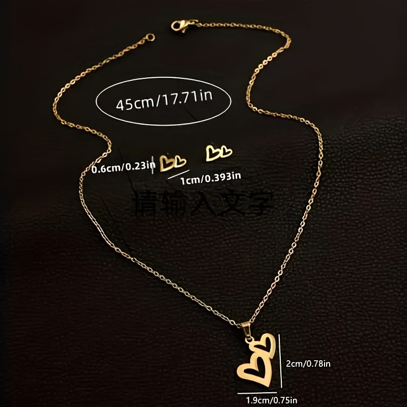This romantic jewelry set features a double heart pendant necklace and matching stud earrings. Made of stainless steel, this set is perfect for daily wear and makes a great Valentine's gift. Suitable for all seasons.