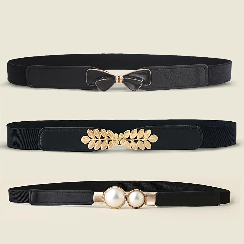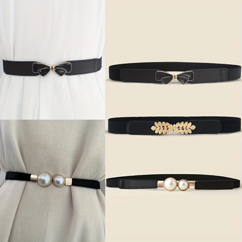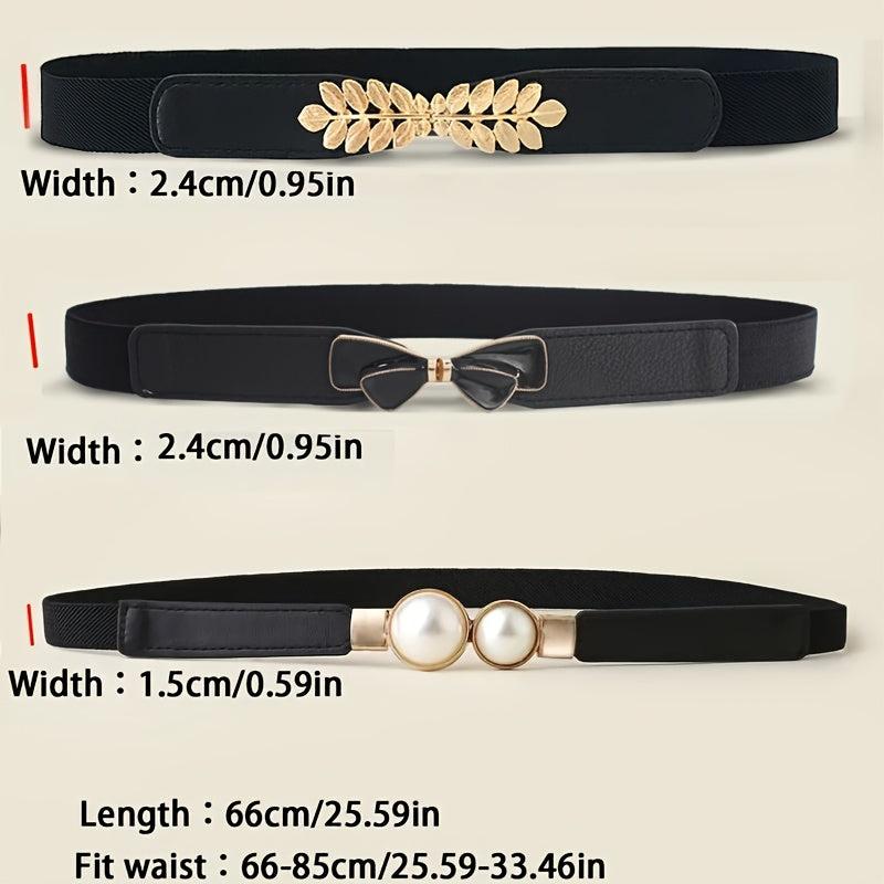 Upgrade your style with these three elastic stretch belts featuring elegant metal faux pearl buckles. These belts are versatile and perfect for pairing with coats, dresses, and jeans.
