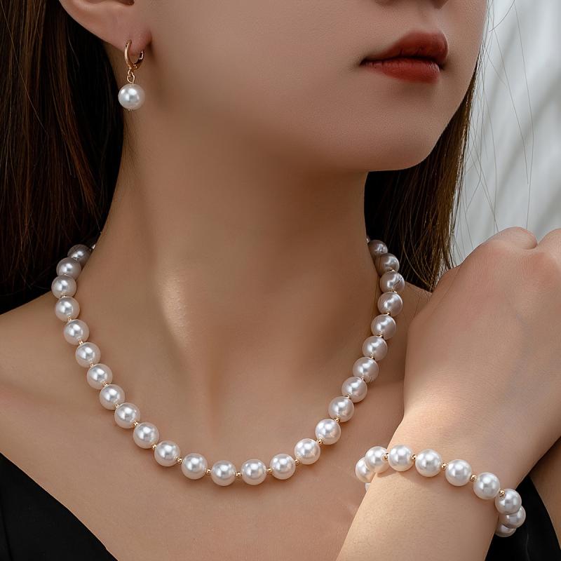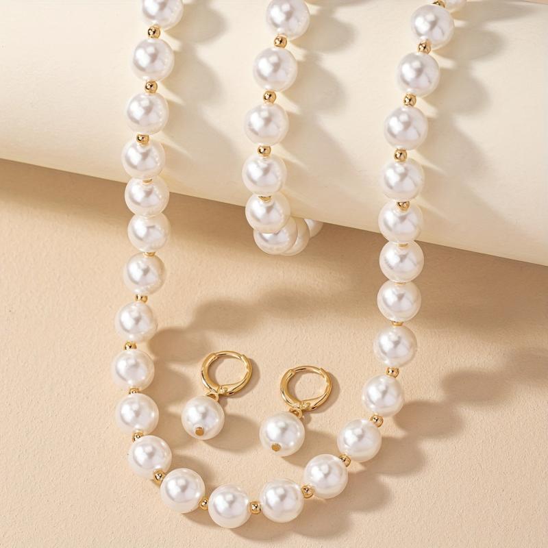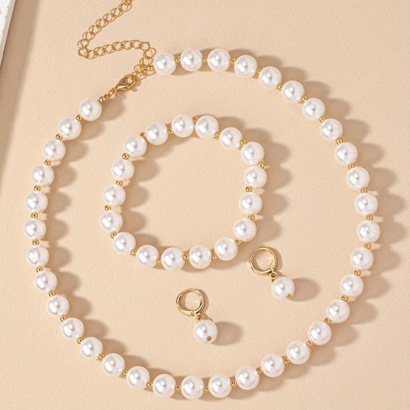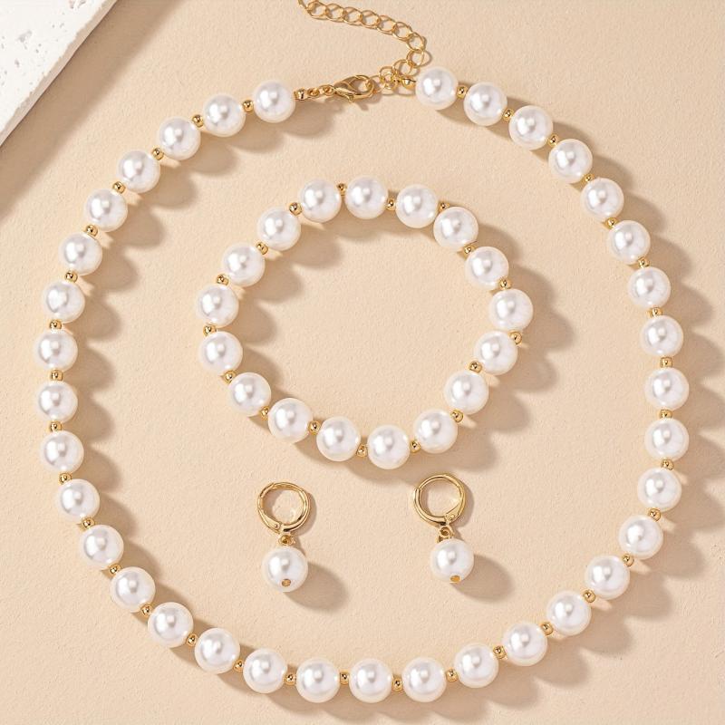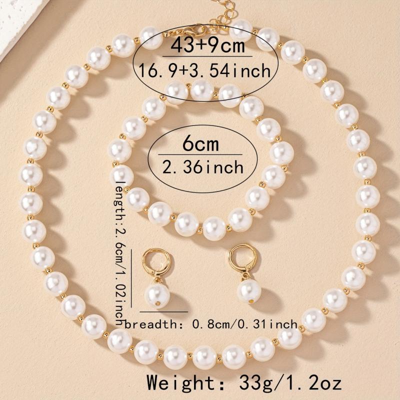 Complete your wedding look with this elegant jewelry set featuring faux pearl drop earrings, necklace, and bracelet. All pieces are 18k plated for a luxurious finish.
