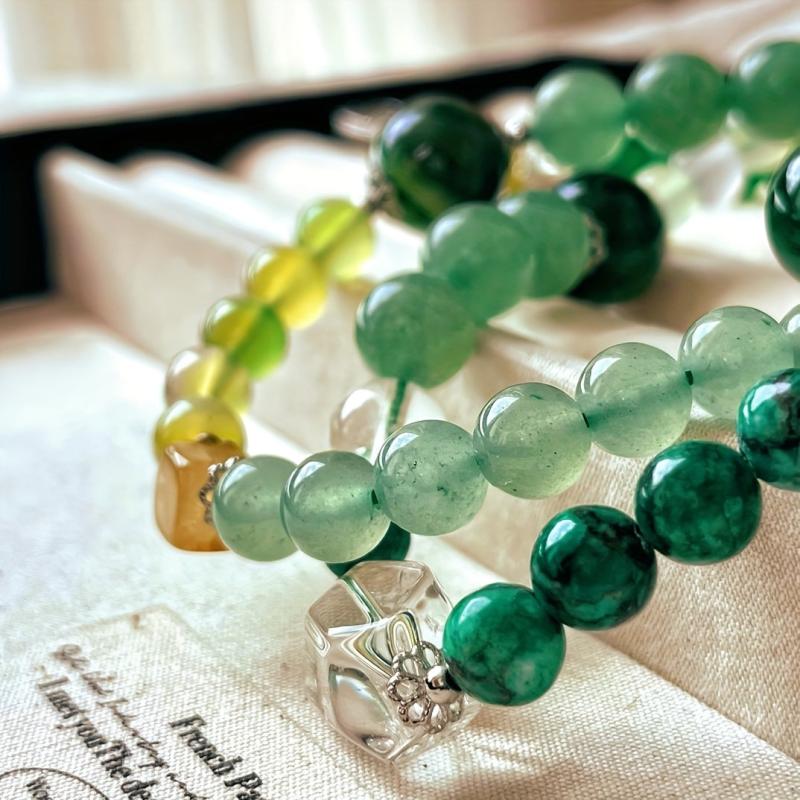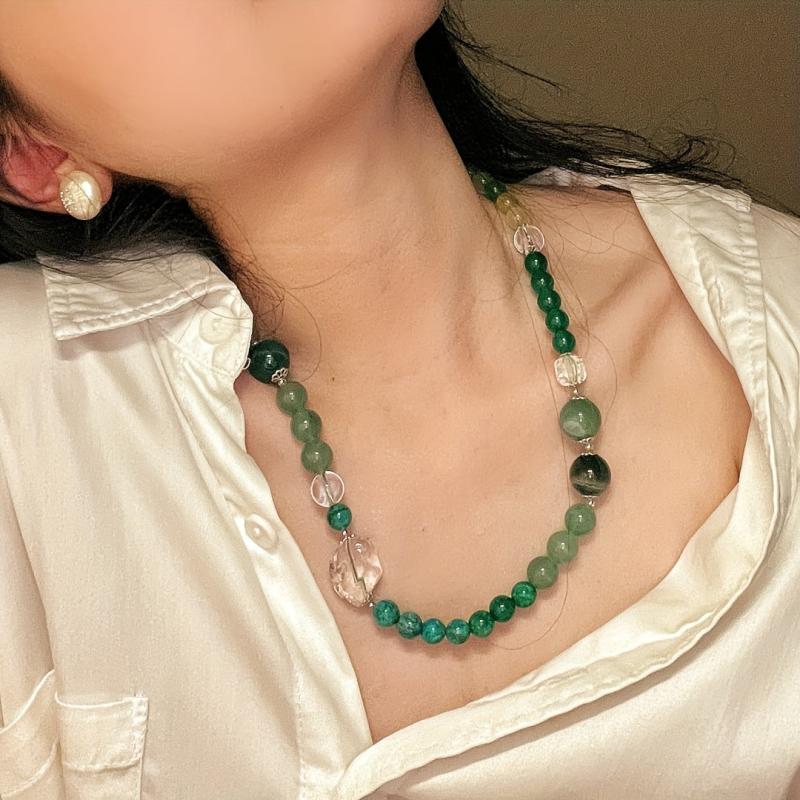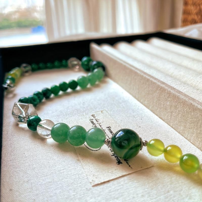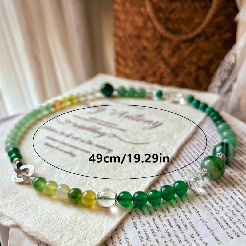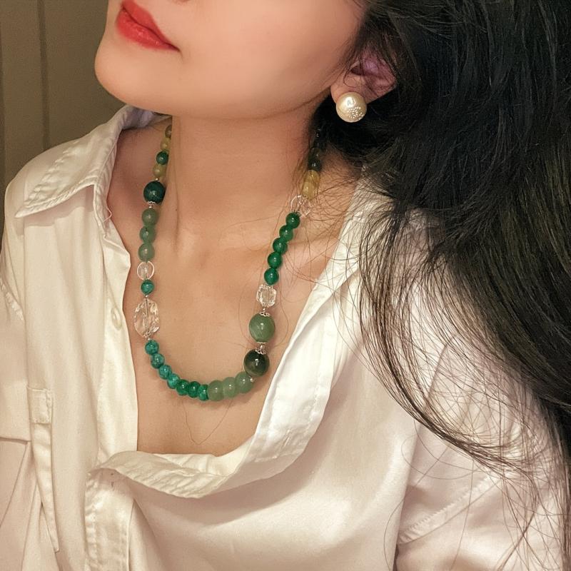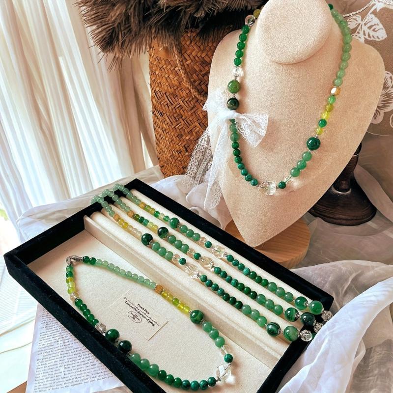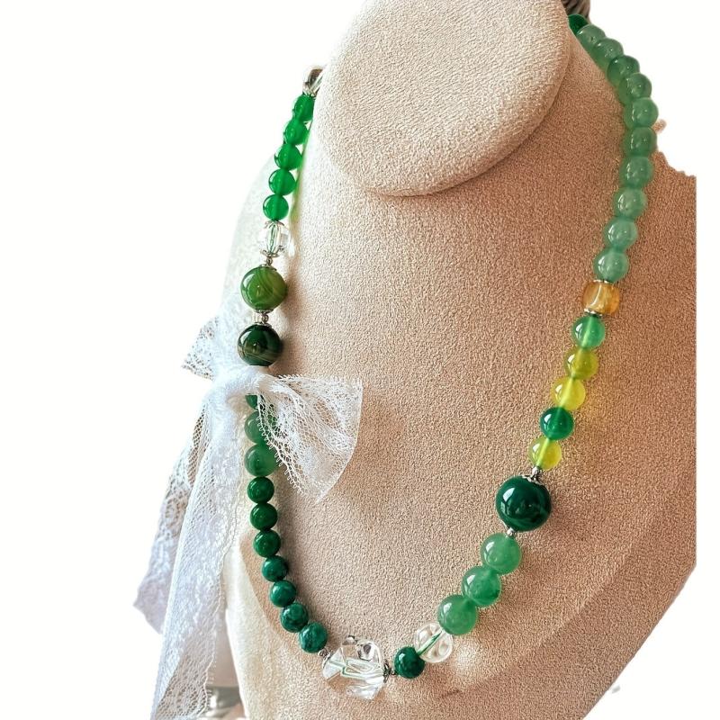 This vintage necklace features green bead stones with accents and a lace ribbon. A beautiful piece of French jewelry.