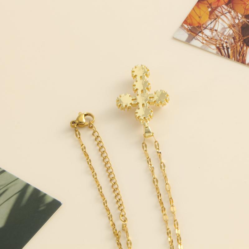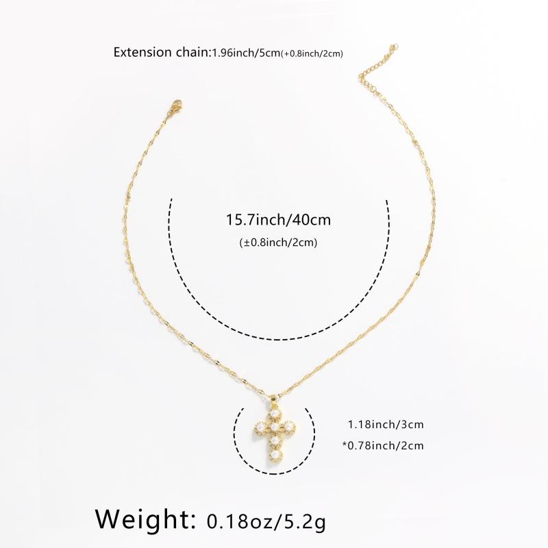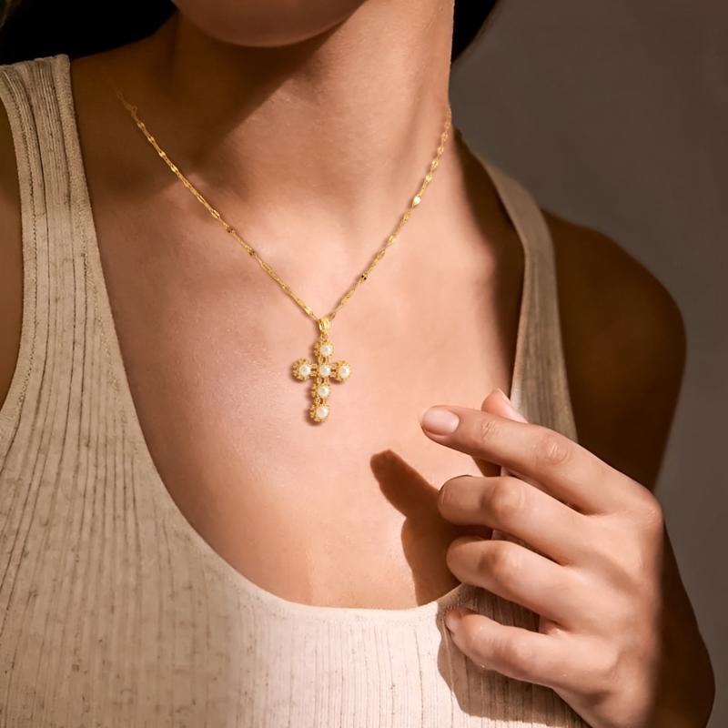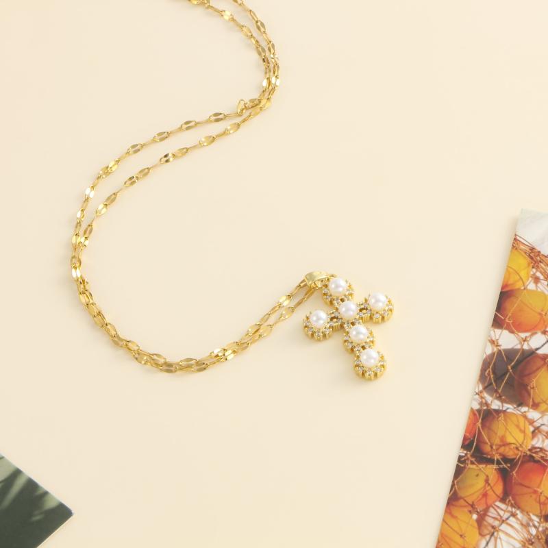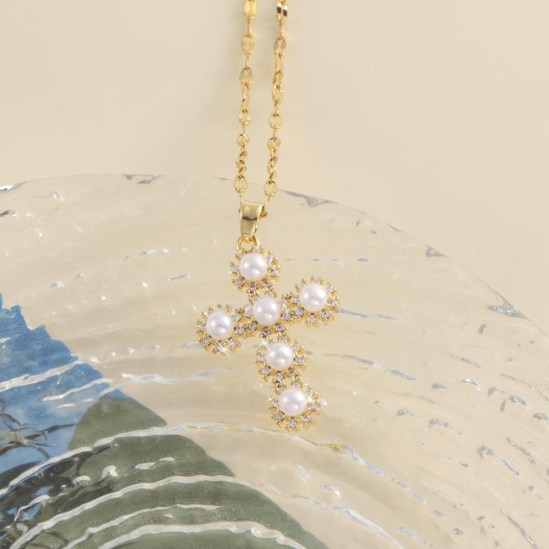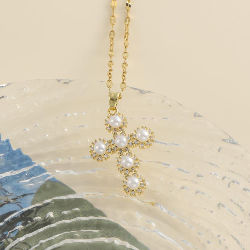 Elegant cross pendant necklace designed with faux pearls and synthetic zirconia in a French vintage style. Made of hypoallergenic stainless steel.