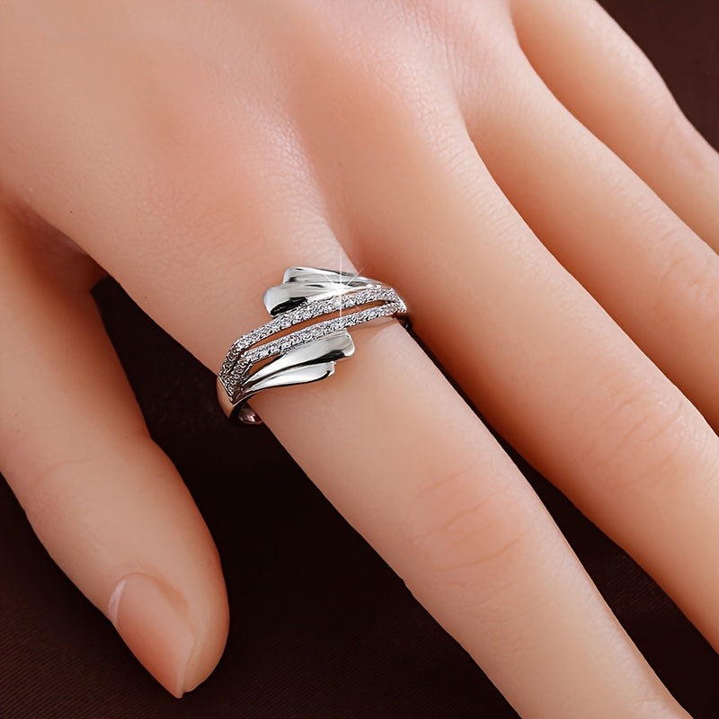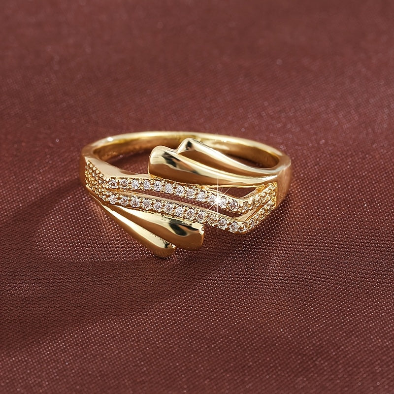 This stunning ring features a geometric folded cross design adorned with synthetic zirconia stones. It is golden plated and perfect for daily wear or as a gift.