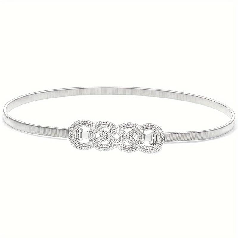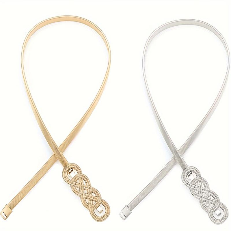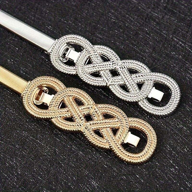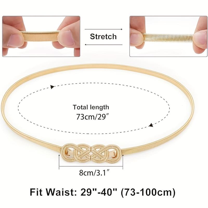 This stylish elastic waist belt features a geometric golden buckle in a sleek silvery color, perfect for adding a touch of glamour to any outfit.