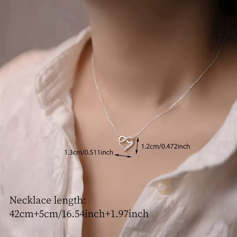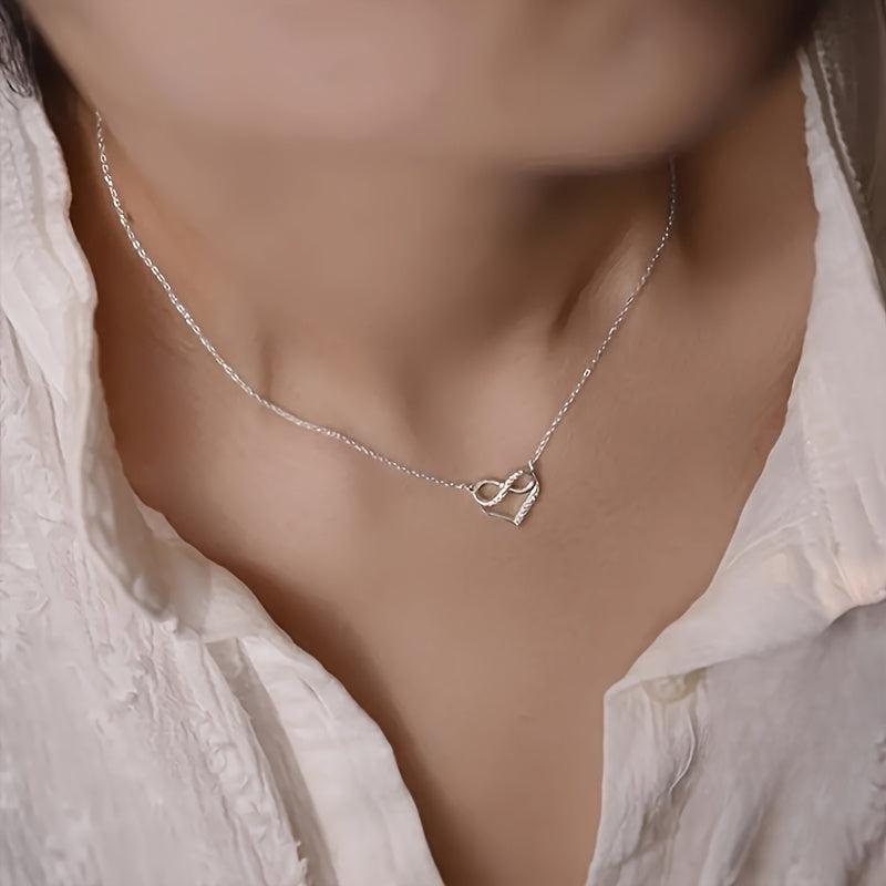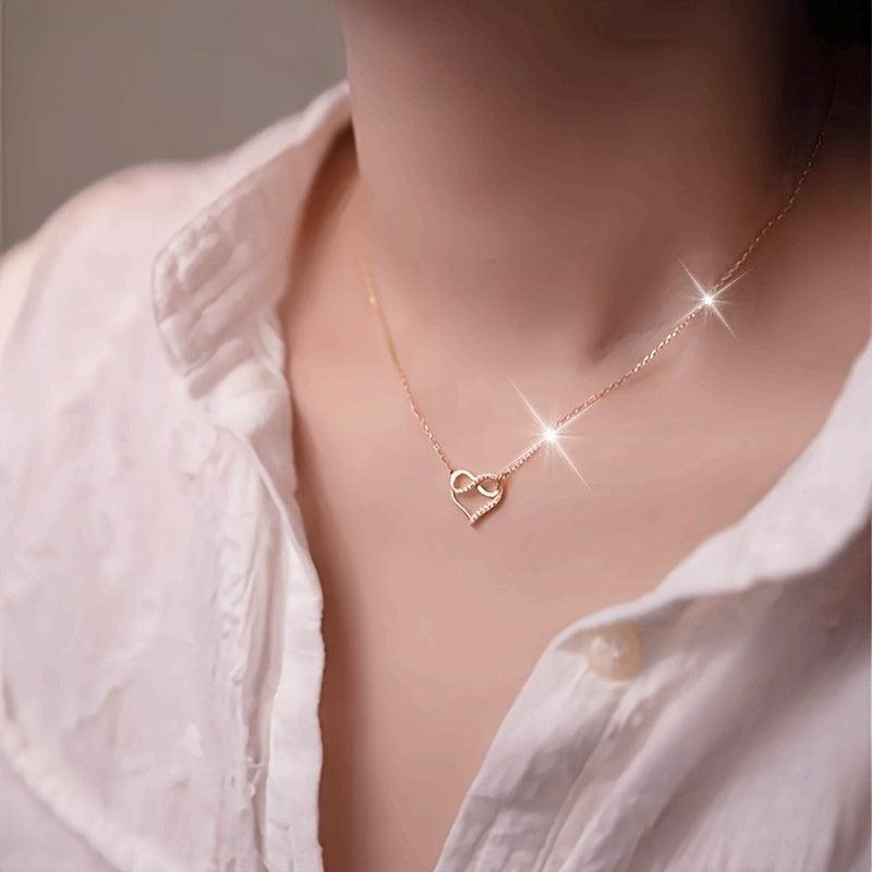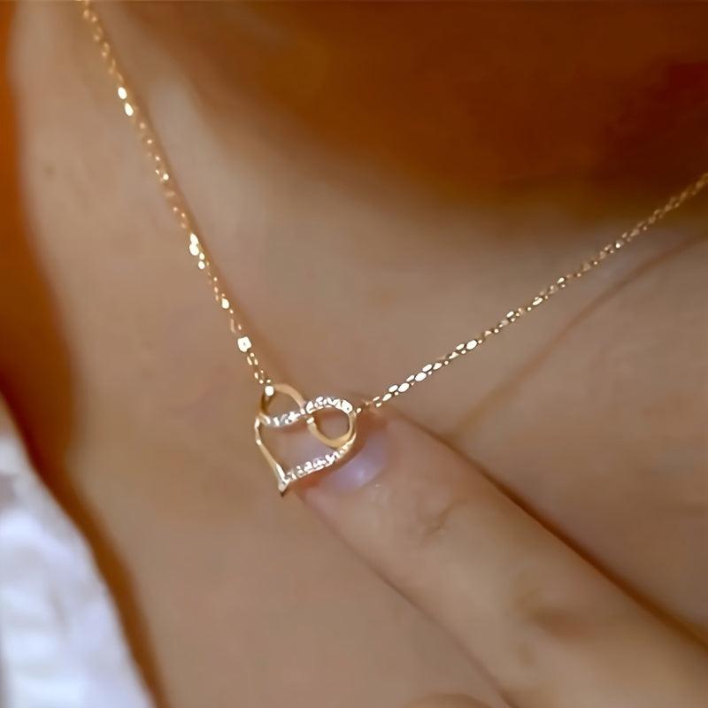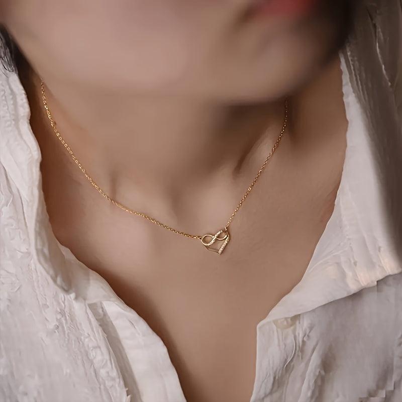 Elegant and stylish heart pendant necklace featuring zirconia stones in a golden tone infinity loop design, perfect for adding a touch of sparkle to any outfit.