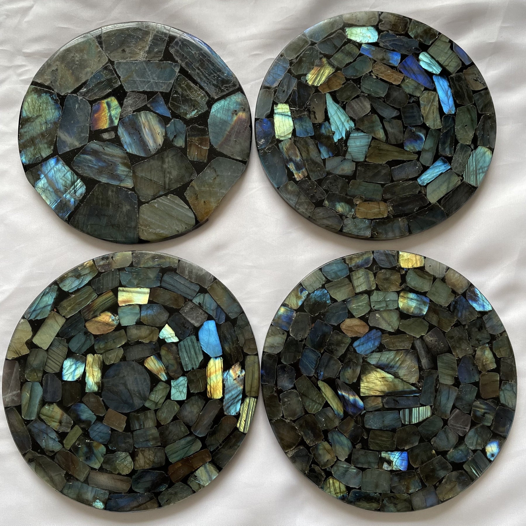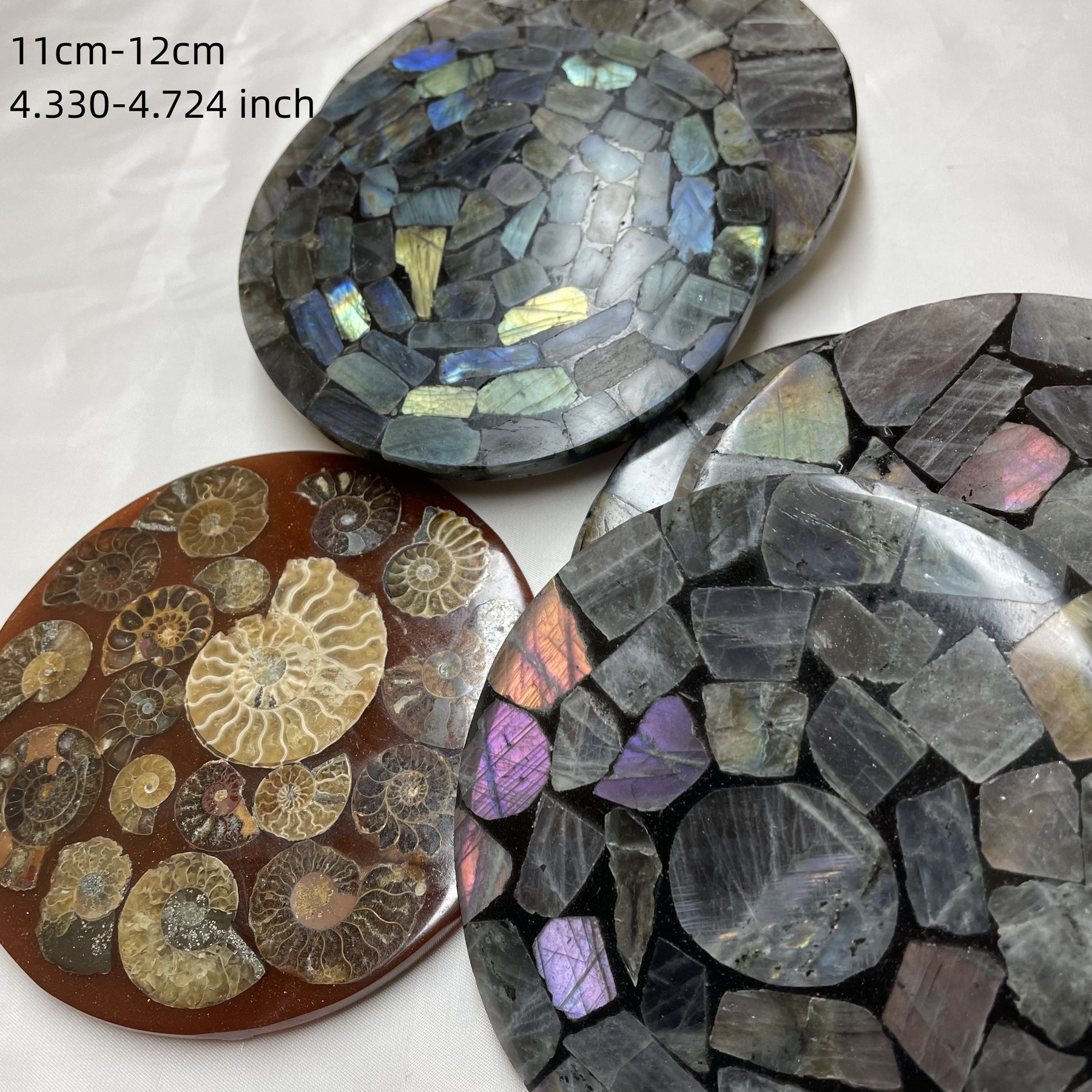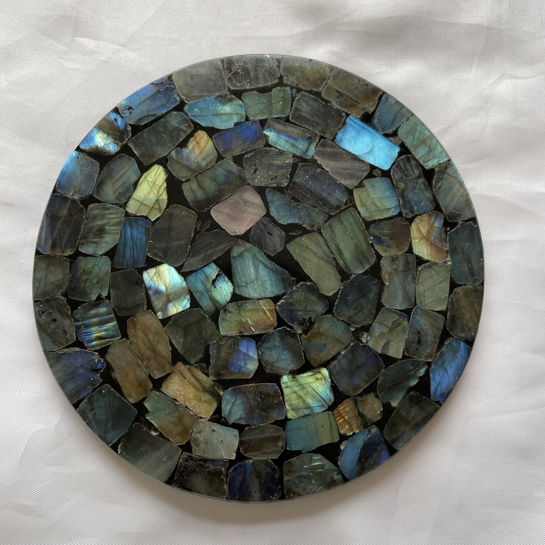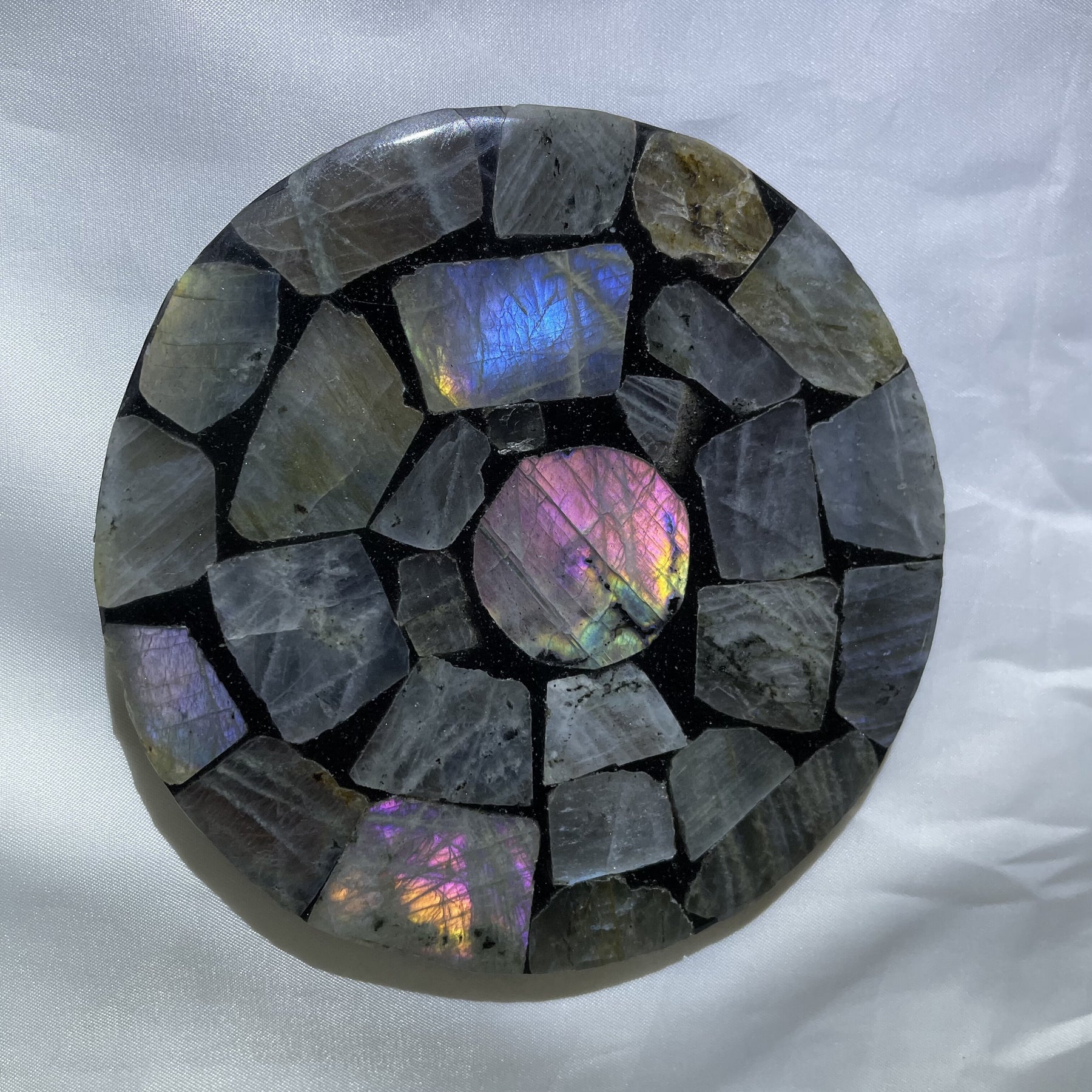 Elevate your space with this stunning crystal home decoration. The Labradorite disc and Crystal Quartz conch will add a touch of elegance to your home or office. Enhance your bedroom or living room with these glittering crystals.
