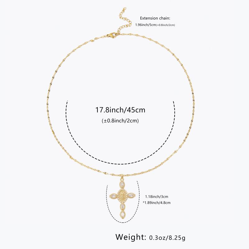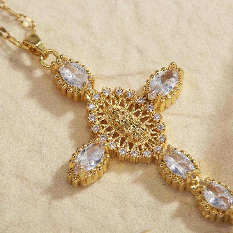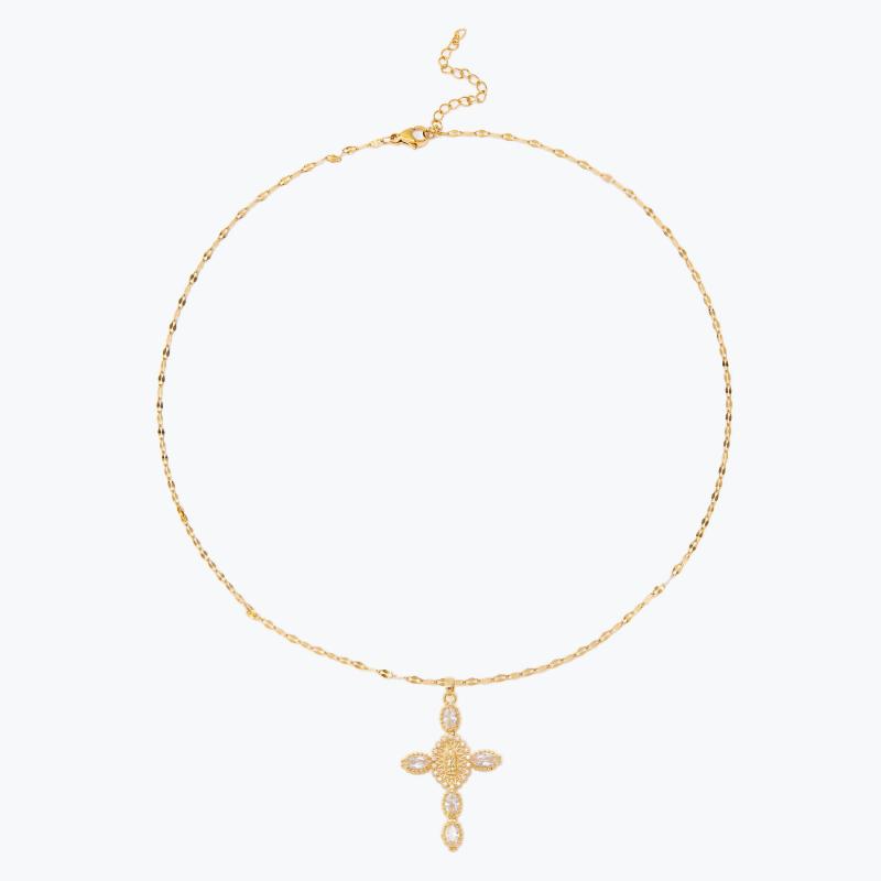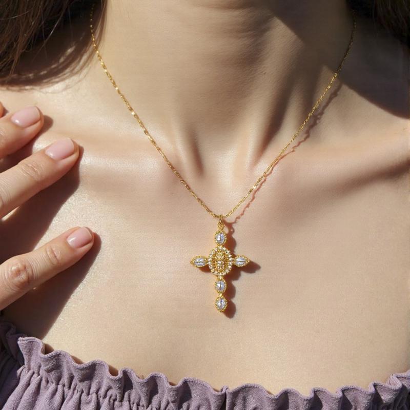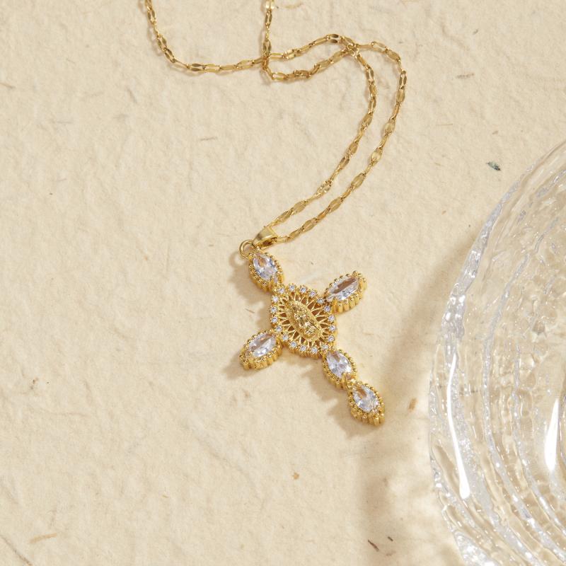 Elegant and hypoallergenic cross pendant necklace with synthetic gemstones. This versatile jewelry piece is perfect for everyday wear or special occasions.