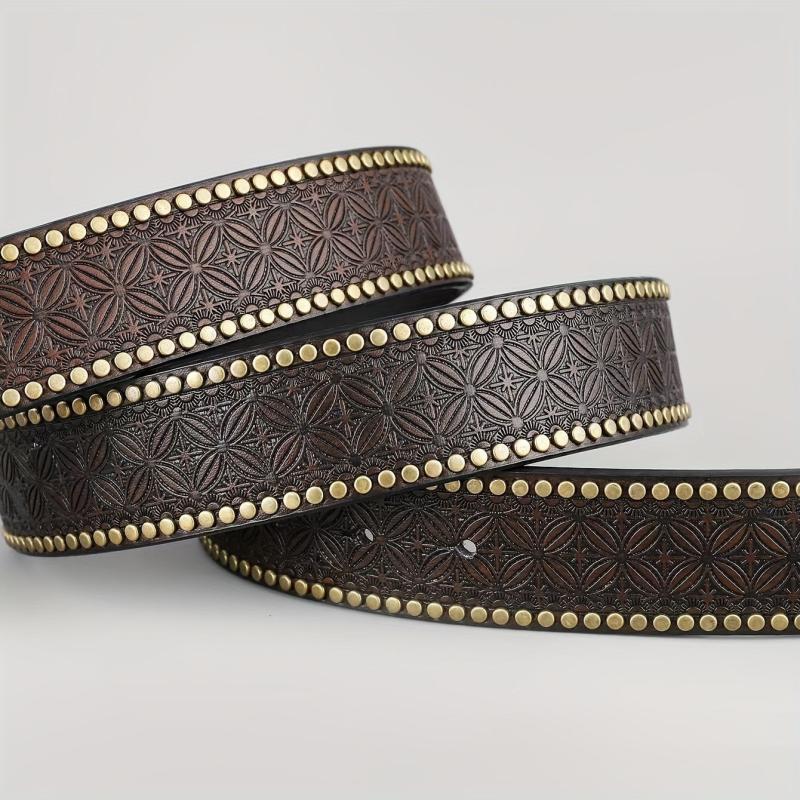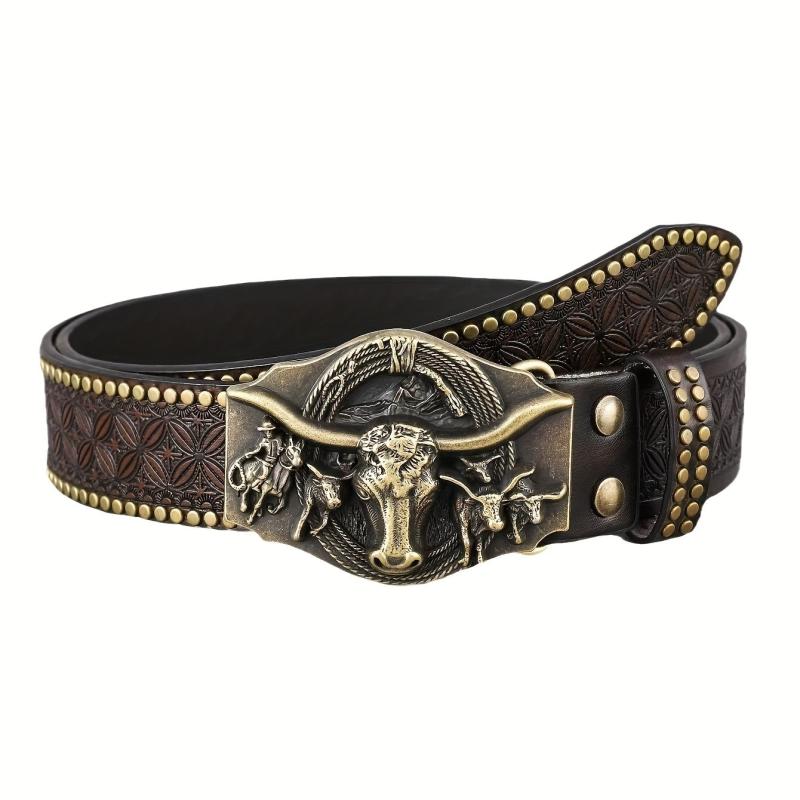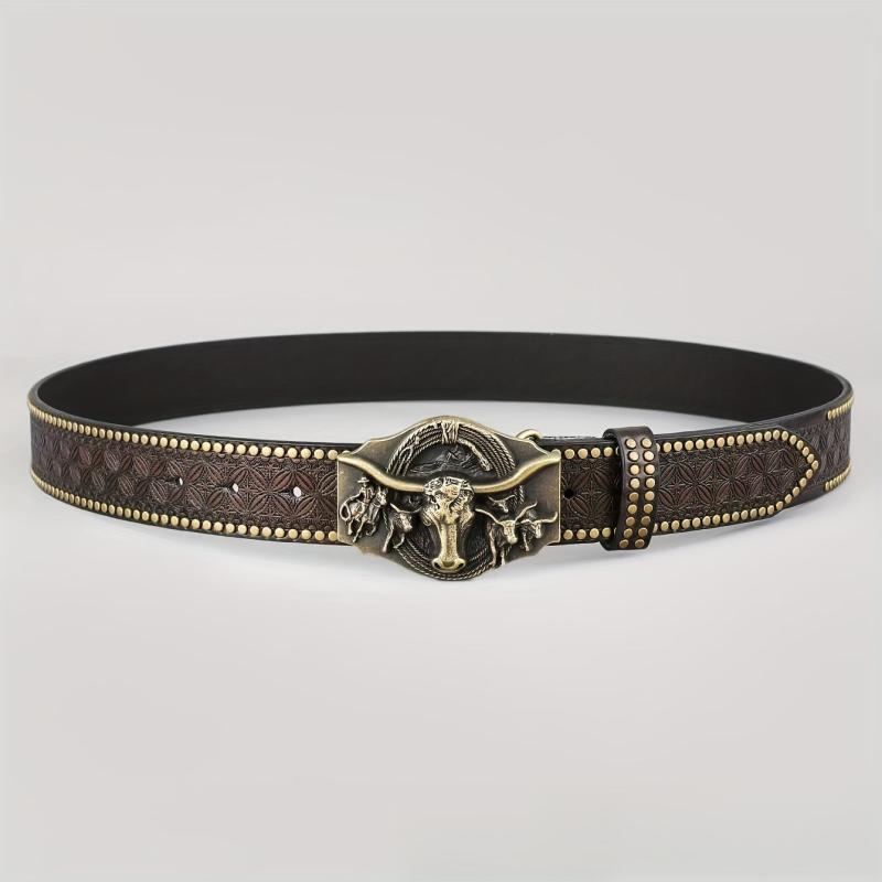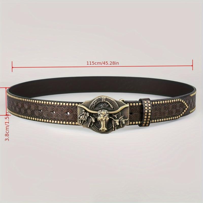 Add a touch of Western cowboy style to your outfit with this men's distressed vintage punk embossed belt. The large bull head buckle and rivet accents create a rugged yet fashionable look that's perfect for casual wear.