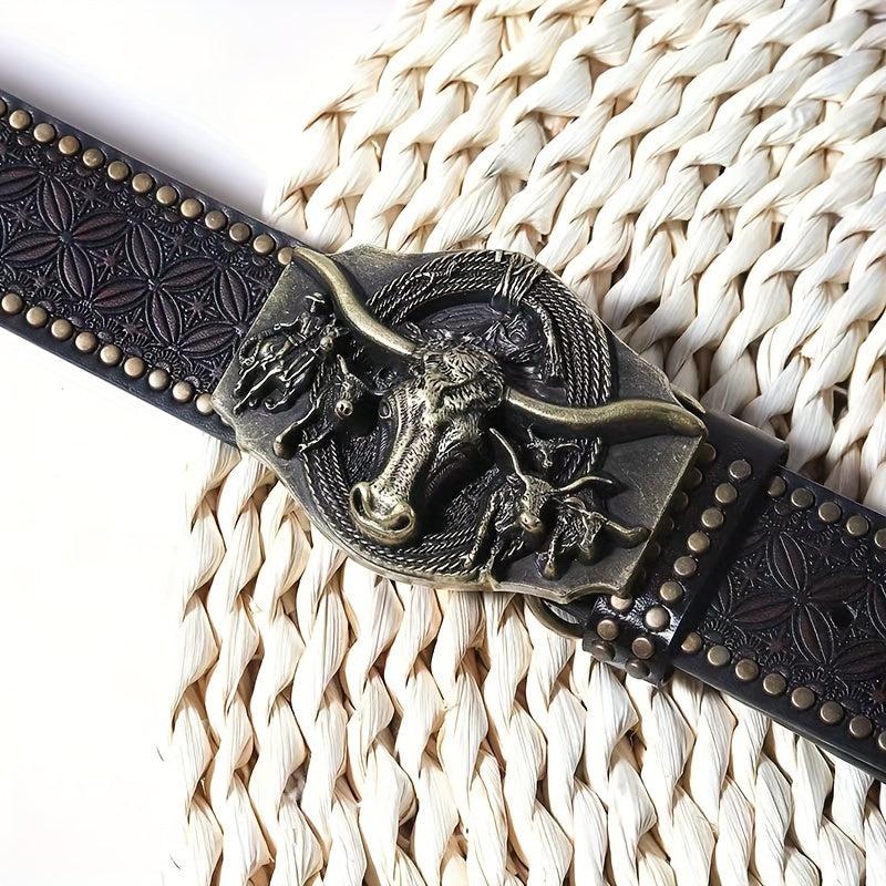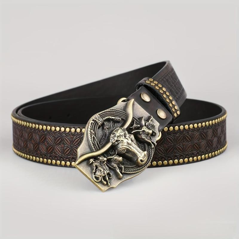 Men's Distressed Vintage Punk Embossed Belt with Bull Head Buckle
